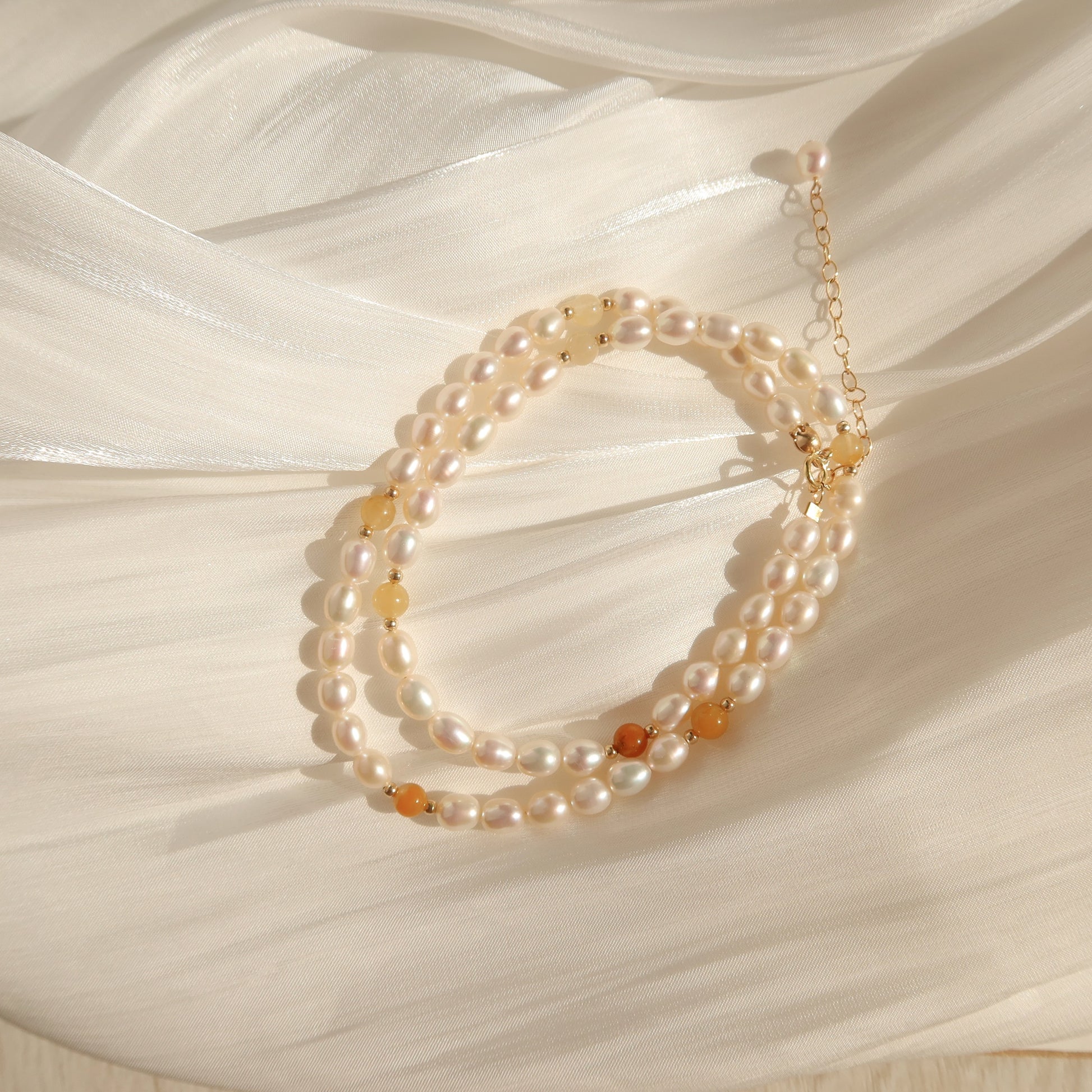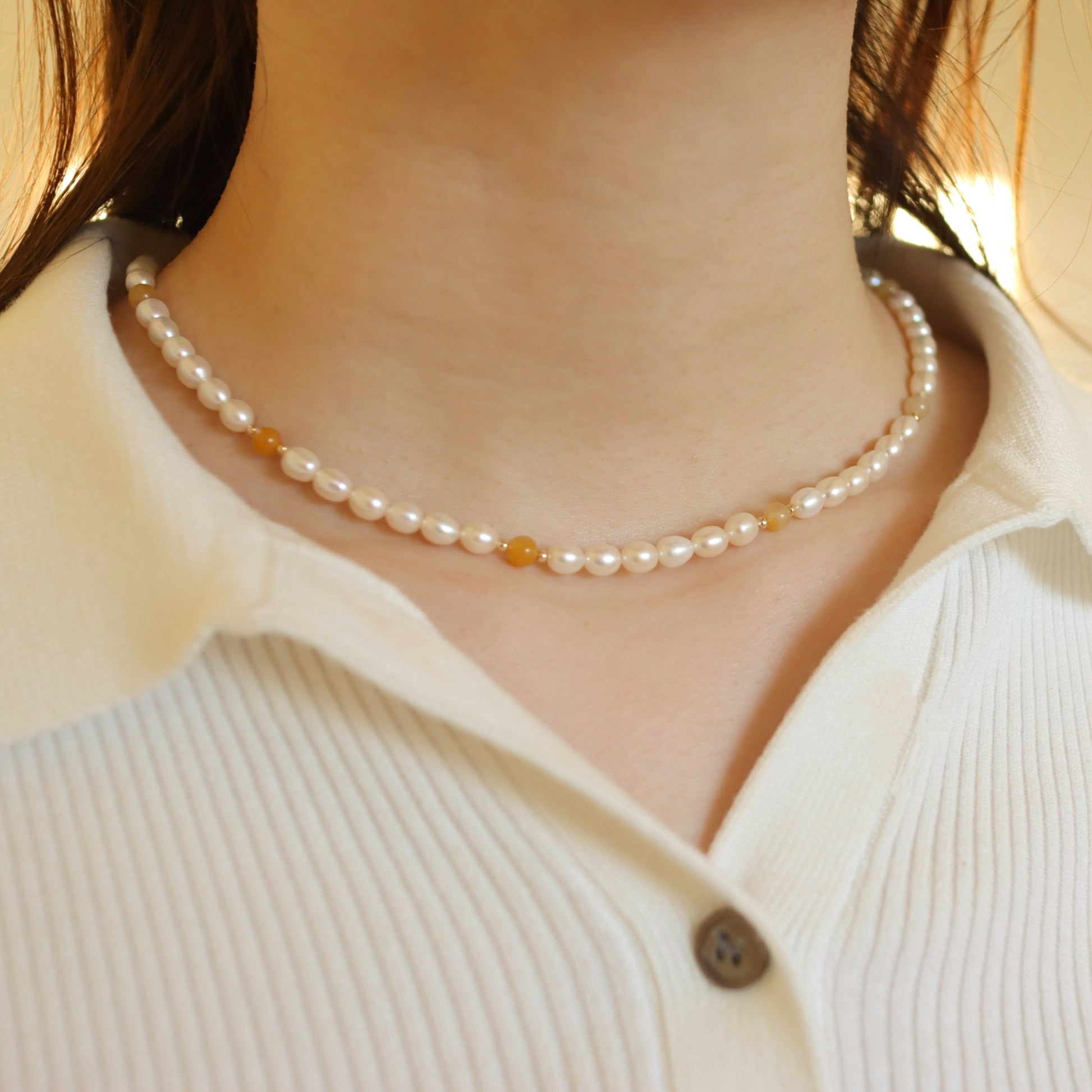 Dawn necklace is handcrafted with freshwater pearls and yellow jade beads. Yellow jade is a stone of wisdom and enthusiasm, it’ll bring energies of self-confidence, courage and tranquility. She’s a perfect necklace for layering up too.