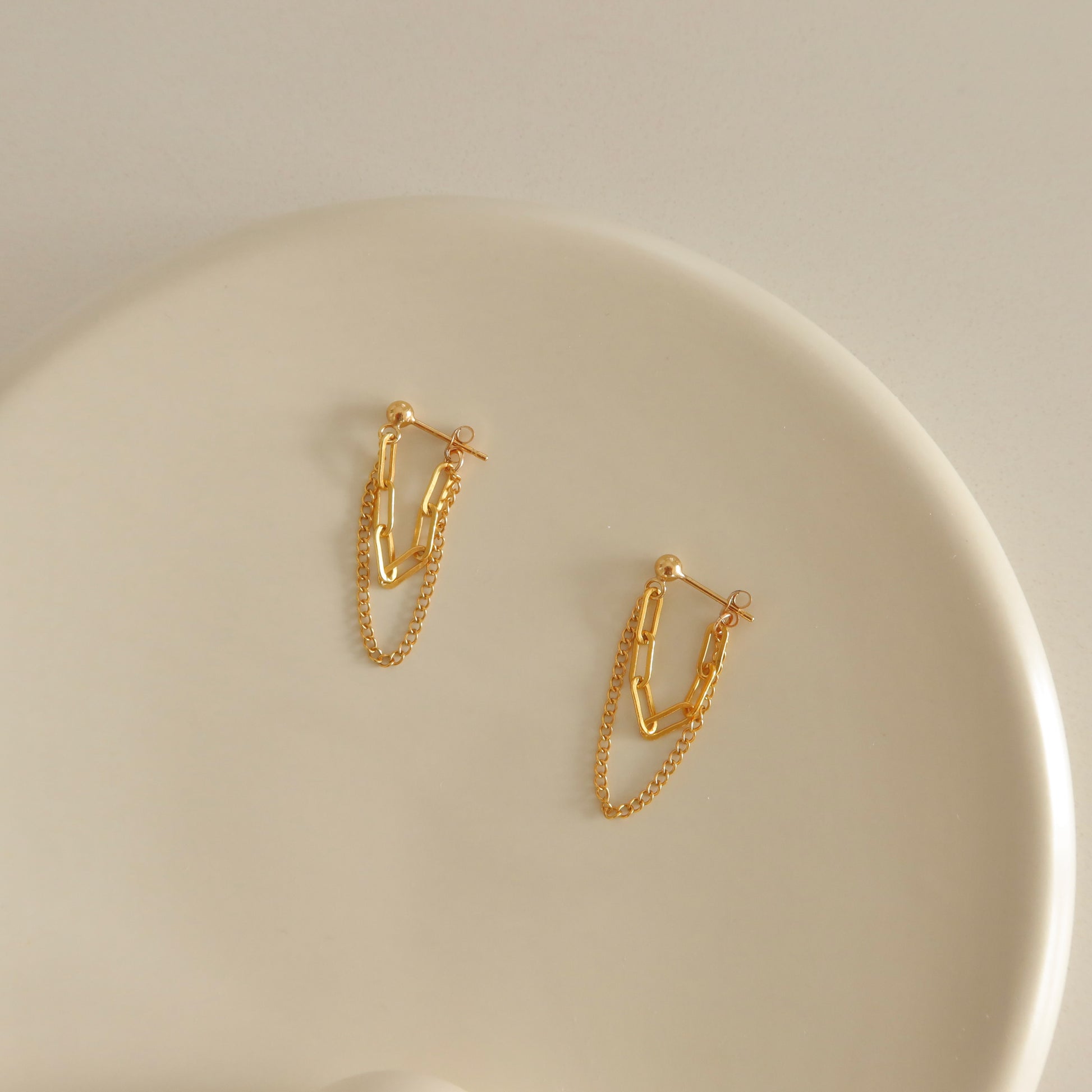 This Double Chain Earring is a modern and simple piece that goes with any outfit. Made with 14k gold filled material that is going to last for years and safe for sensitive skin.