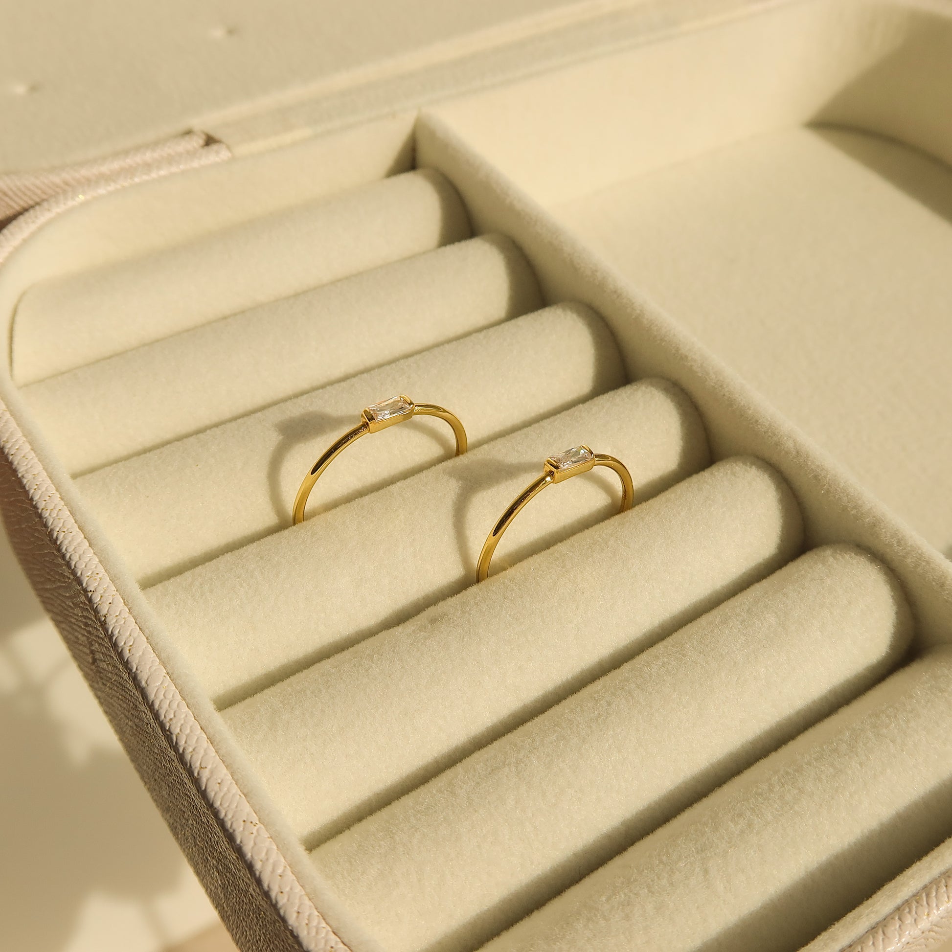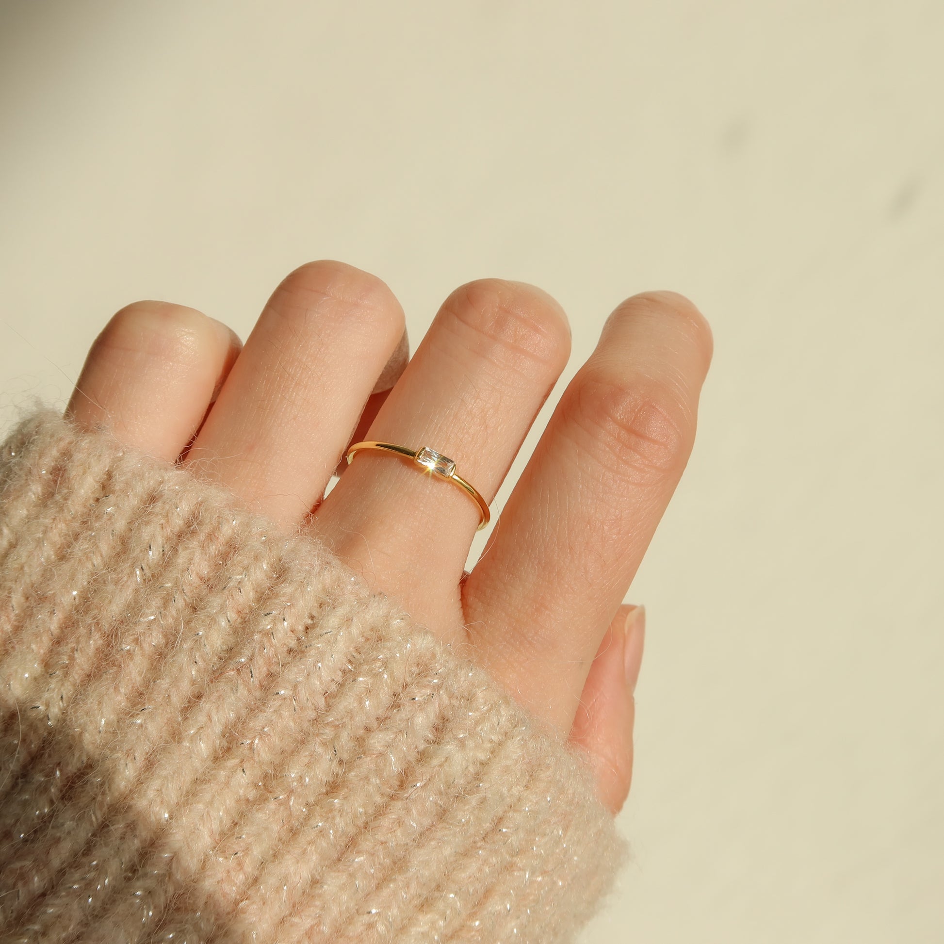 Maggie is a single band ring with a baguette-cut cubic zirconia stone. This dainty but shiny ring is perfect for daily wear with your minimalist outfits. She's truly a subtle elegant piece that looks delicate on its own or stunning to stack with.