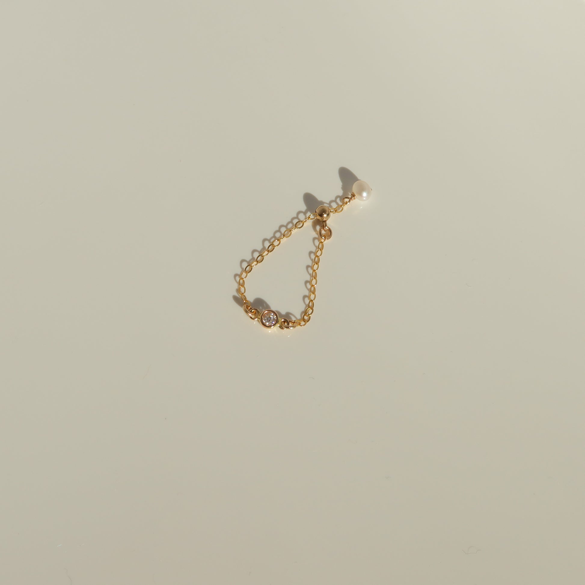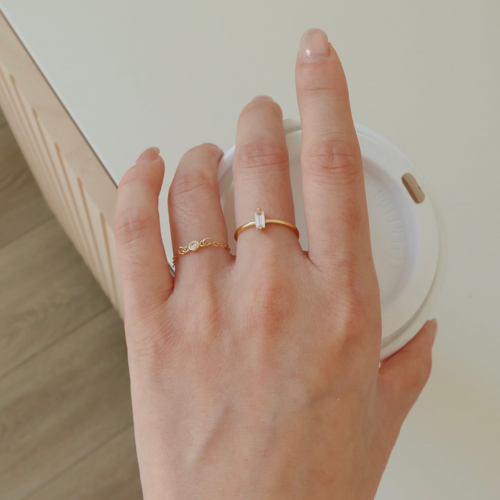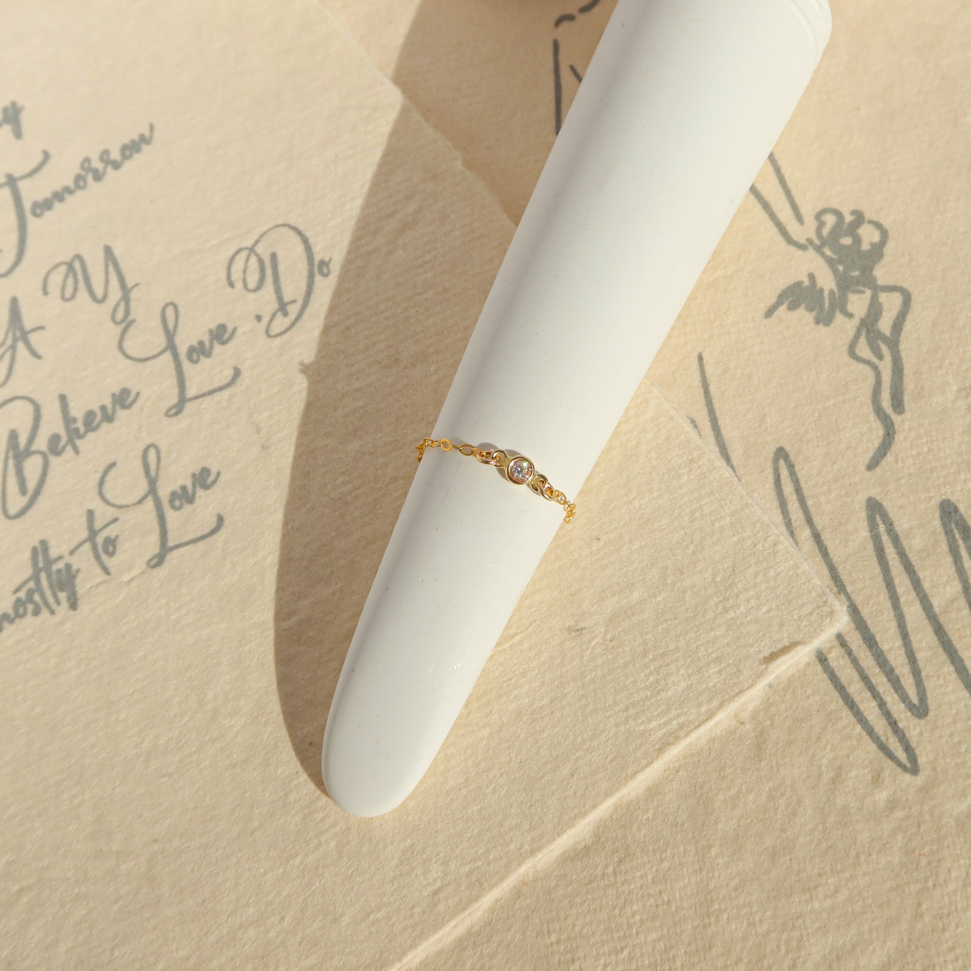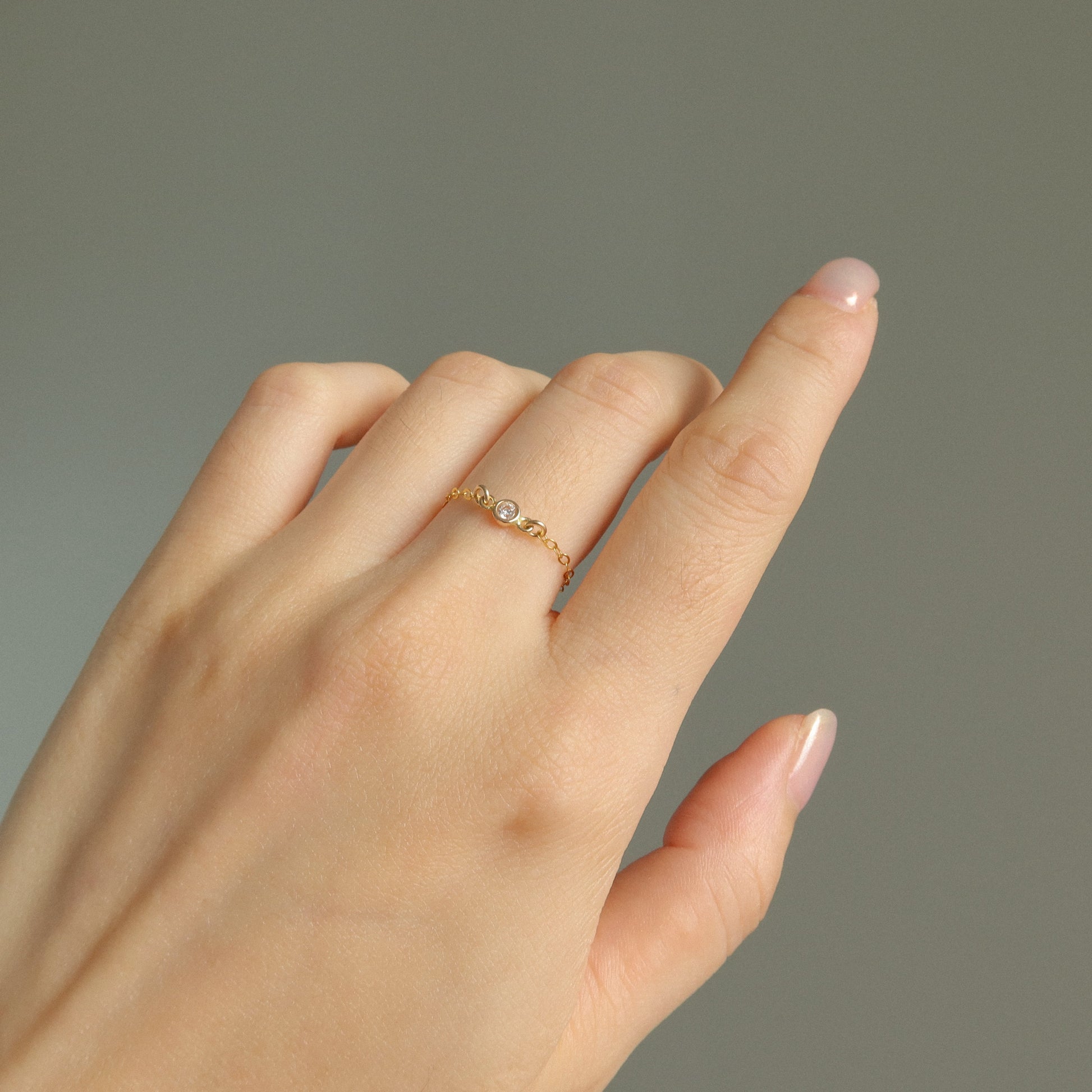 A dainty chain ring featuring a sparkle CZ stone. Easily adjust the size with the spacer. Its delicacy makes it a perfect choice for a pinky ring.
