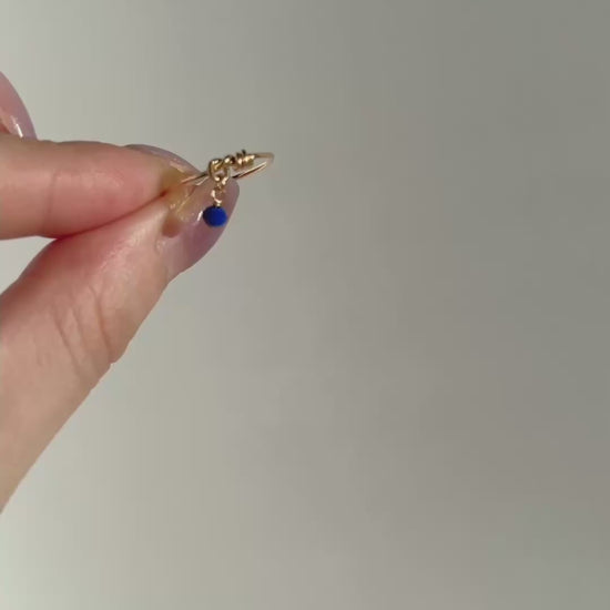 Gabi is a dainty ring, carefully handcrafted from 14k gold-filled wire. It features a exquisite knotted design and offers three gemstone options that dangle from the band. It will be a delicate addition to your ring stack.