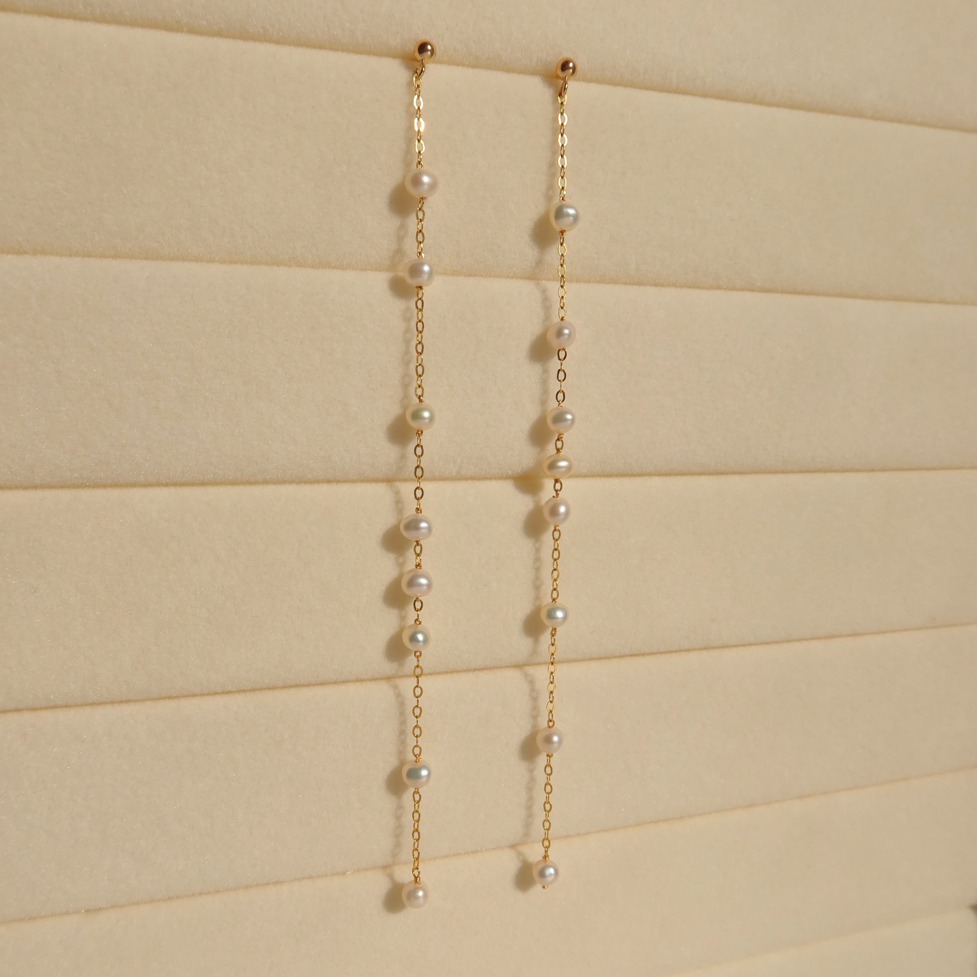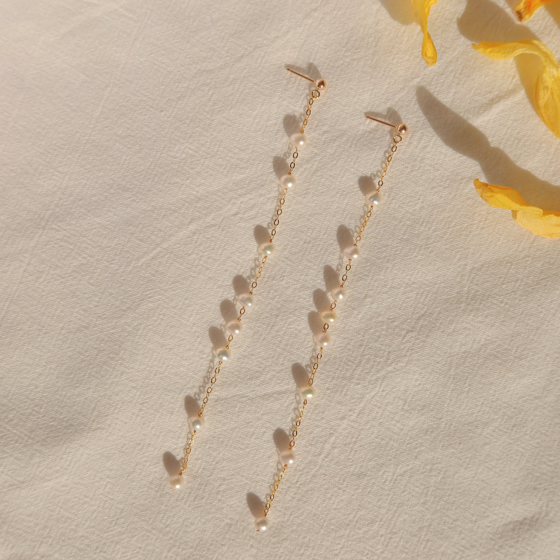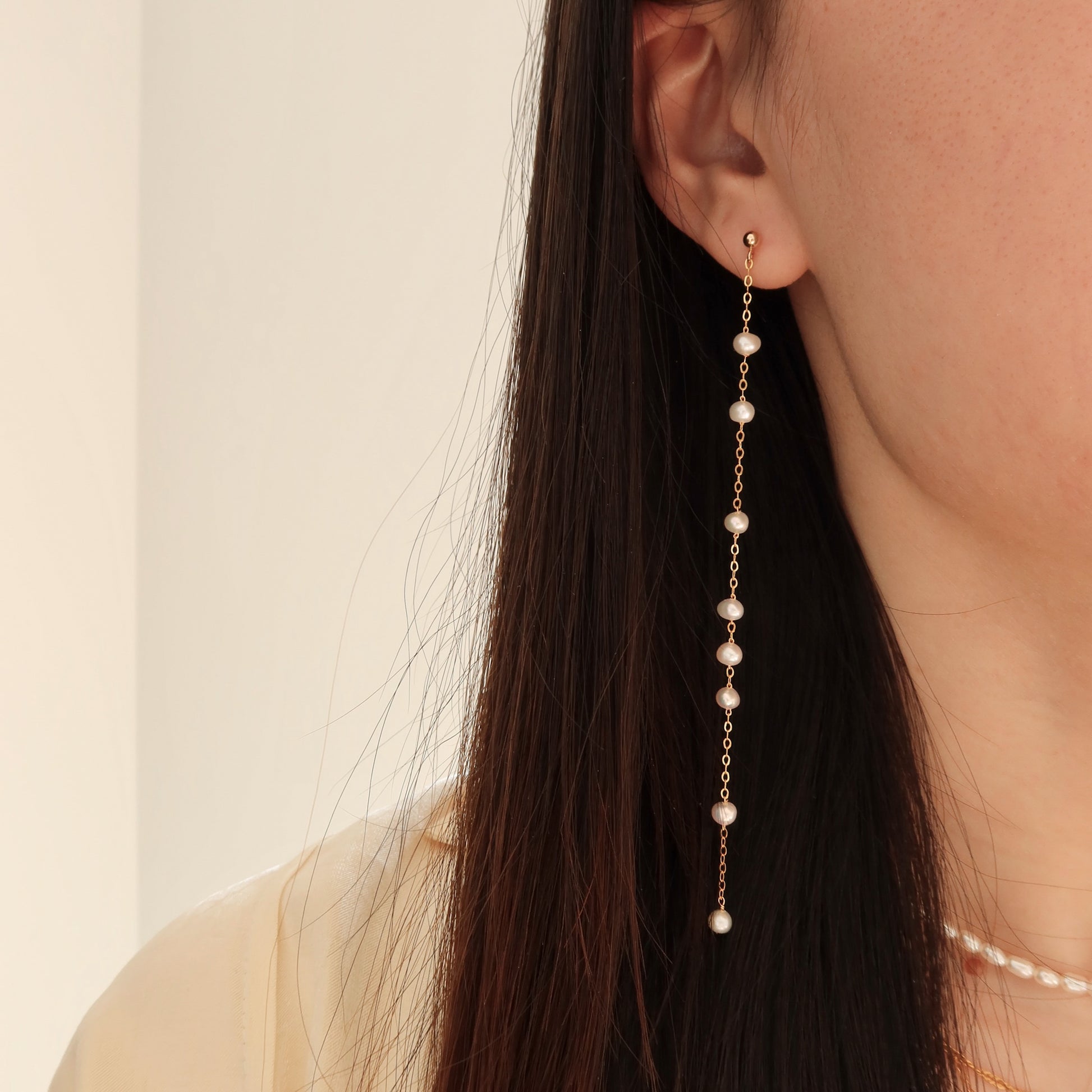 A pair of long dangle earrings with an asymmetrical design. She's feminine and delicate, sure to catch everyone's eyes. PS: These made the most gorgeous wedding earring as well!