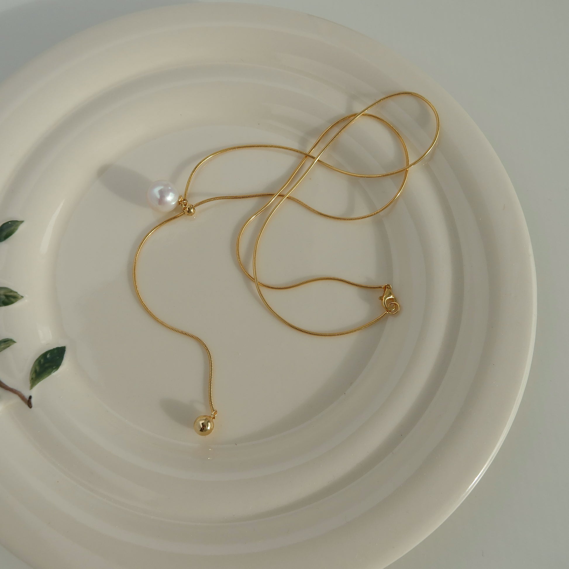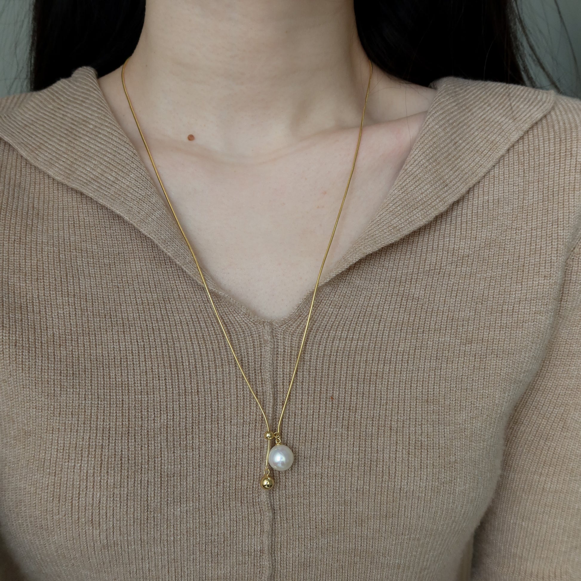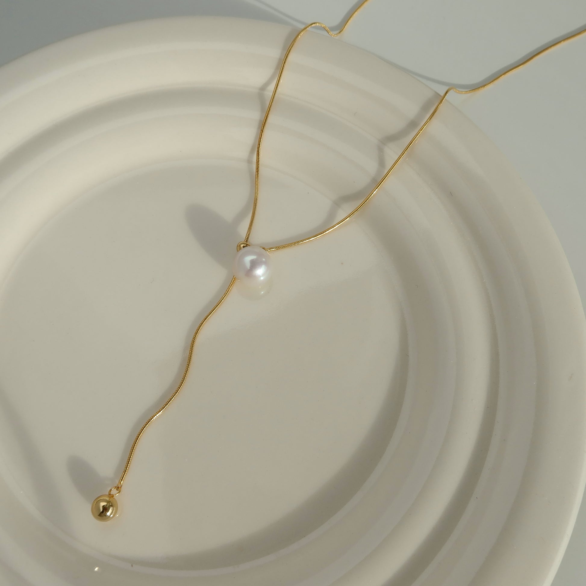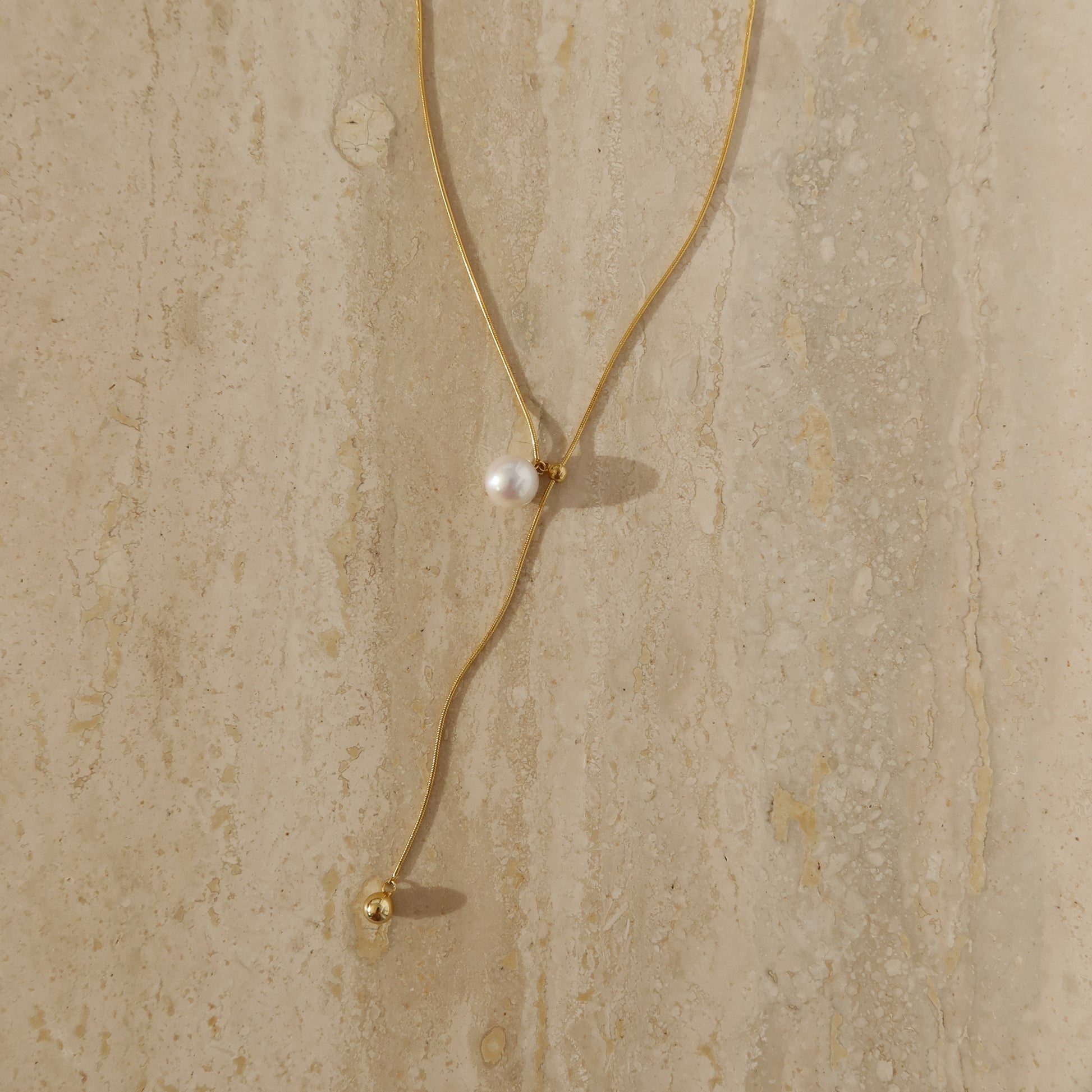 The Leila lariat necklace features an elegant large pearl and a gold ball suspended on a luminous snake chain that gleams with every movement.