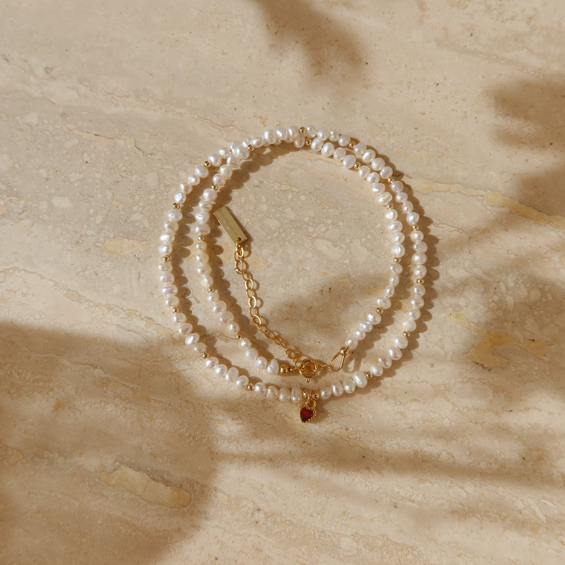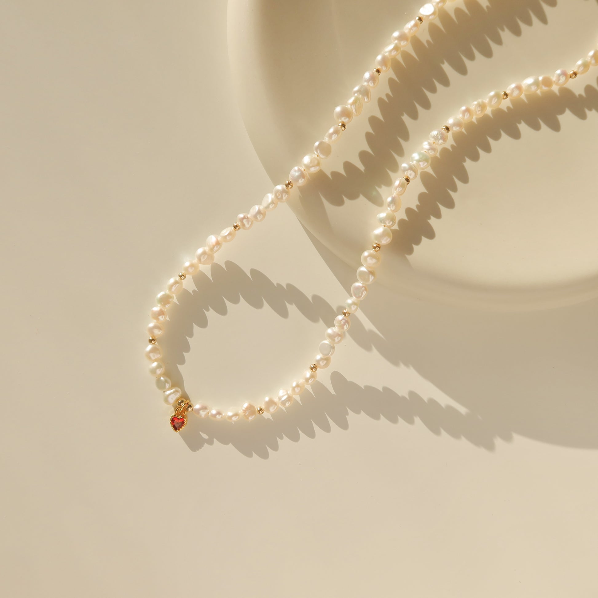 A classic pearl choker with lots of love. Handmade with mini baroque pearls which are unique and retro. The Ruby heart cz pendant adds a romantic touch to this simple pearl necklace. Treat yourself or surprise her with this meaningful piece.