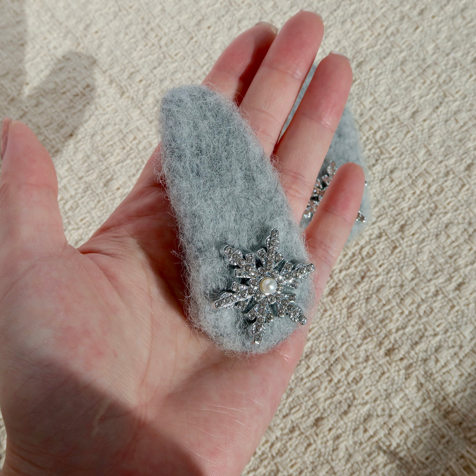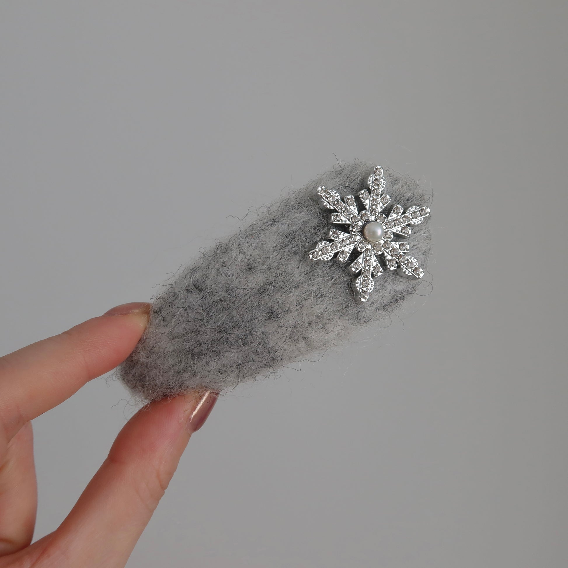 A cute accessory for this winter crafted from soft fluffy felt and a sparkly snowflake and adorned with a shimmering pearl-accented snowflake. Easily removes without creasing or snagging hair, making them as practical as they are pretty.