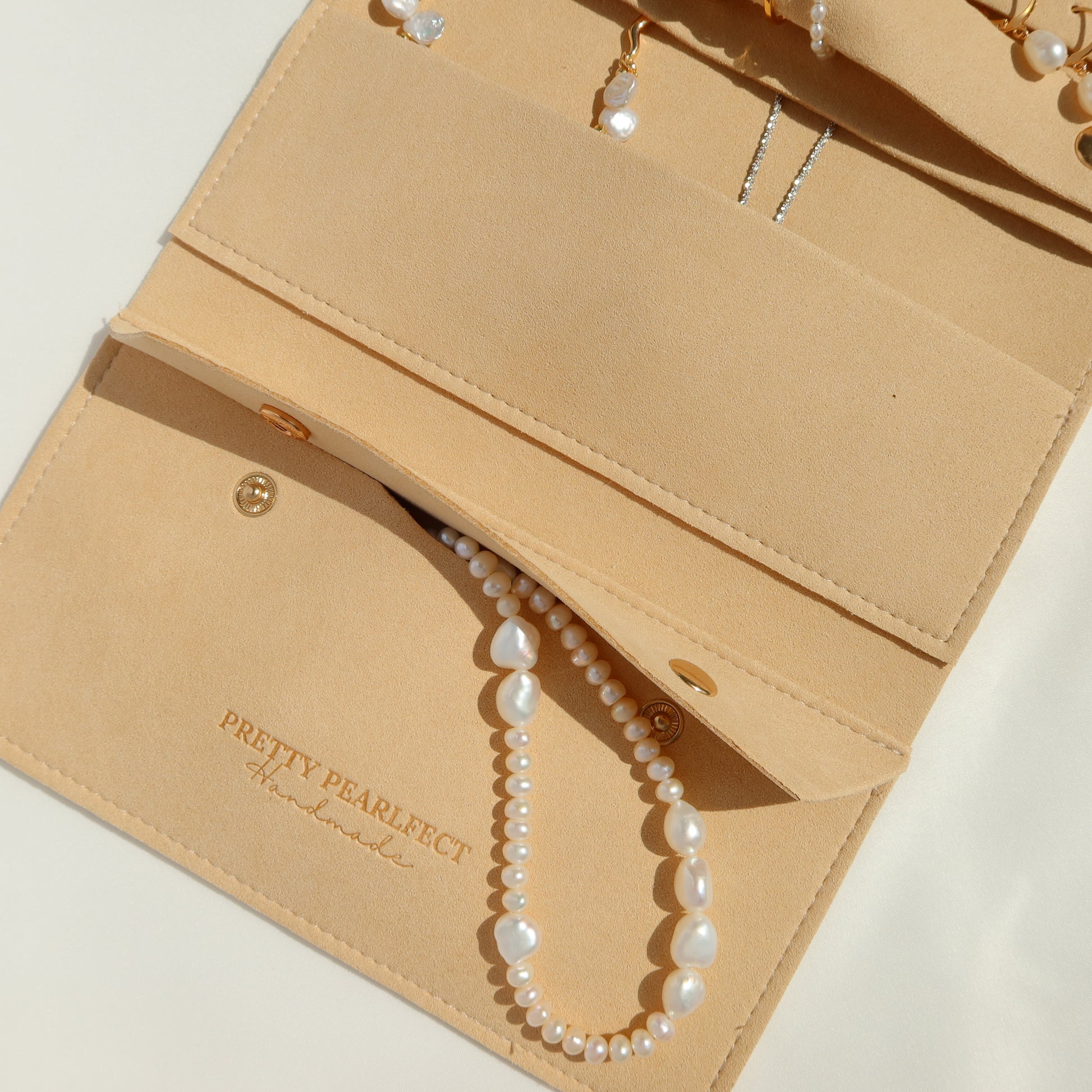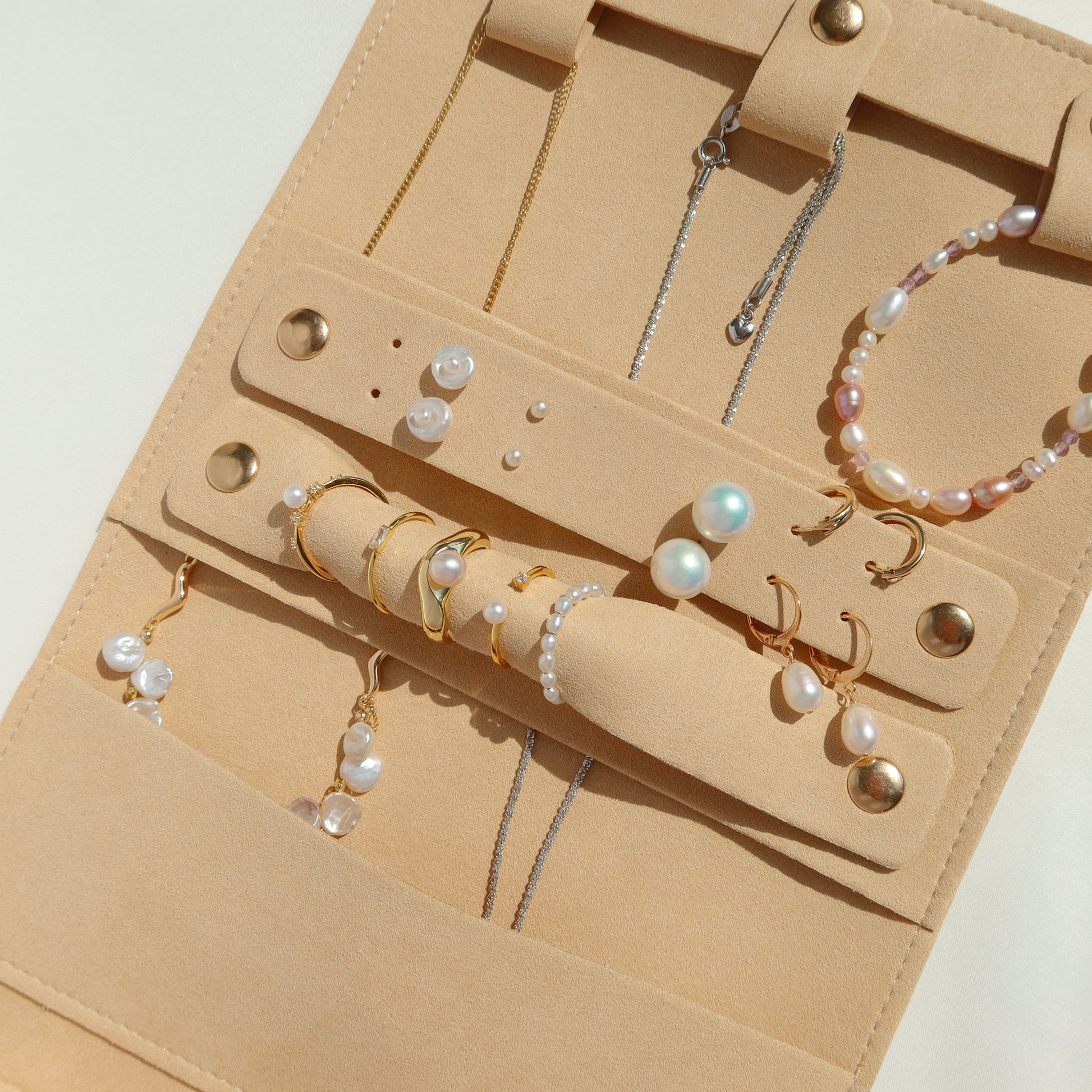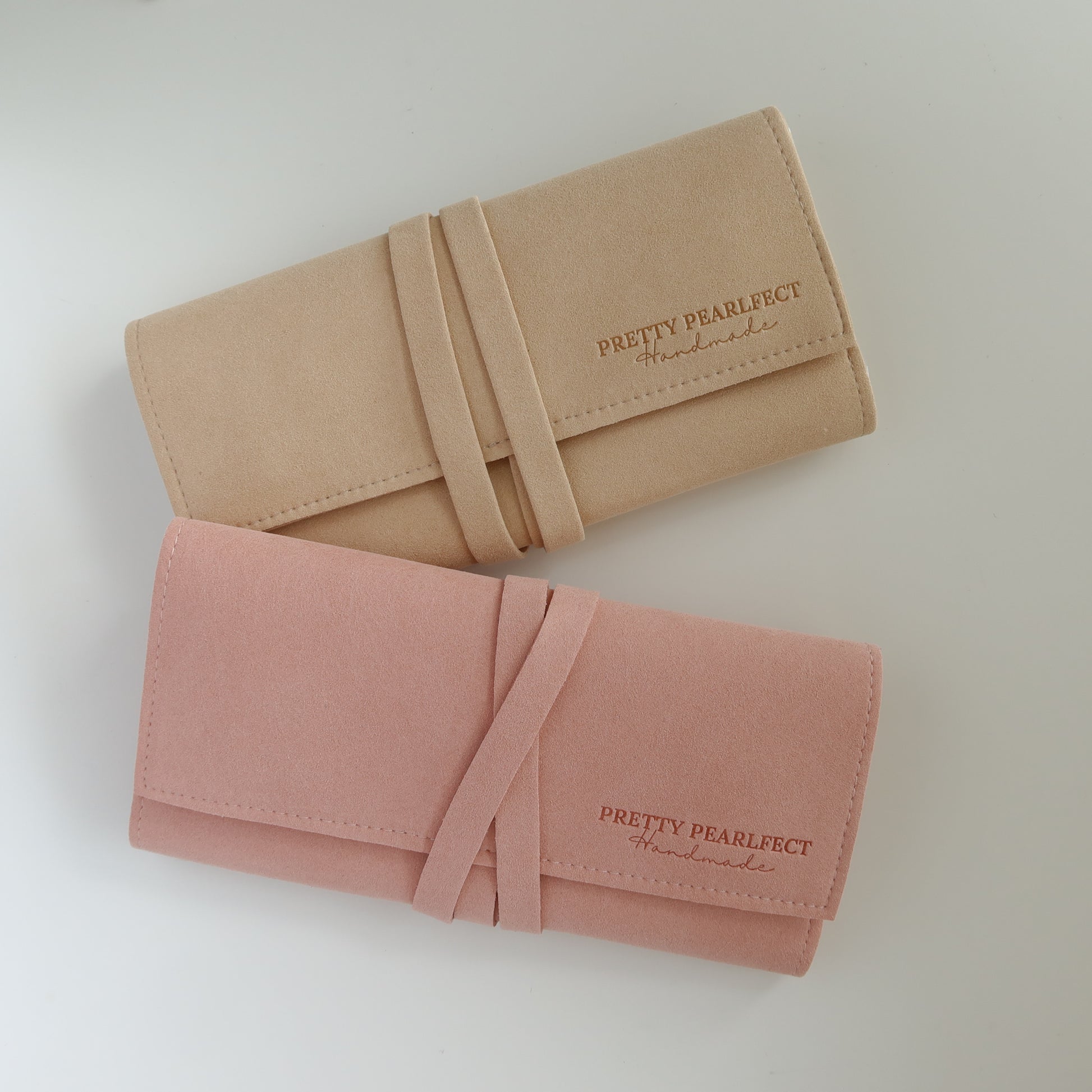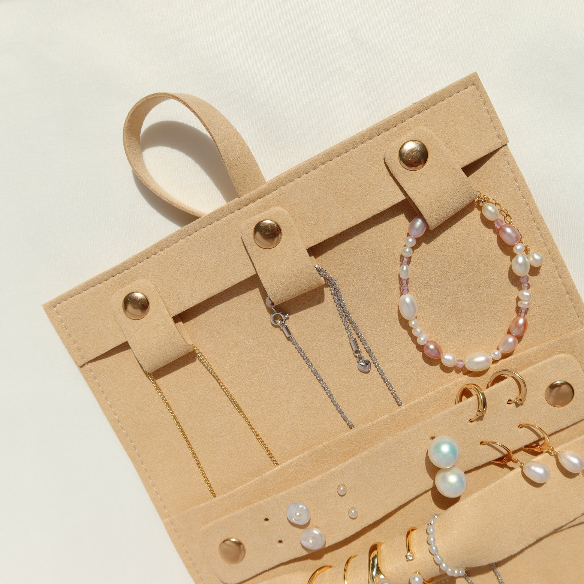 Get ready to travel in style with this compact jewelry bag! The separate compartments provide a secure and organized way to store your jewelry, and the snap closures make it easy to access each compartment. Plus, the roll-up design allows for convenient storage in your bag. No matter where your travels take you, this jewelry bag will be your go-to companion for accessorizing on the go.