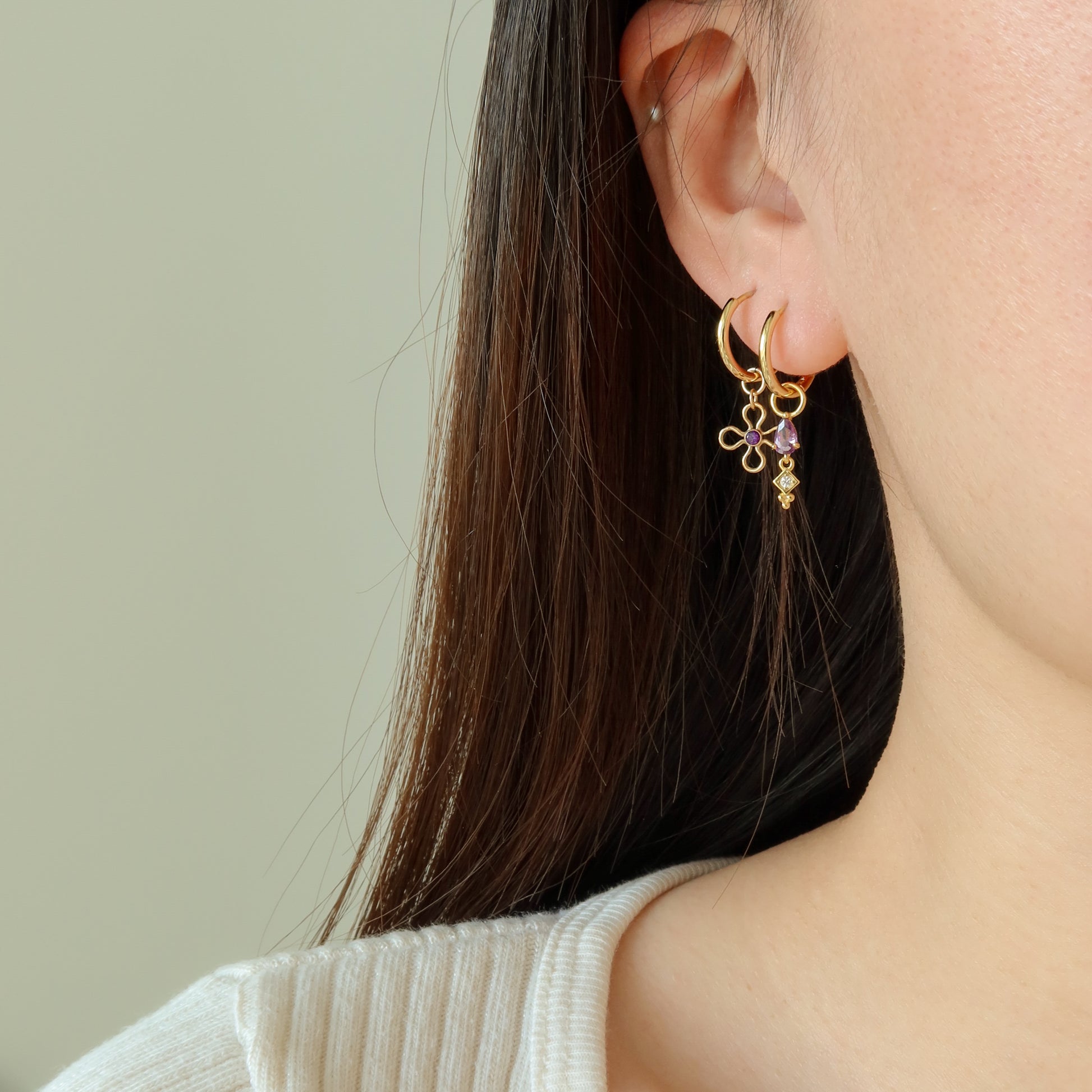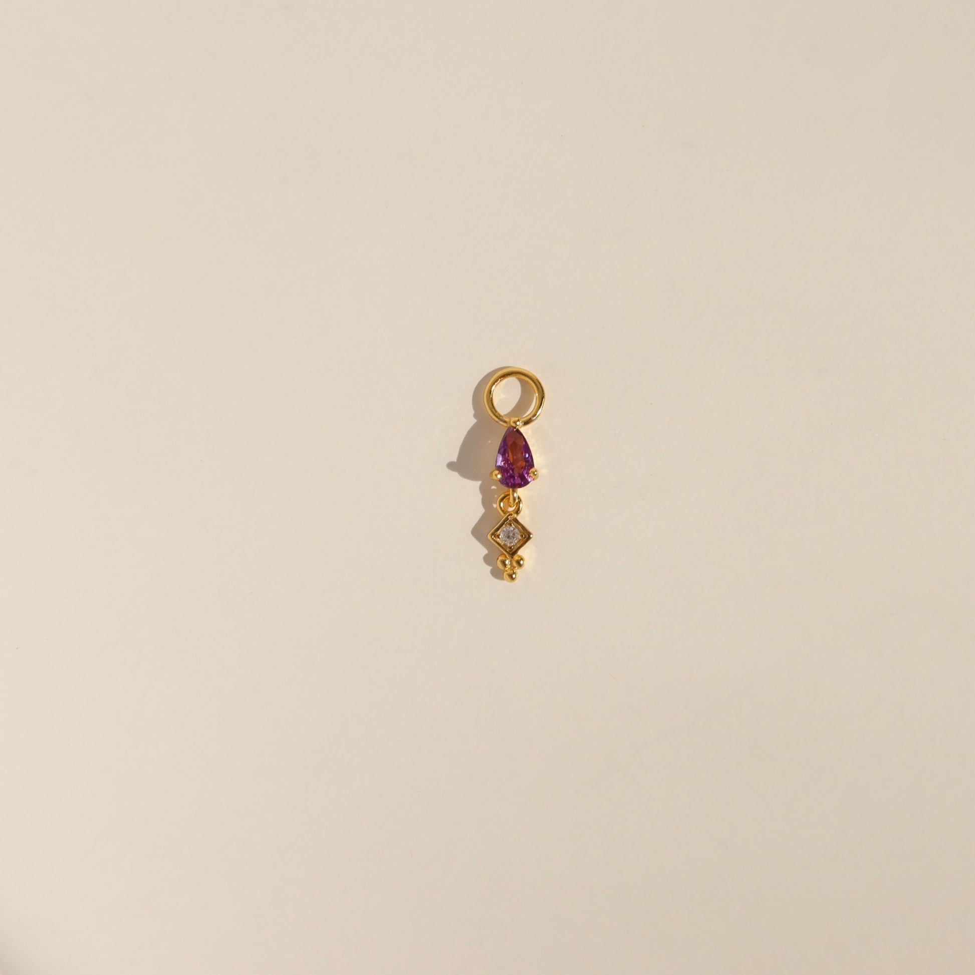 单个吊坠饰有一颗紫色泪滴状方晶锆石和一颗迷你方晶锆石水滴。它可拆卸,并可与我们任何一款耳环互换。 打造您自己的耳环系列