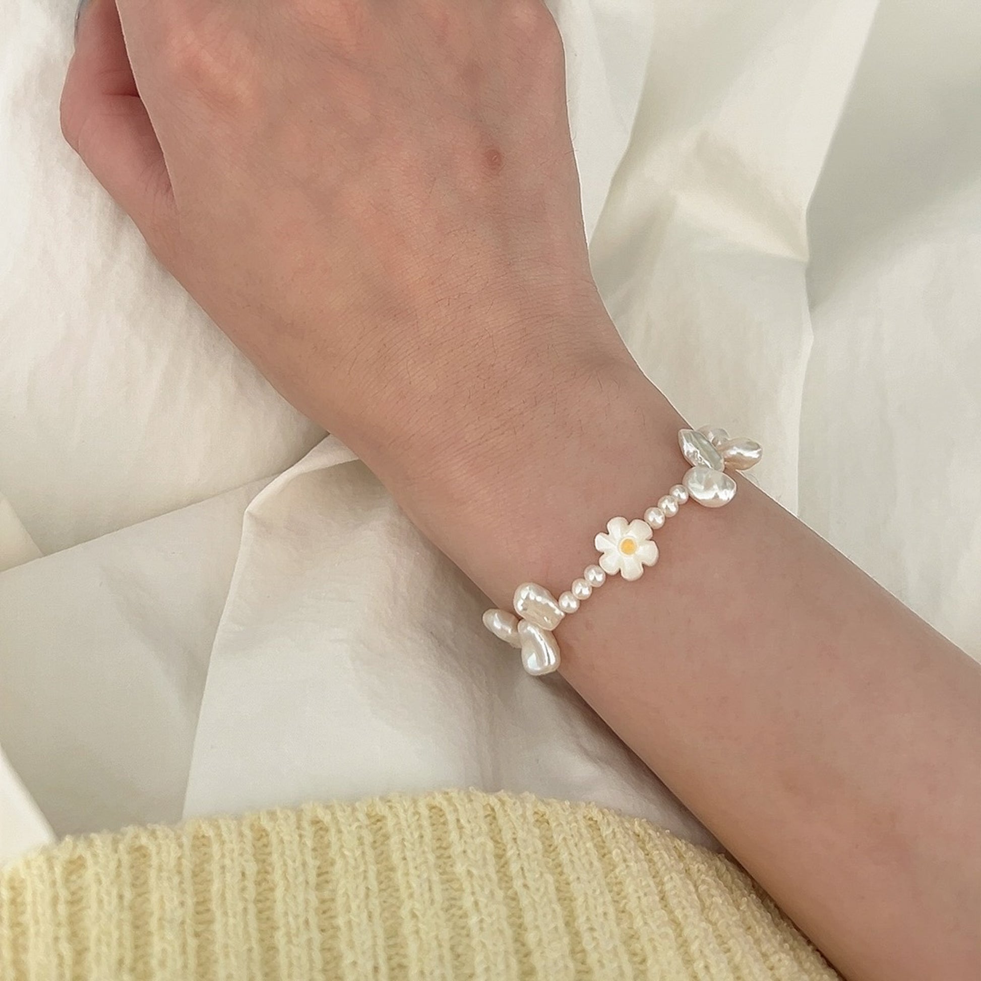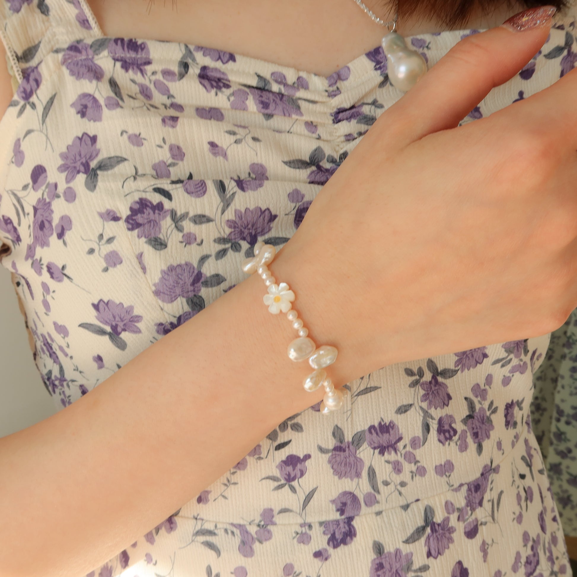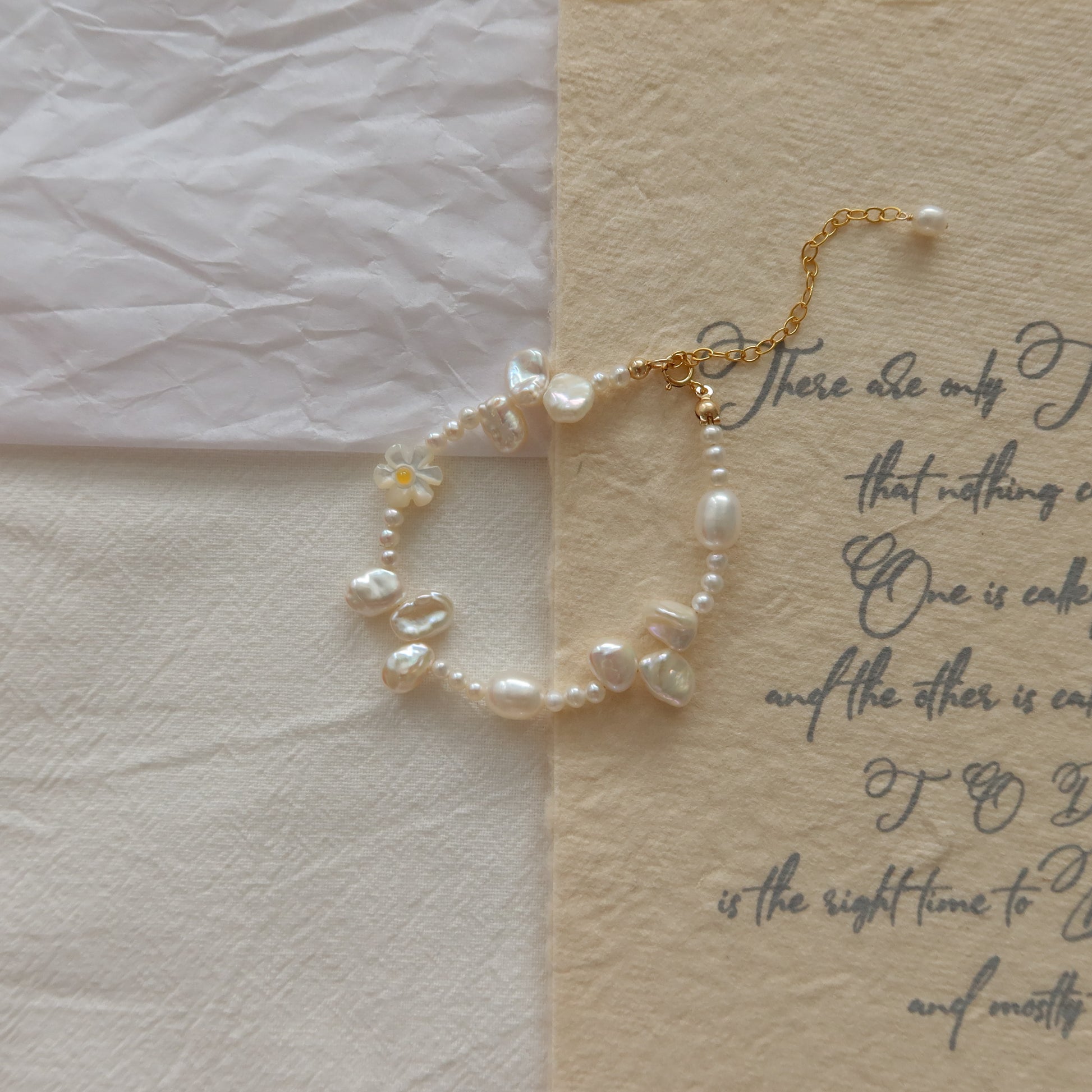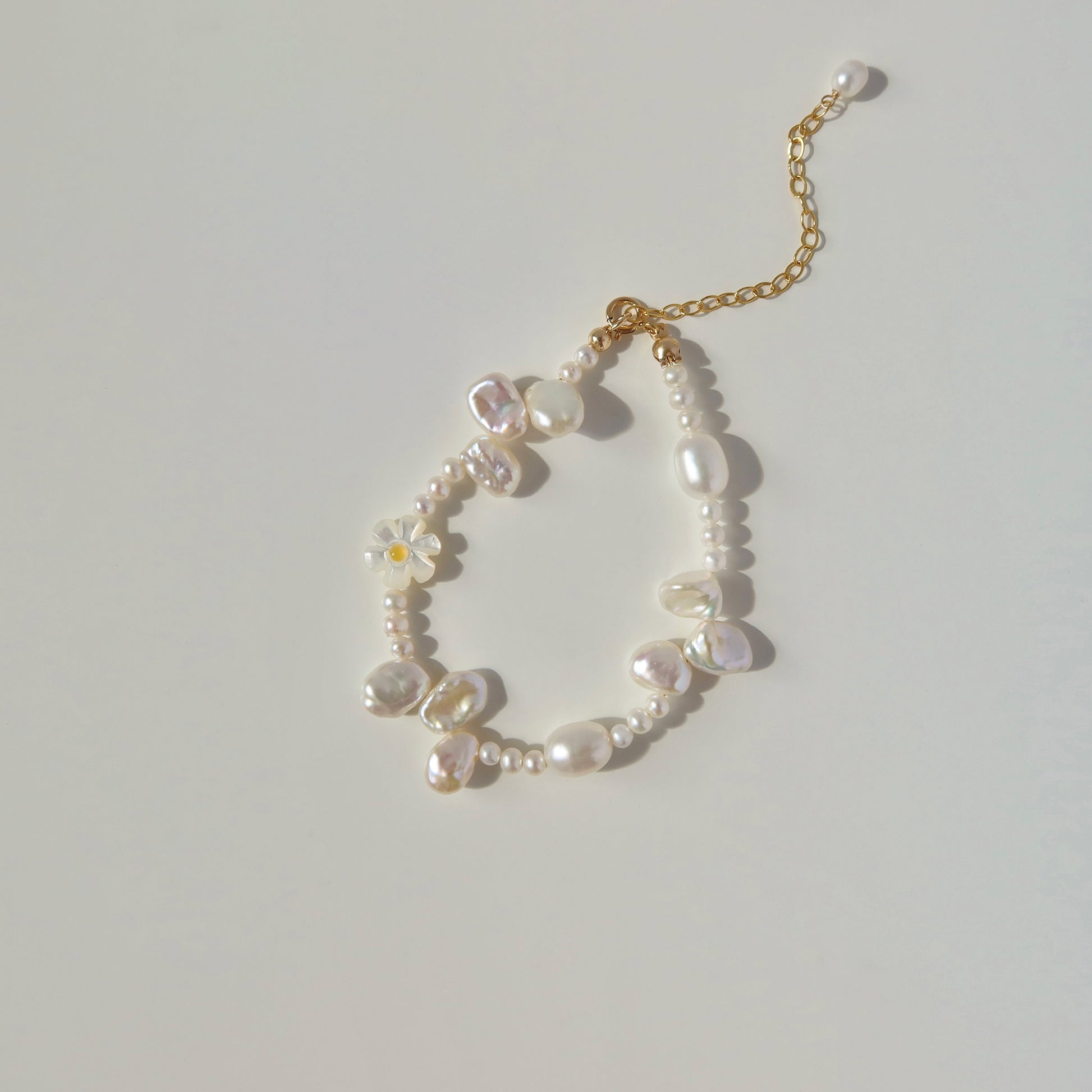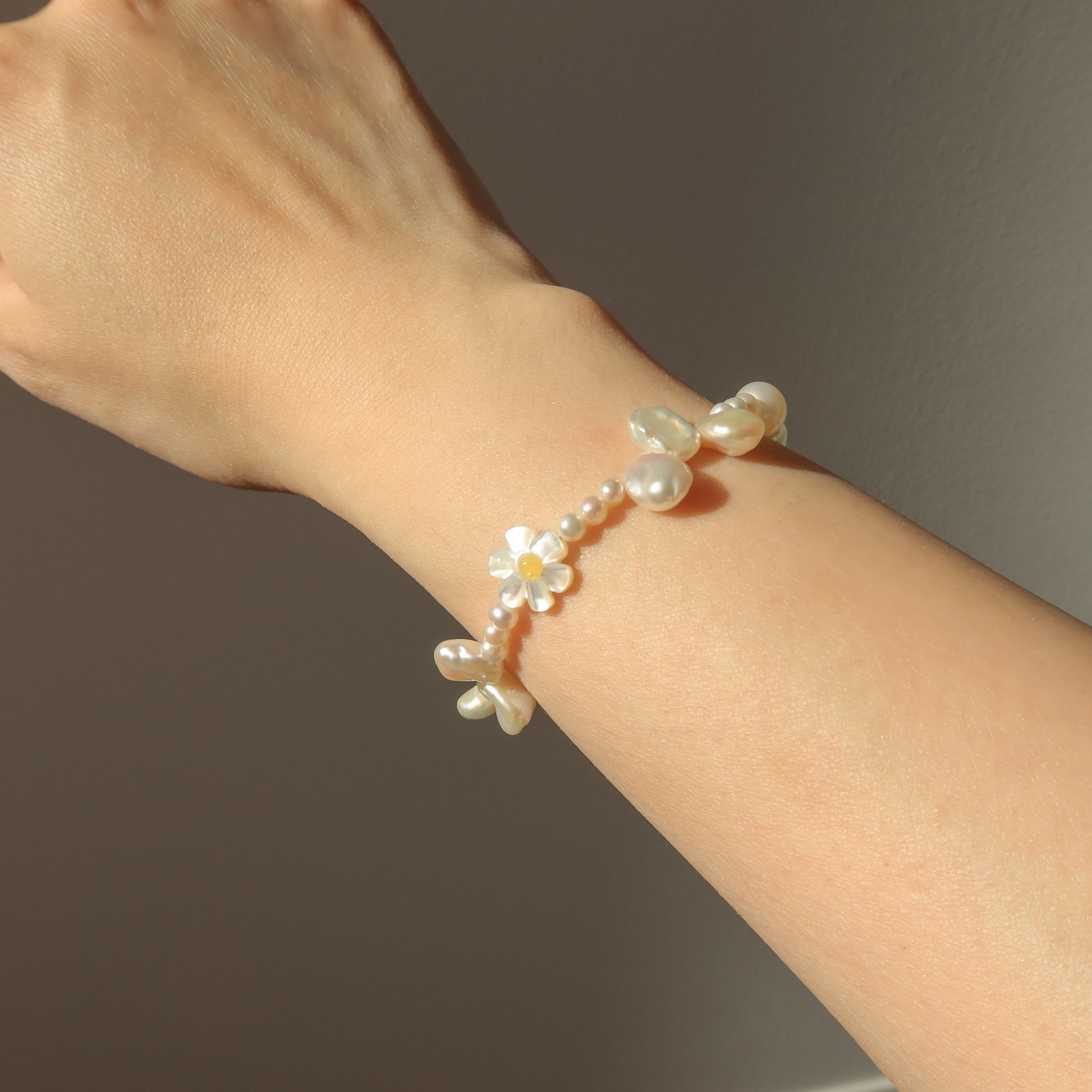 我们隆重推出春夏主打手链!采用天然芥子珍珠、淡水珍珠和一颗珍珠母雏菊珠精心手工打造。这款手链是您展现女性魅力、打造可爱春夏造型的完美点缀。