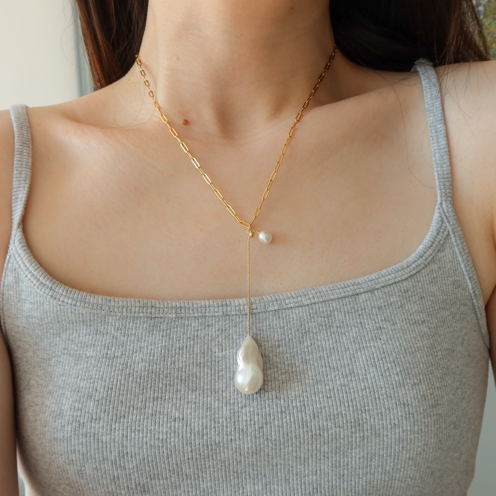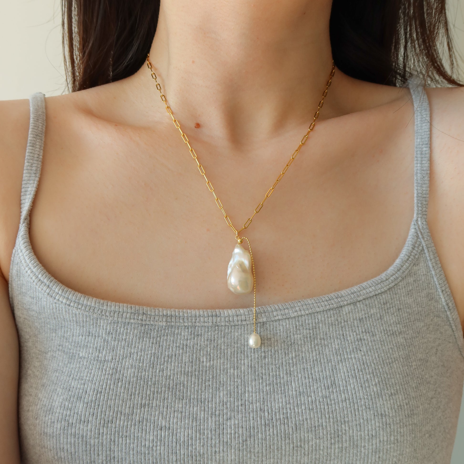 隆重推出 Oceane 项链,一颗大型淡水巴洛克珍珠和一颗米粒珍珠,搭配可调节链条。单独佩戴绝对美轮美奂,或搭配链条项链,打造层叠造型!