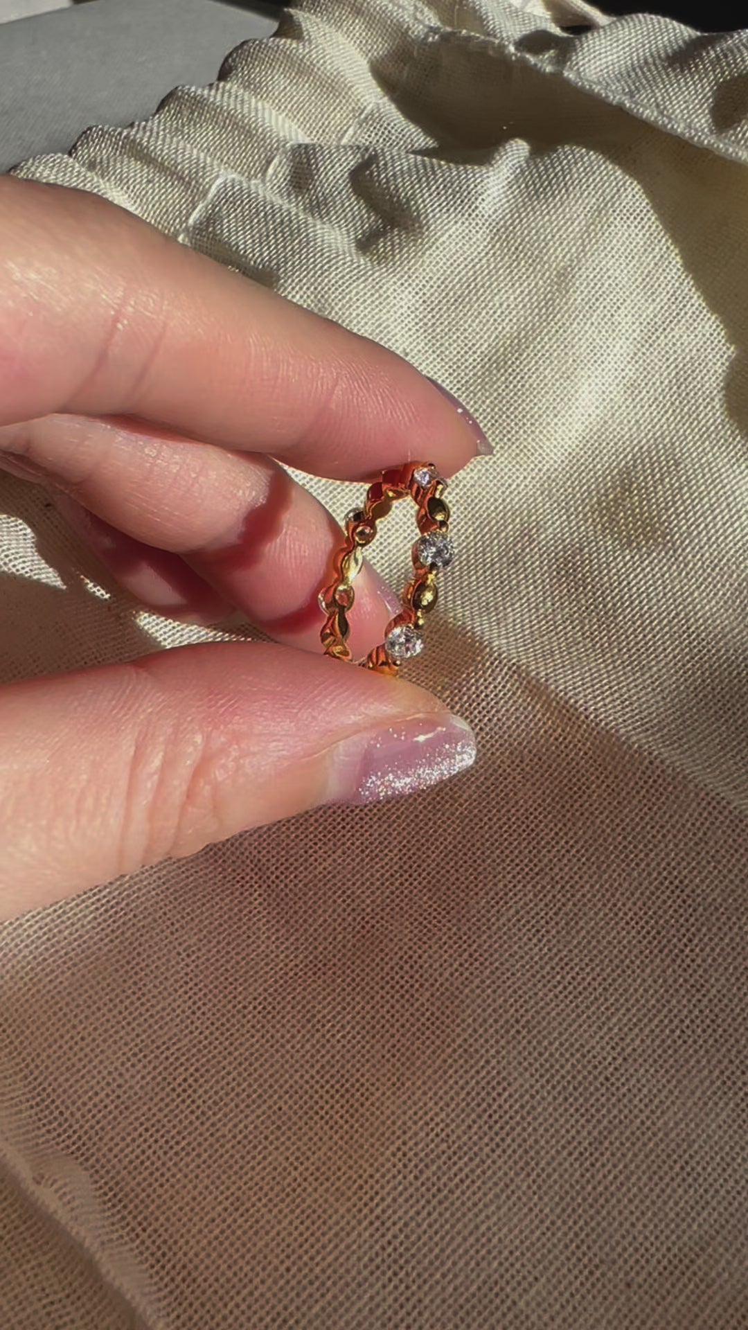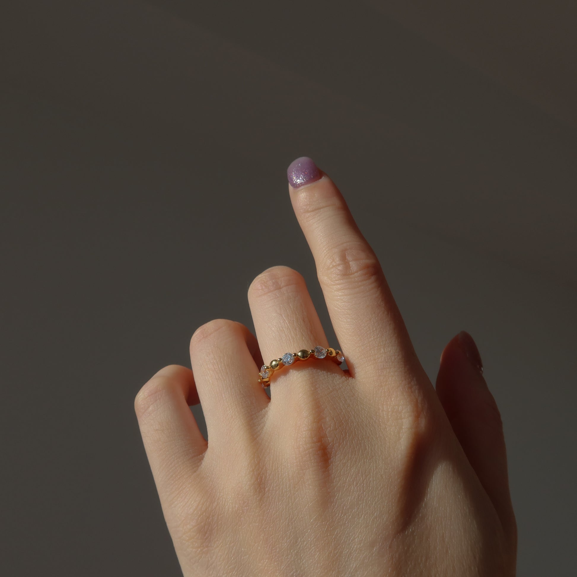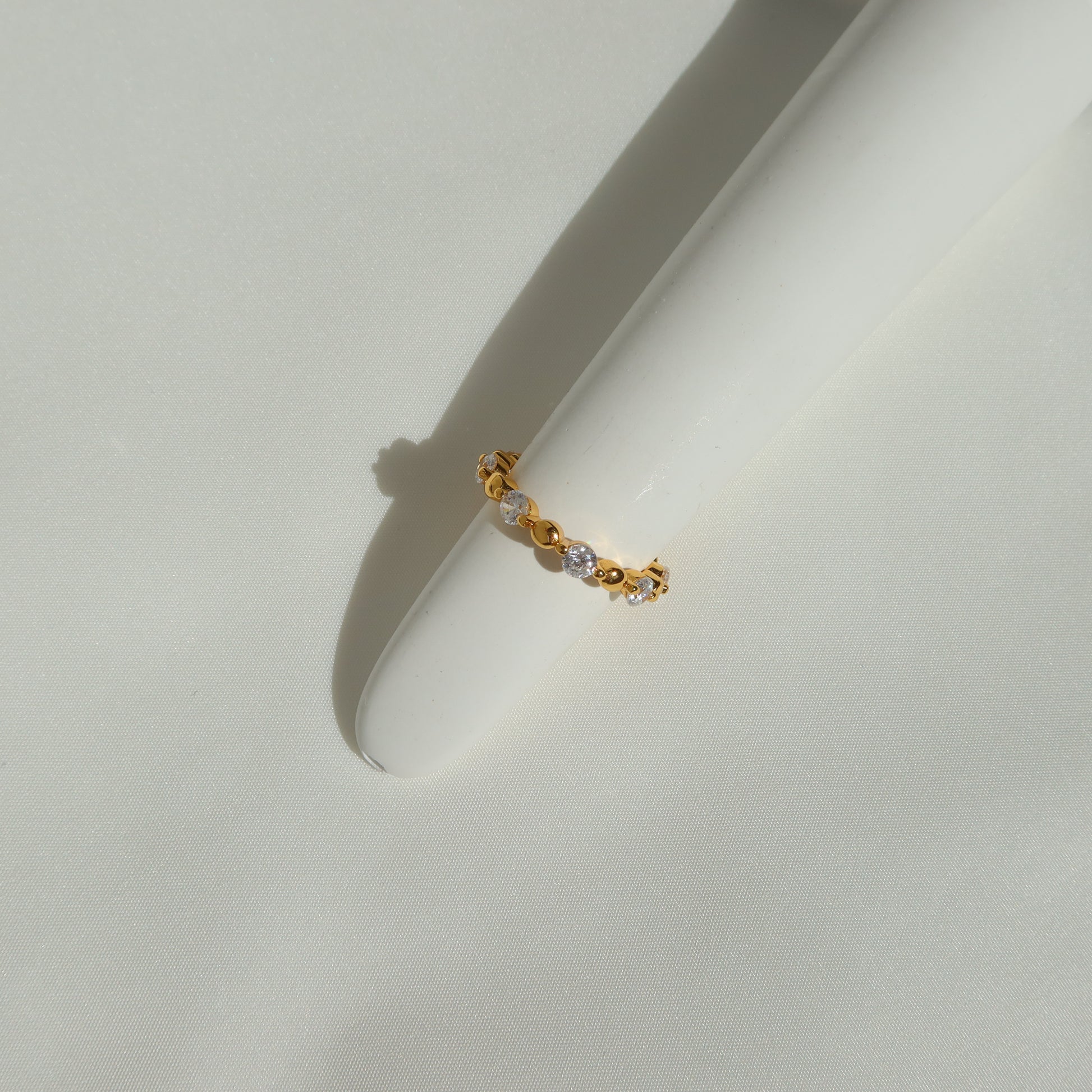 俏皮闪耀,现代演绎。这款戒指的戒圈上镶嵌着璀璨的立方氧化锆石,并点缀着抛光金色泡泡细节,更添质感与魅力。璀璨夺目,个性十足,无论是单独佩戴还是叠戴,都堪称完美。