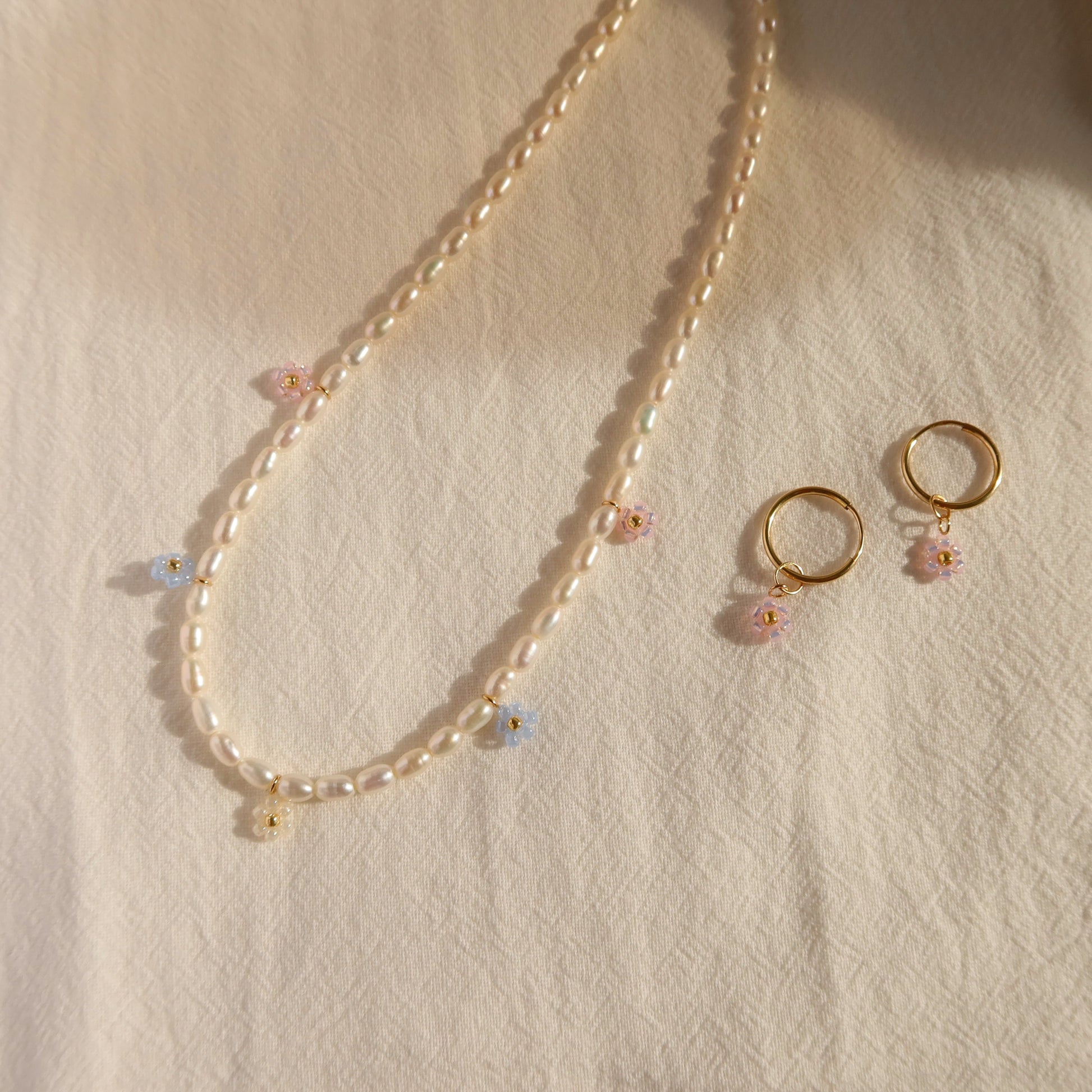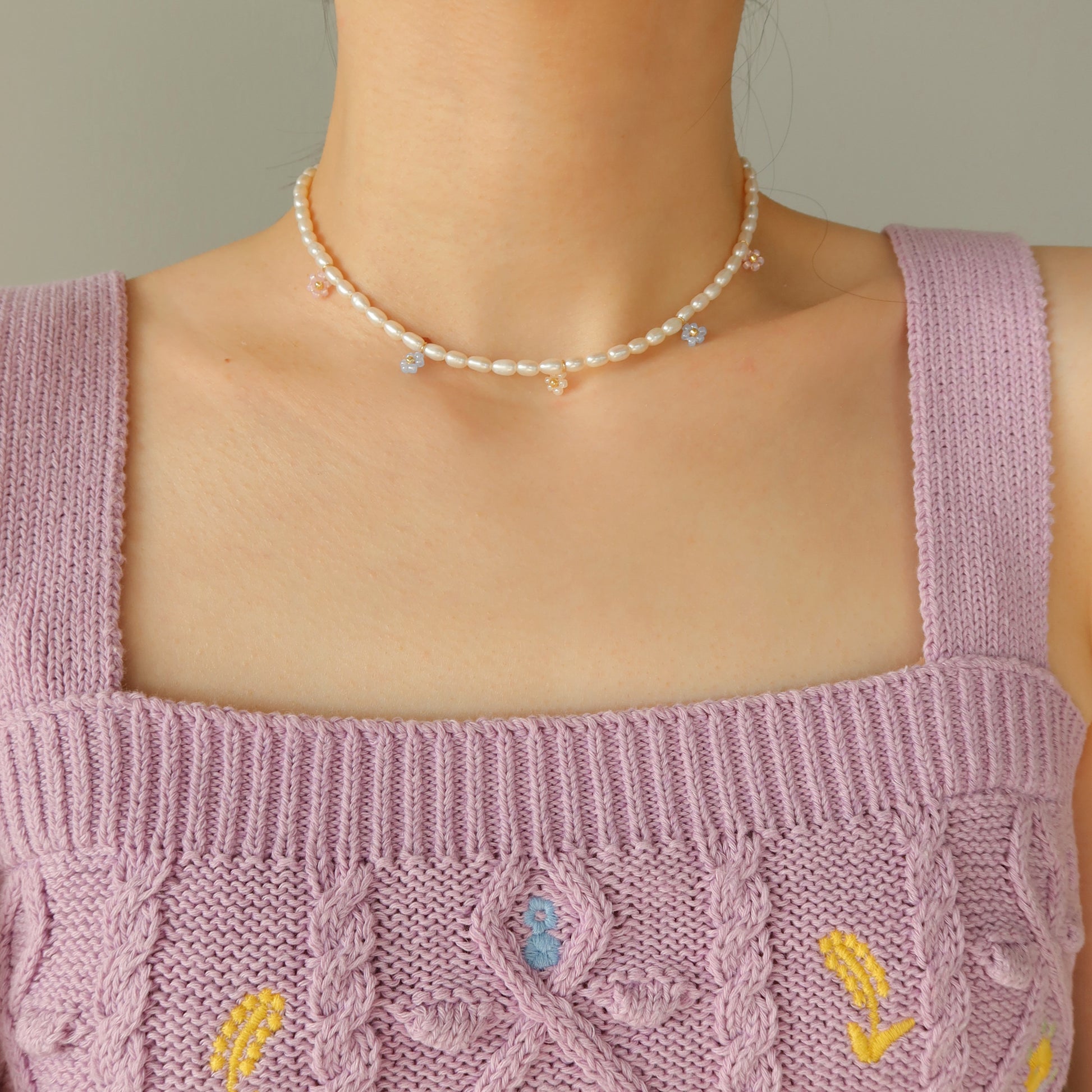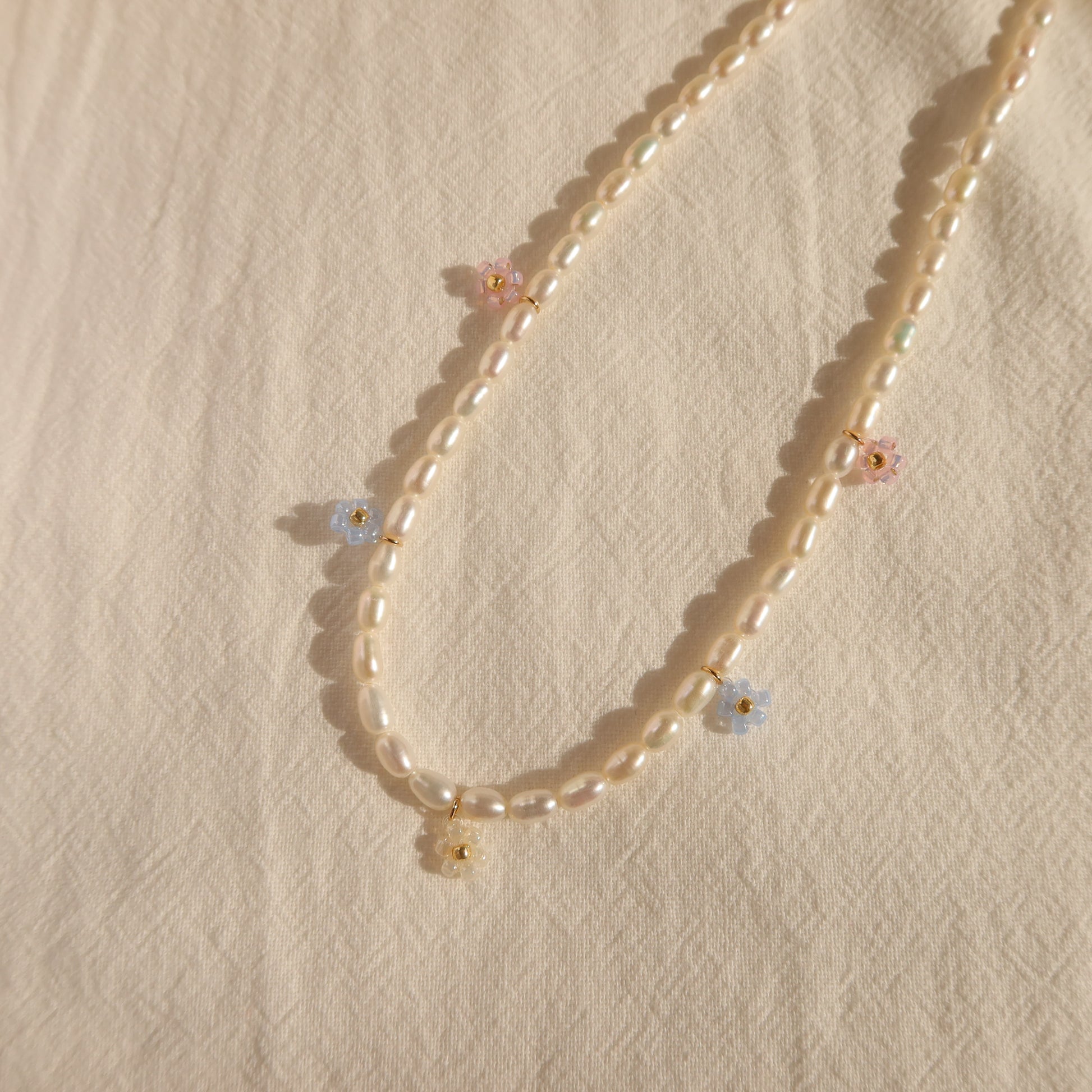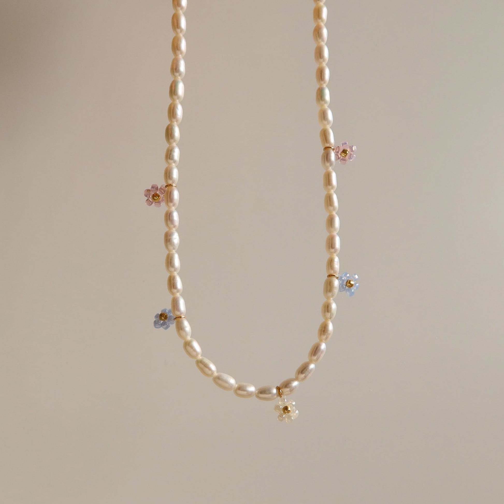 经典珍珠项链,细节精致可爱。采用淡水米珠和14K金配件手工打造,经久耐用。串珠上点缀着色彩缤纷的雏菊花朵,是夏季野餐的必备单品!