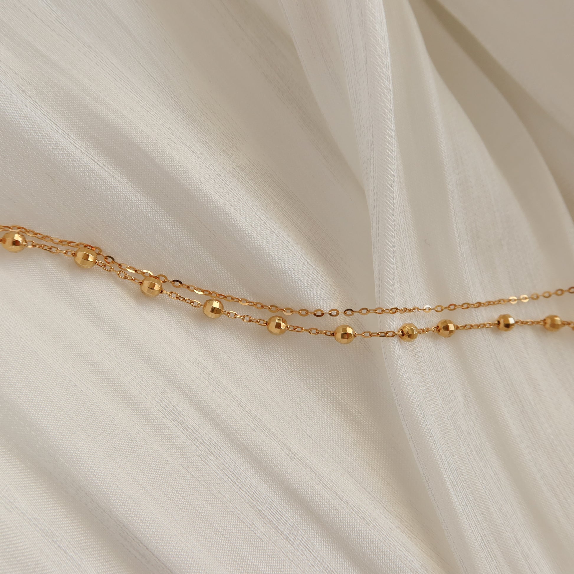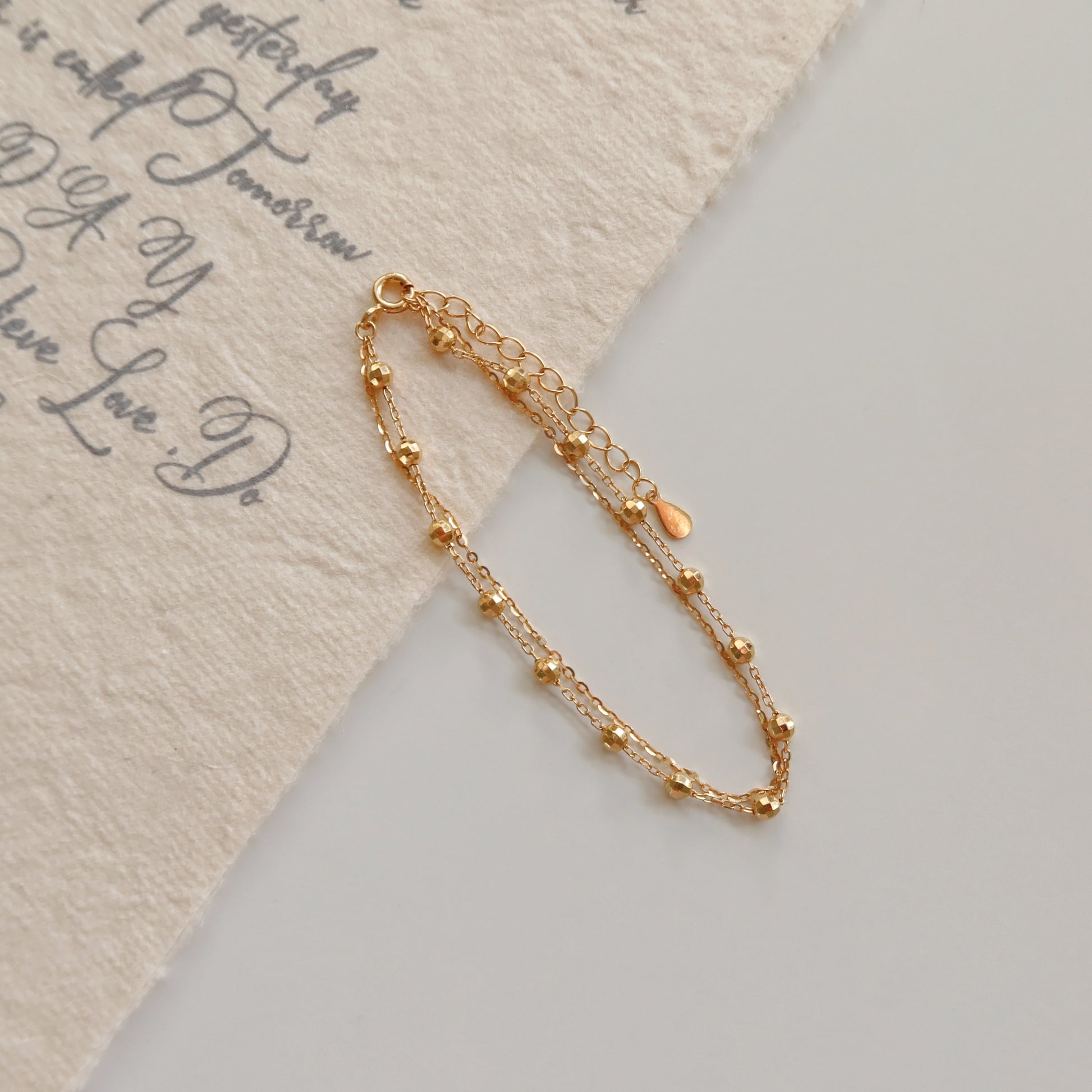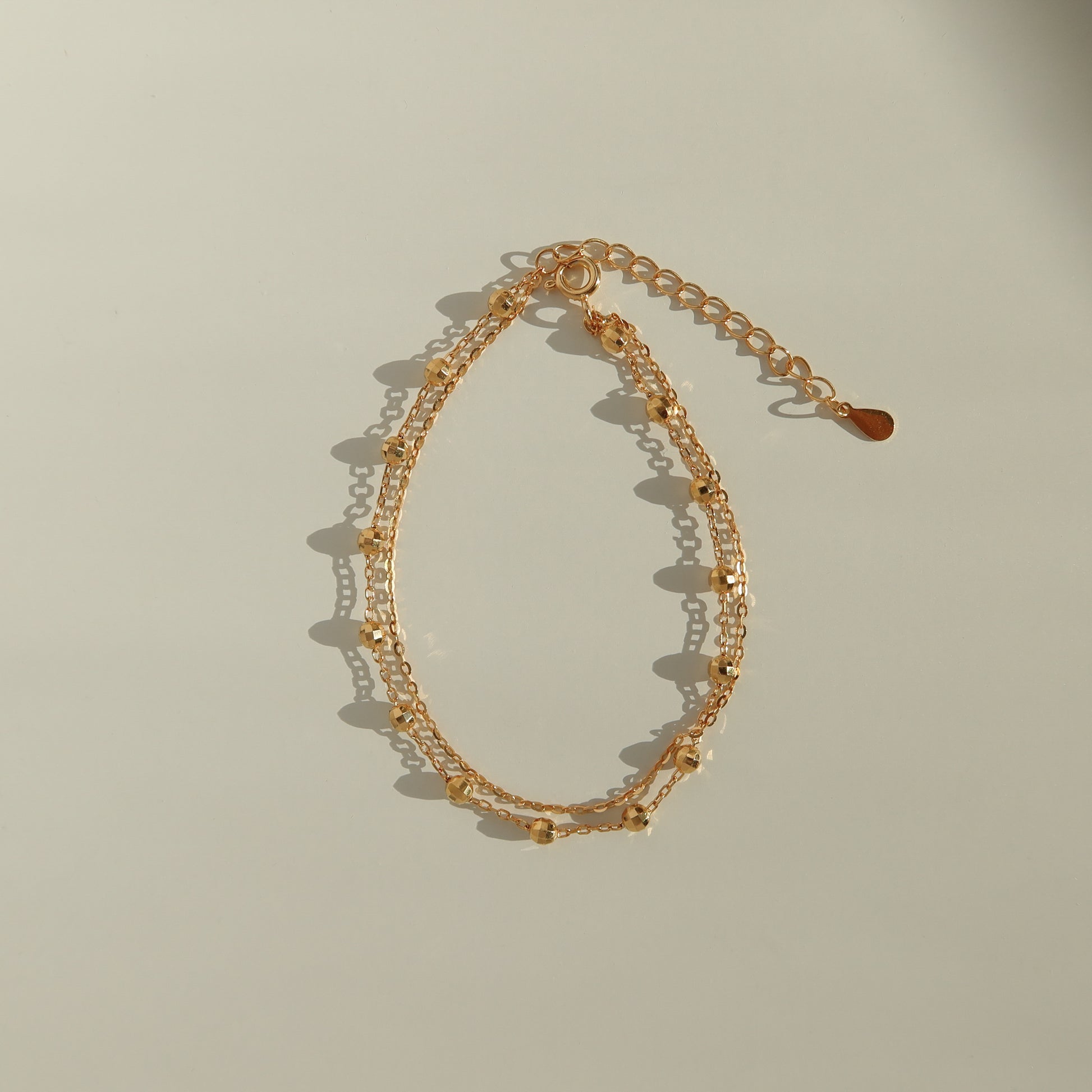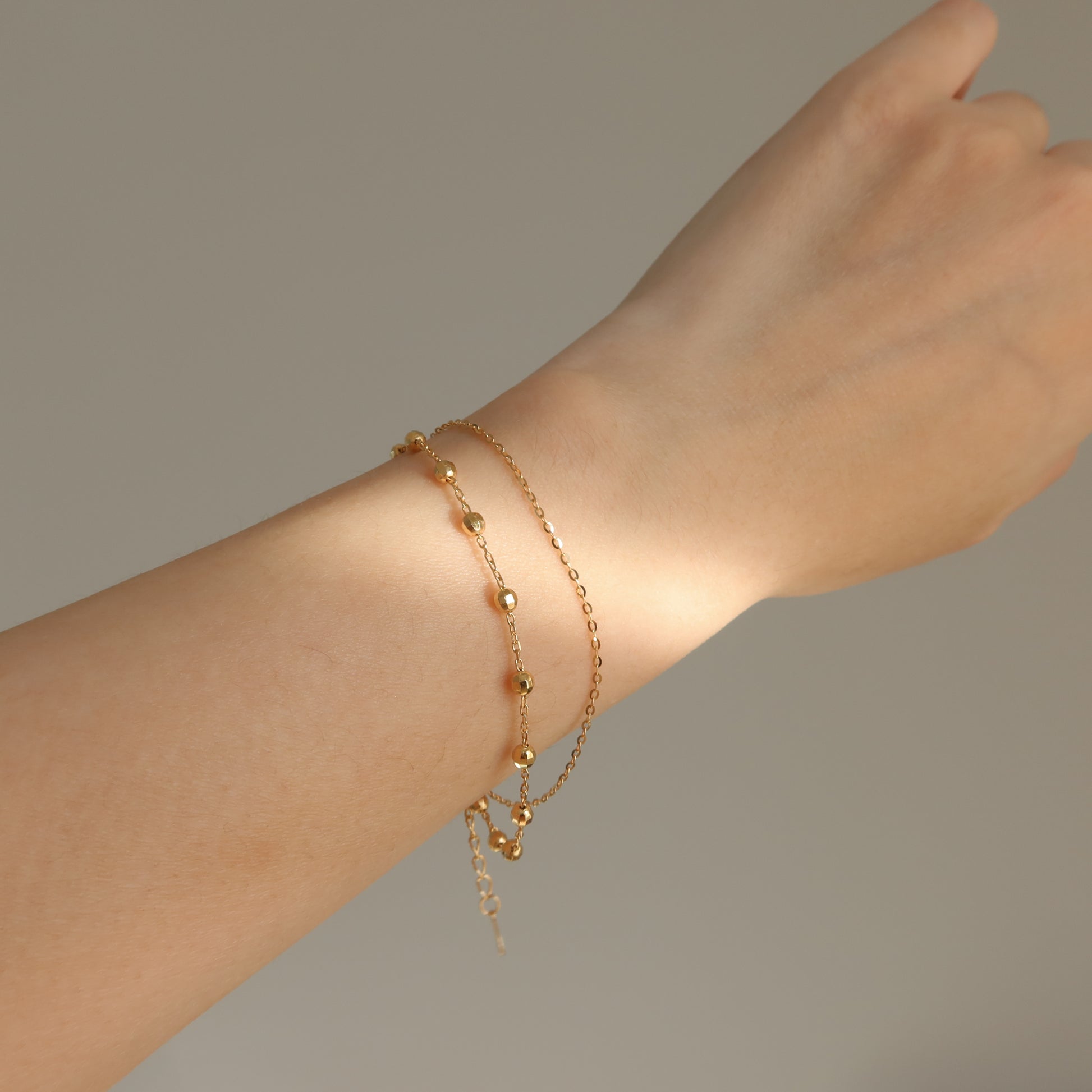 我们独家推出的双链手链,限量发售,提升您的时尚品味。一条手链融合了两种令人惊艳的链条设计,闪闪发光的金珠在灯光下闪闪发光,营造出令人着迷的效果。