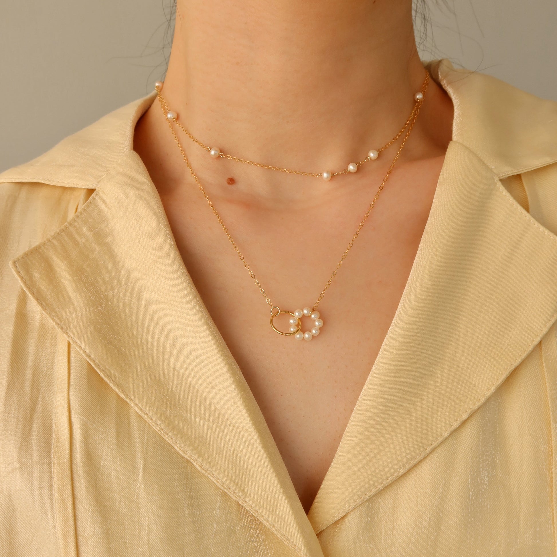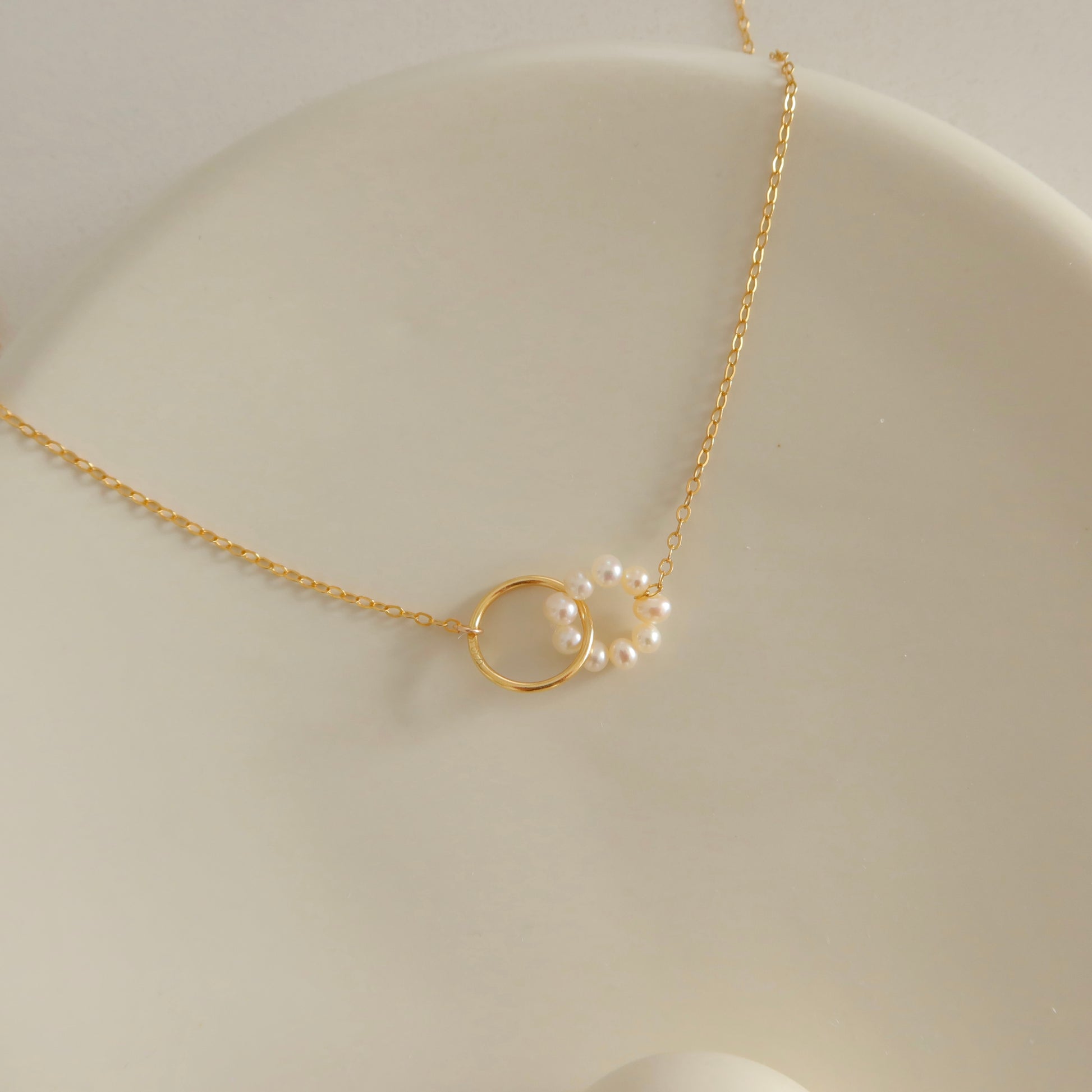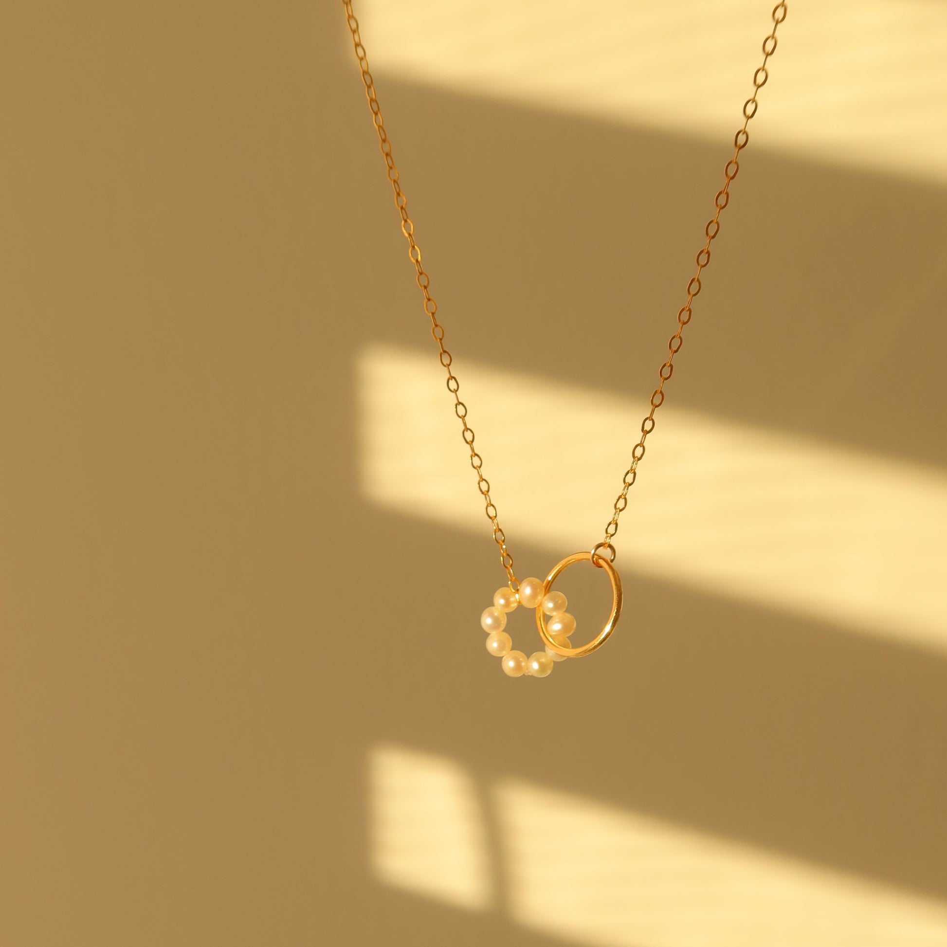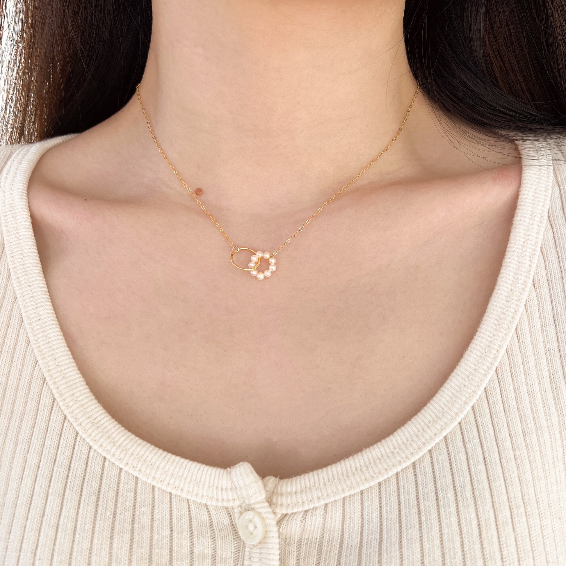精致的珍珠金环项链,采用14K包金材质和淡水珍珠制成。珍珠环和金环相互扣合。