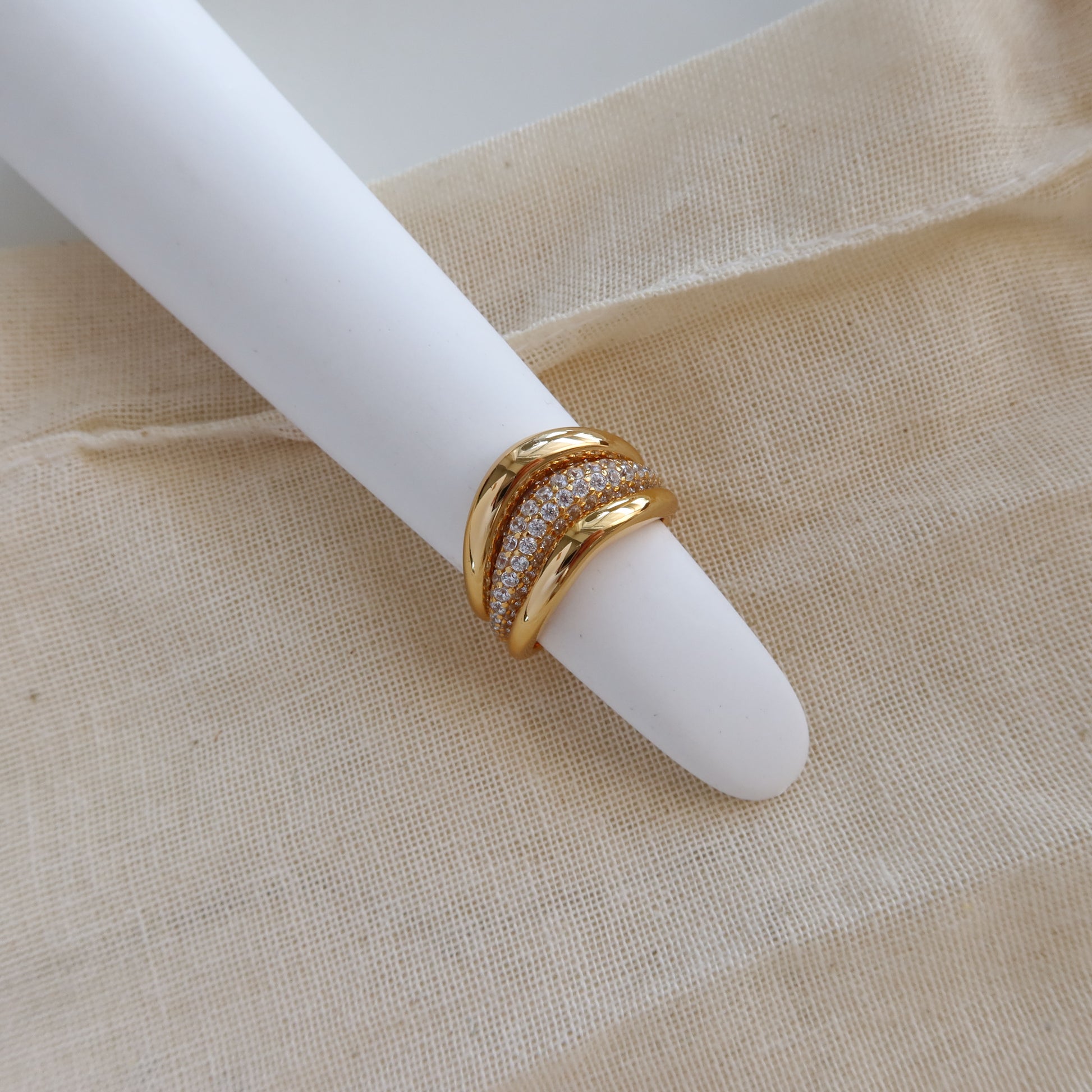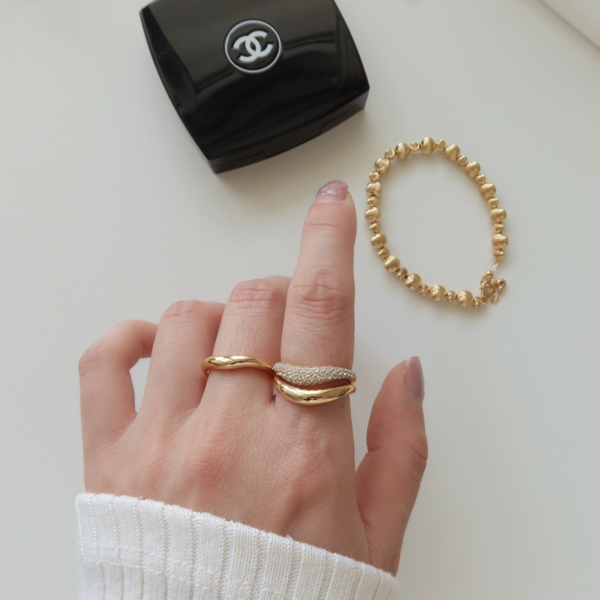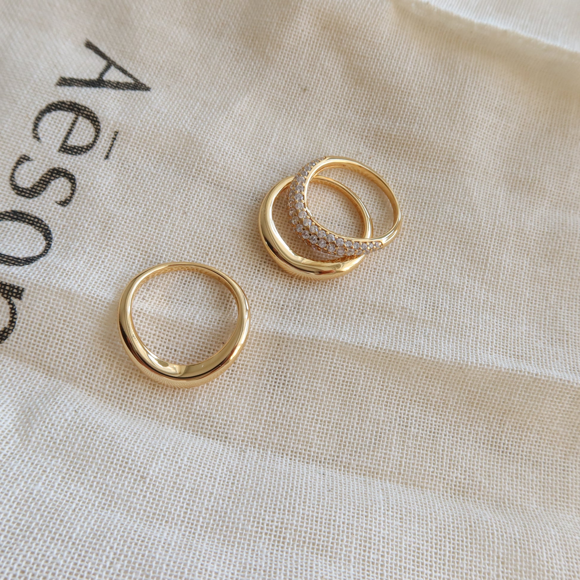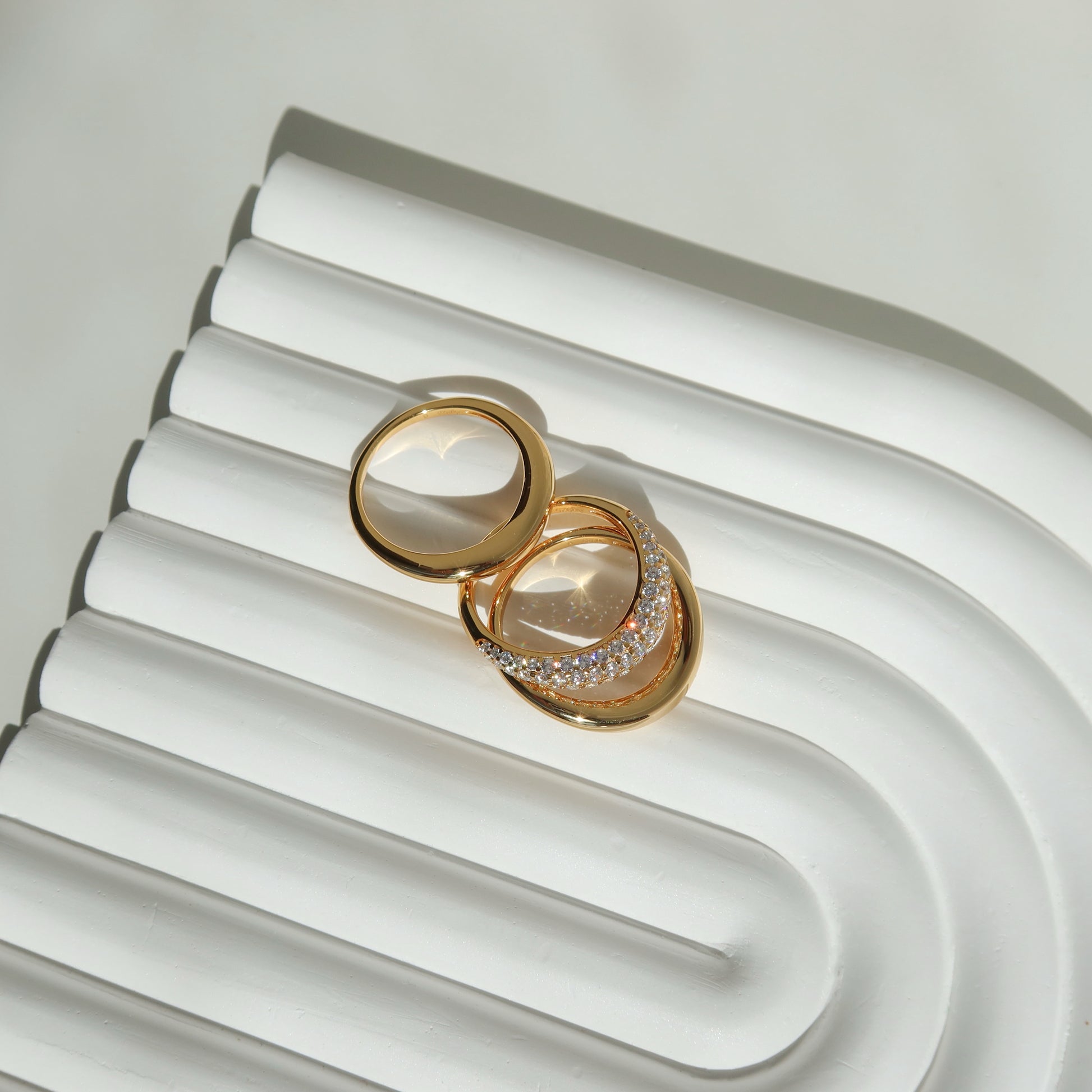 三枚戒指,无限可能。这套戒指包含三条弧形戒圈——两枚采用光滑抛光工艺,另一枚则点缀着闪耀的方晶锆石,形成微妙的对比。叠戴可打造层次感,单独佩戴则可打造极简主义风格。简约百搭,闪耀你的个性。