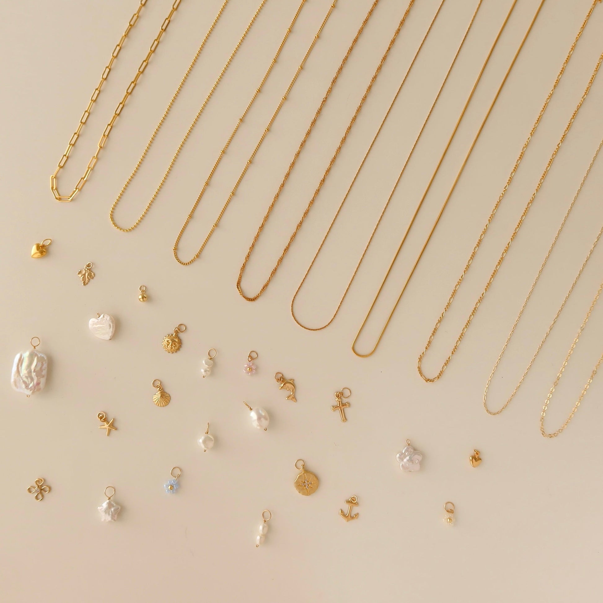 我们选用最优质的材料,确保作品经久耐用。我们的配件和链条均采用14K包金制成。 “包金”是美国行业标准,法律要求黄金含量为5%(重量百分比)。包金工艺将一层纯金粘合在基材(通常是黄铜)上,再经过高温高压处理。包金的含金量比镀金高出100倍。它是纯金的最佳替代品,具有防过敏和防水的特性。保养良好的包金首饰可以持续使用10到30年,直至黄金磨损。然而,由于制造方式的原因,包金工艺存在一些局限性;它目前仅以线材或薄片形式提供,因此无法铸造或浇铸到模具中。包金串饰要么是扁平的(由薄片制成),要么是空心的(由两片金属片焊接而成)。当无法制作包金串饰或戒指时,我们会改用镀金或镀金黄铜。