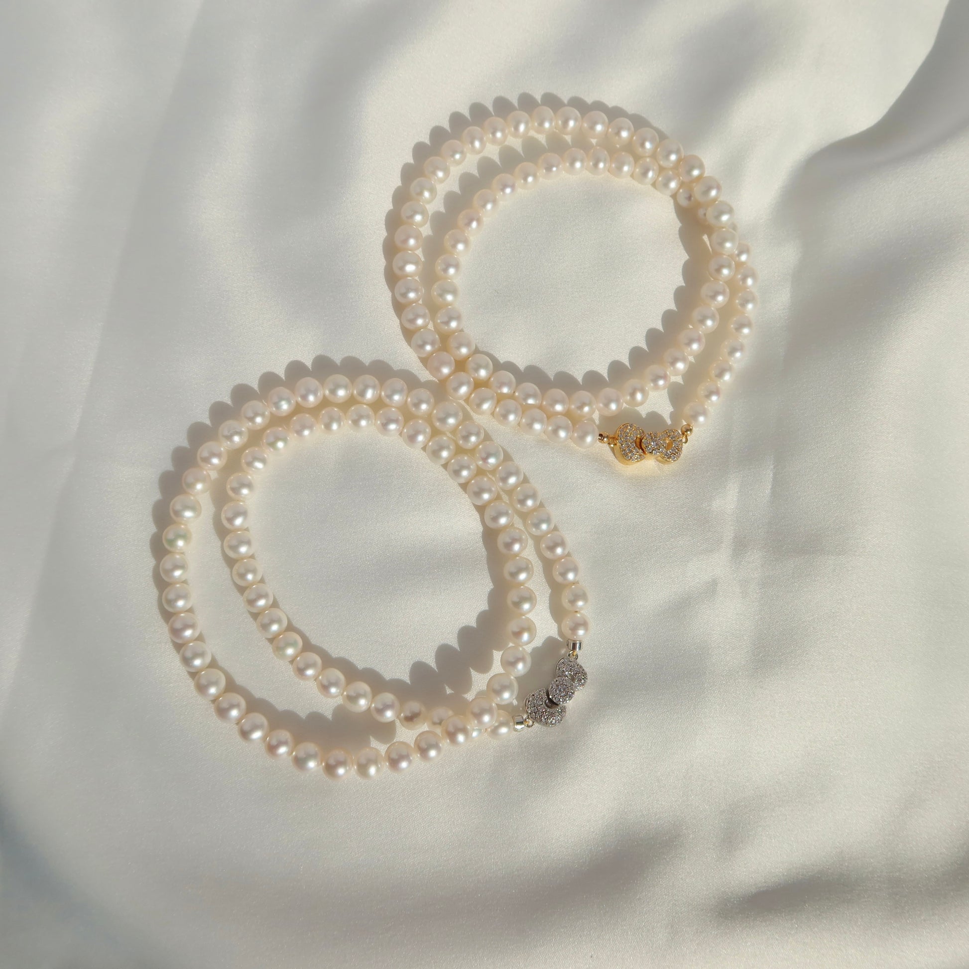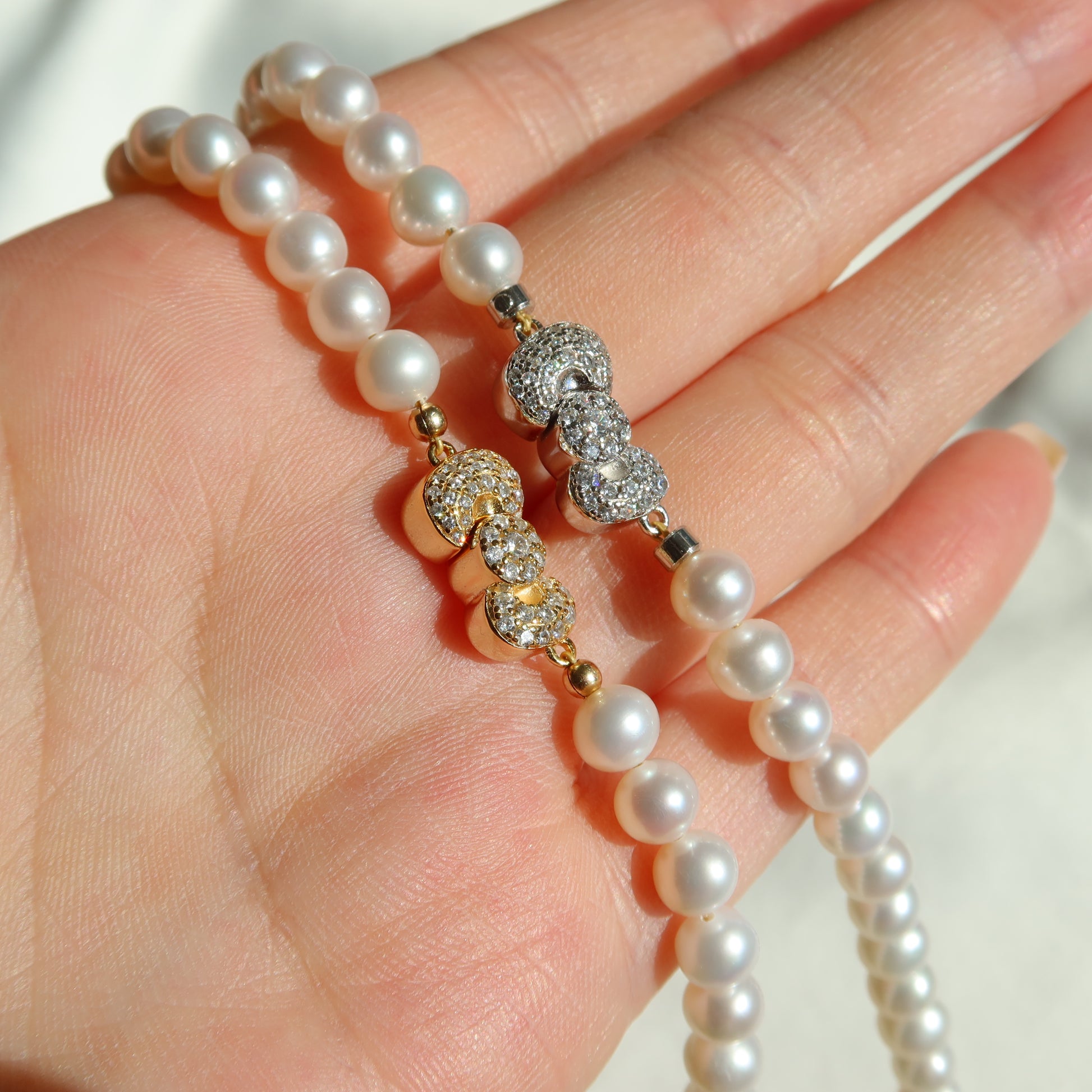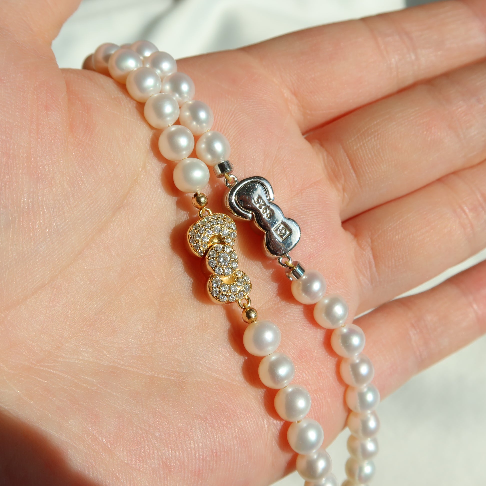 - 我们建议您在淋浴和游泳前取下珍珠首饰,以保持其光泽。水中的氯会长期损害珍珠表面。同样,香水、化妆品和发胶中的化学物质也会腐蚀珍珠层。请在进行日常护肤和化妆后再佩戴珍珠首饰。