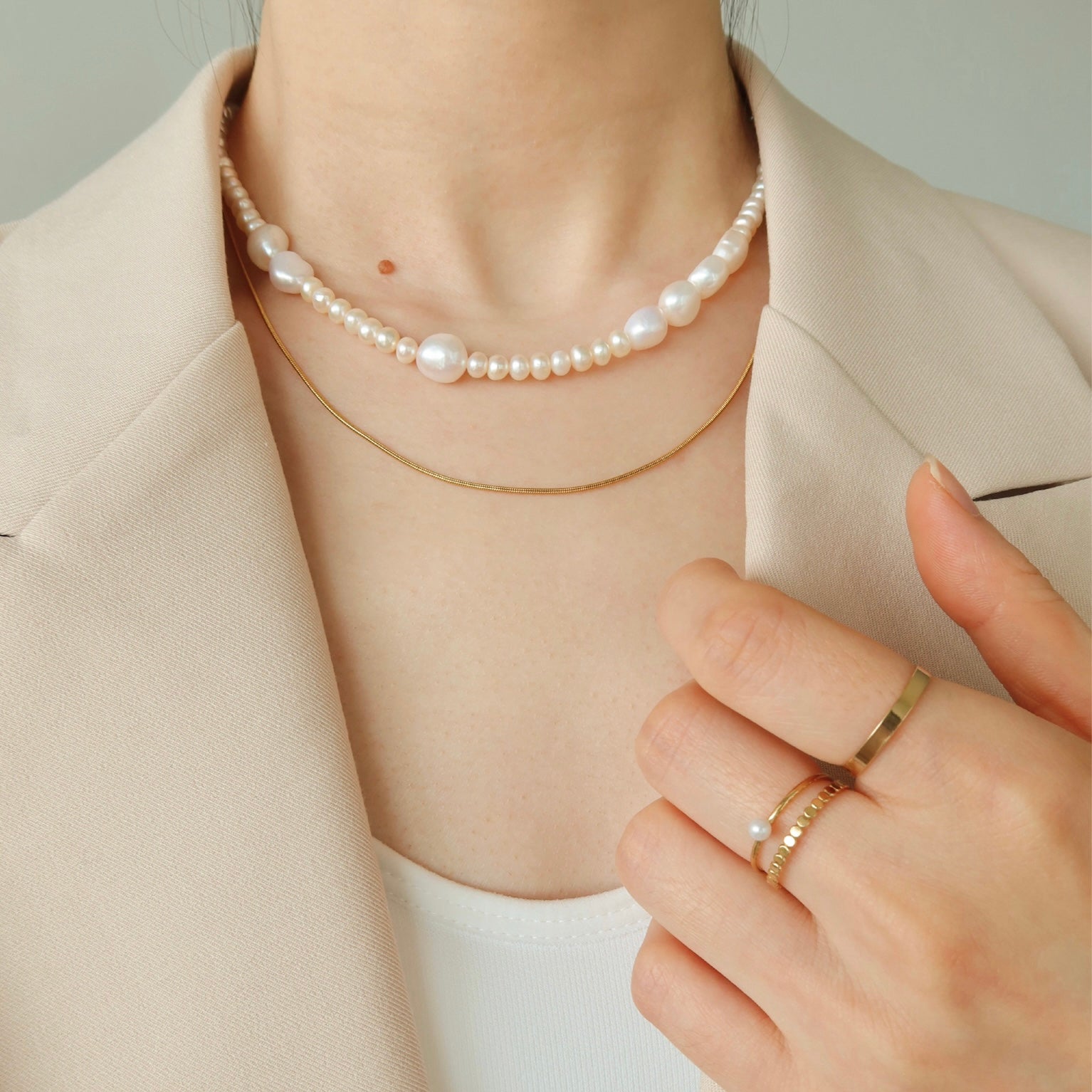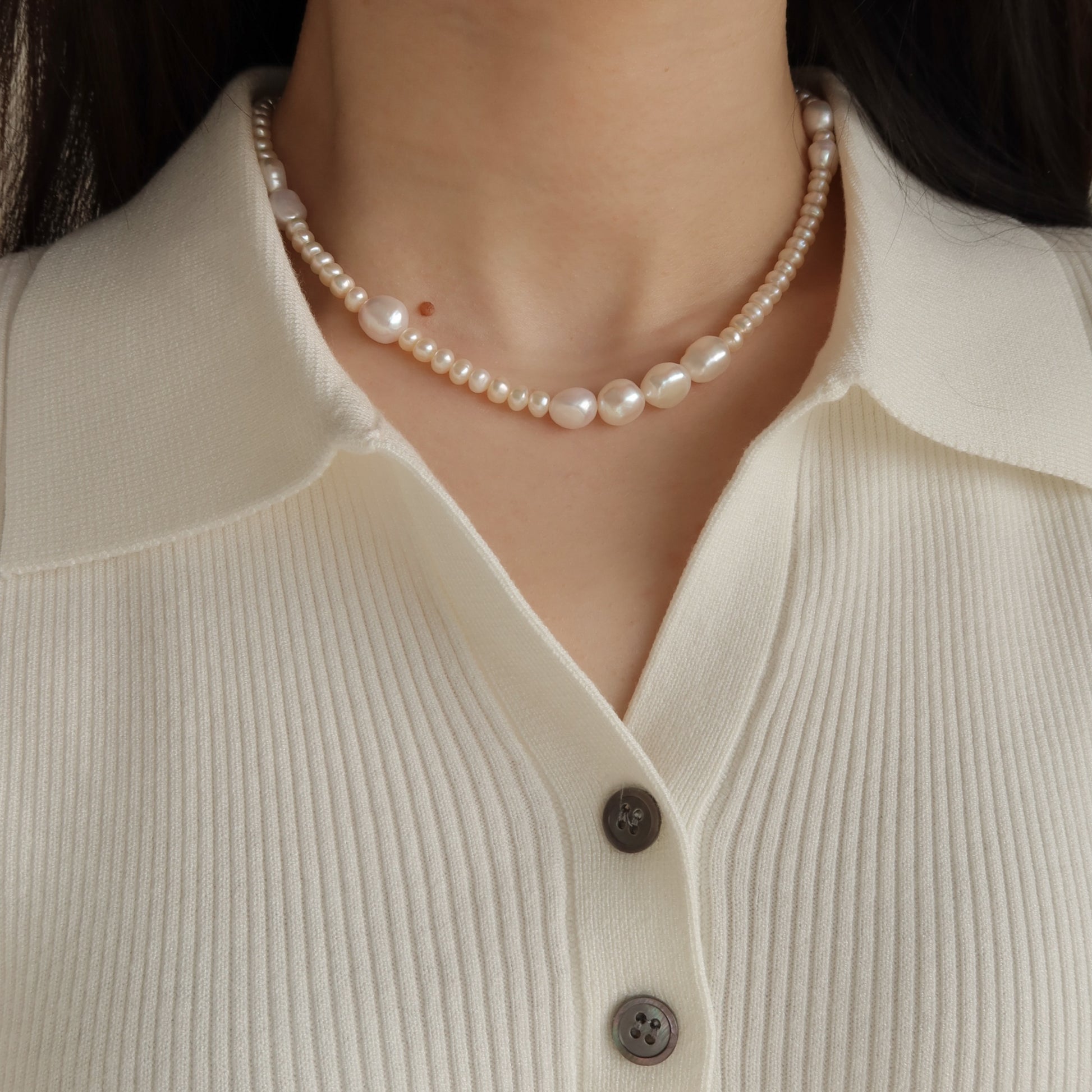 象牙色珍珠串珠项链,镶嵌天然巴洛克珍珠。她完美平衡了现代与经典的风格。这款项链可搭配任何服装,展现精致优雅的气质。