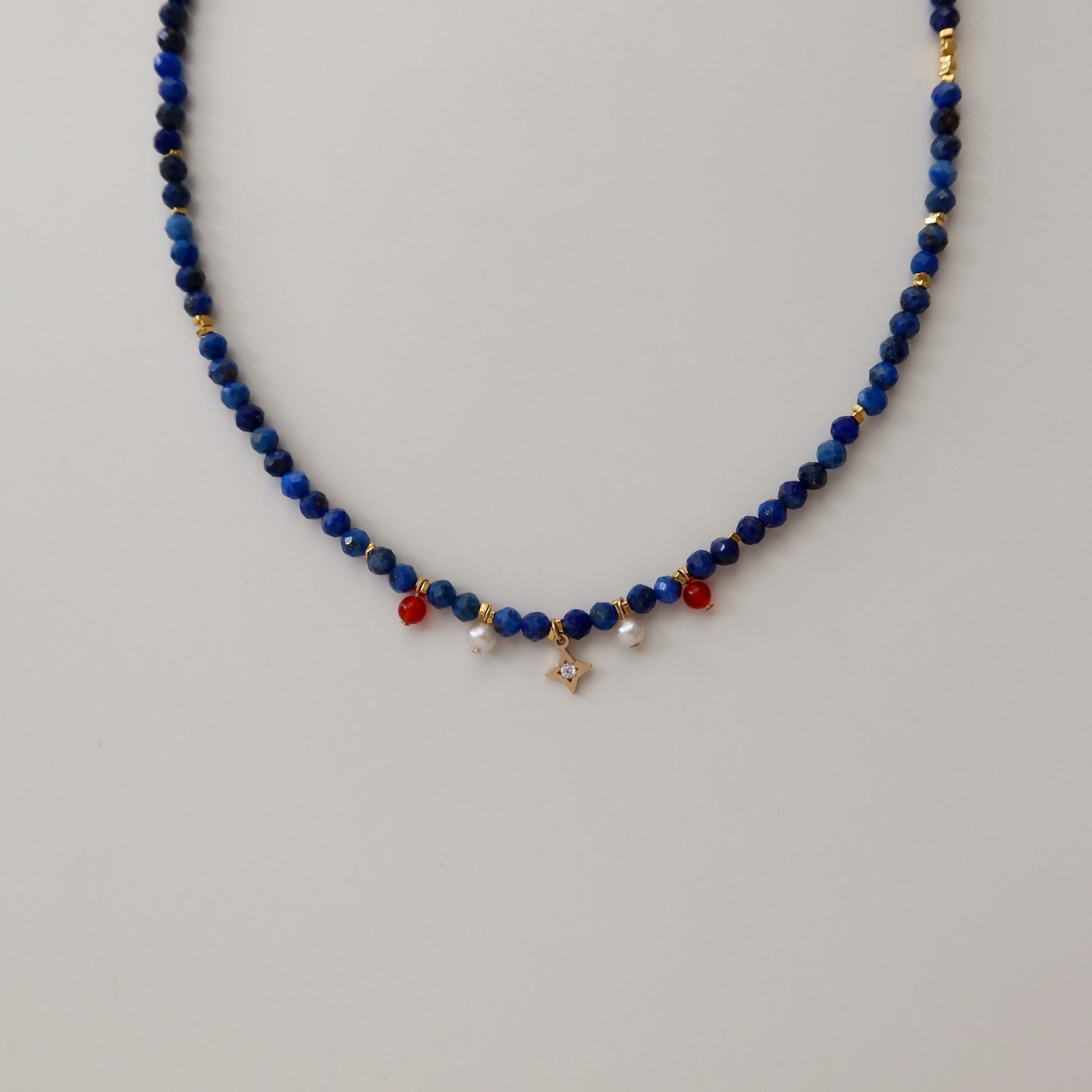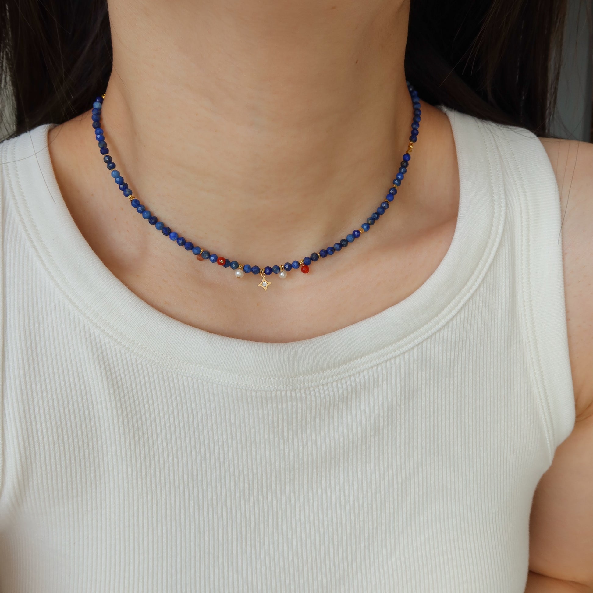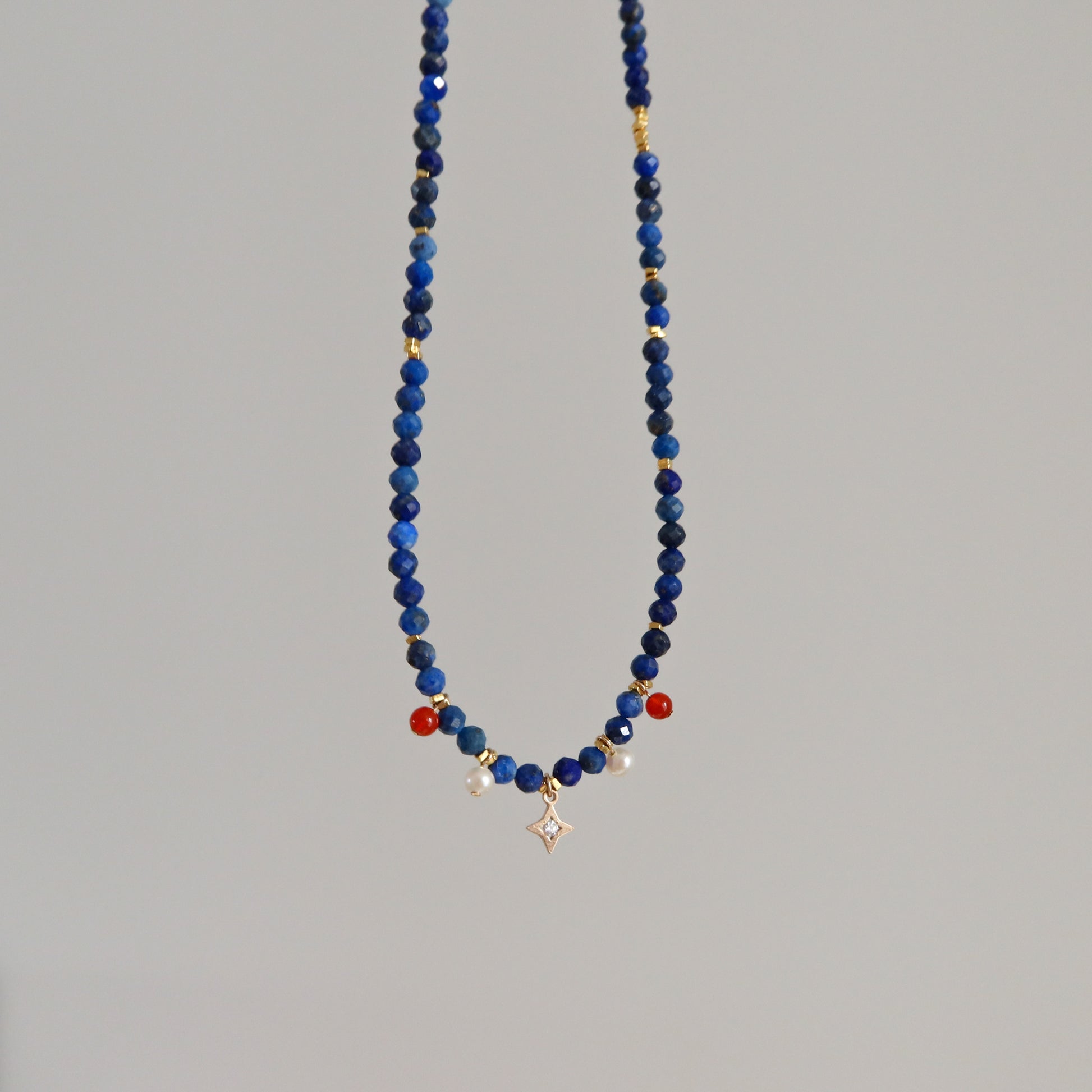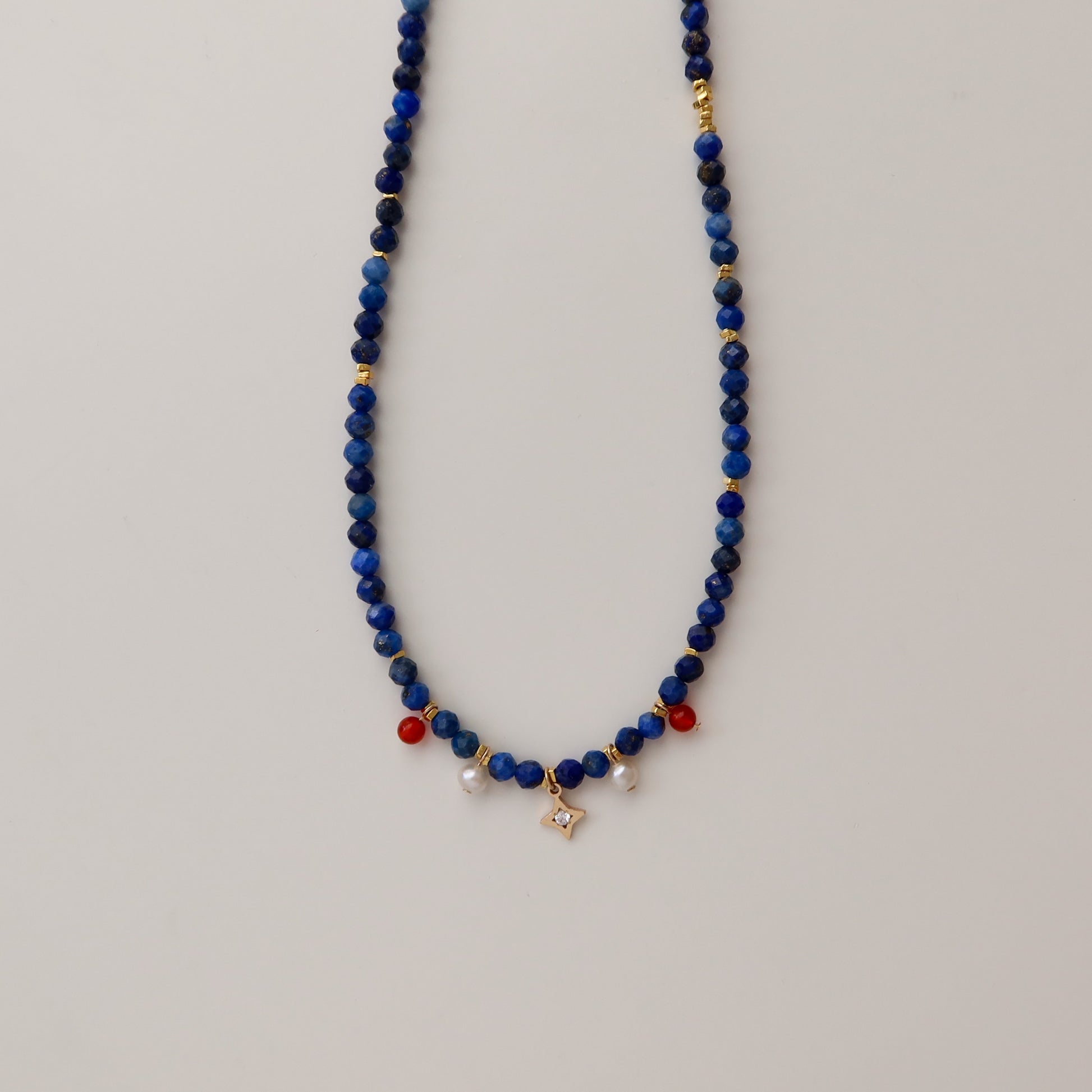 这款青金石项链采用青金石手工打造而成,青金石以其深邃的蓝色调和金色的斑点而闻名,象征着智慧、内在真理和精神启迪。项链上点缀着俏皮的迷你吊饰,包括一颗闪耀的星星、璀璨的珍珠和红玛瑙。红玛瑙、青金石和金珠的鲜艳色彩完美融合,更显其俏皮活泼的气质。