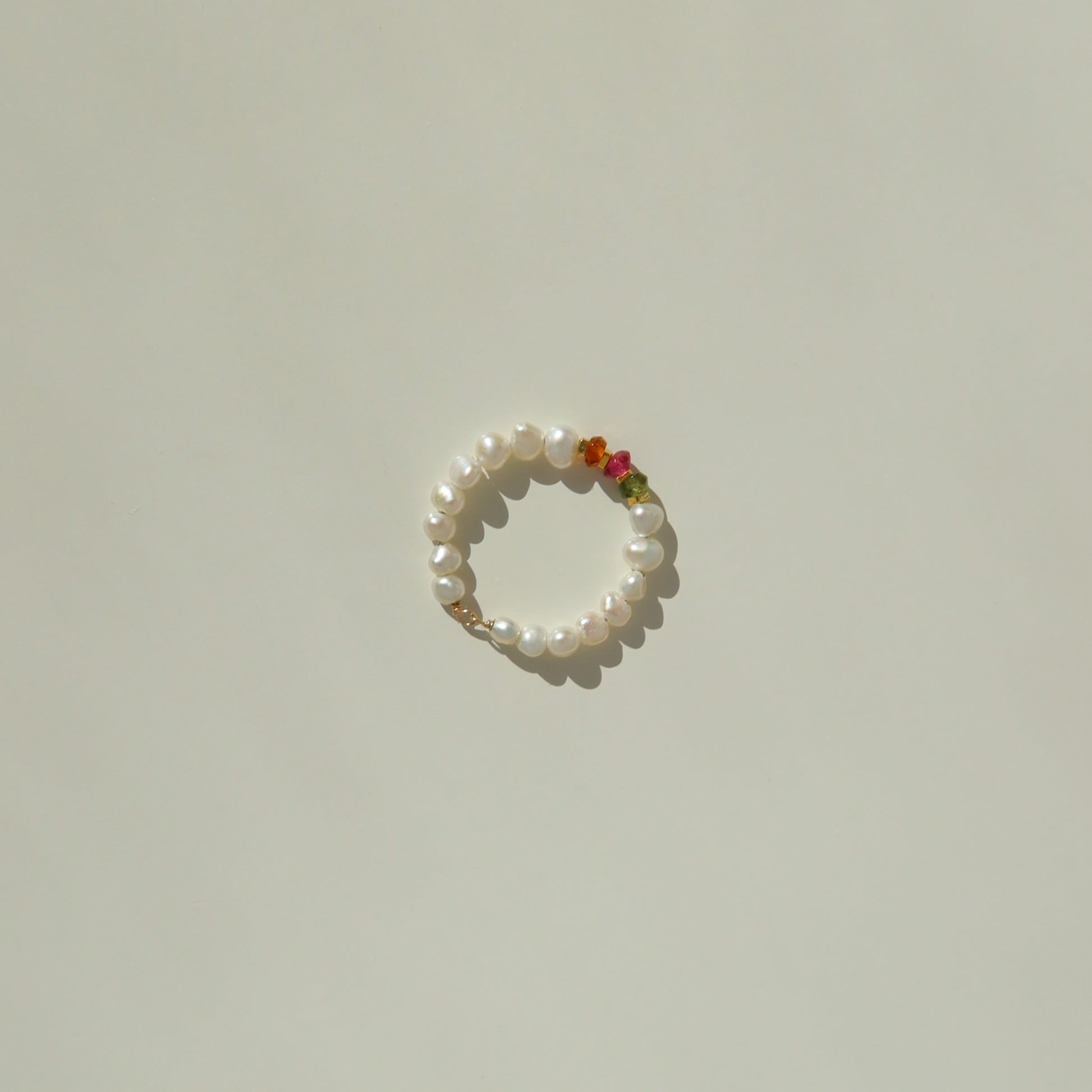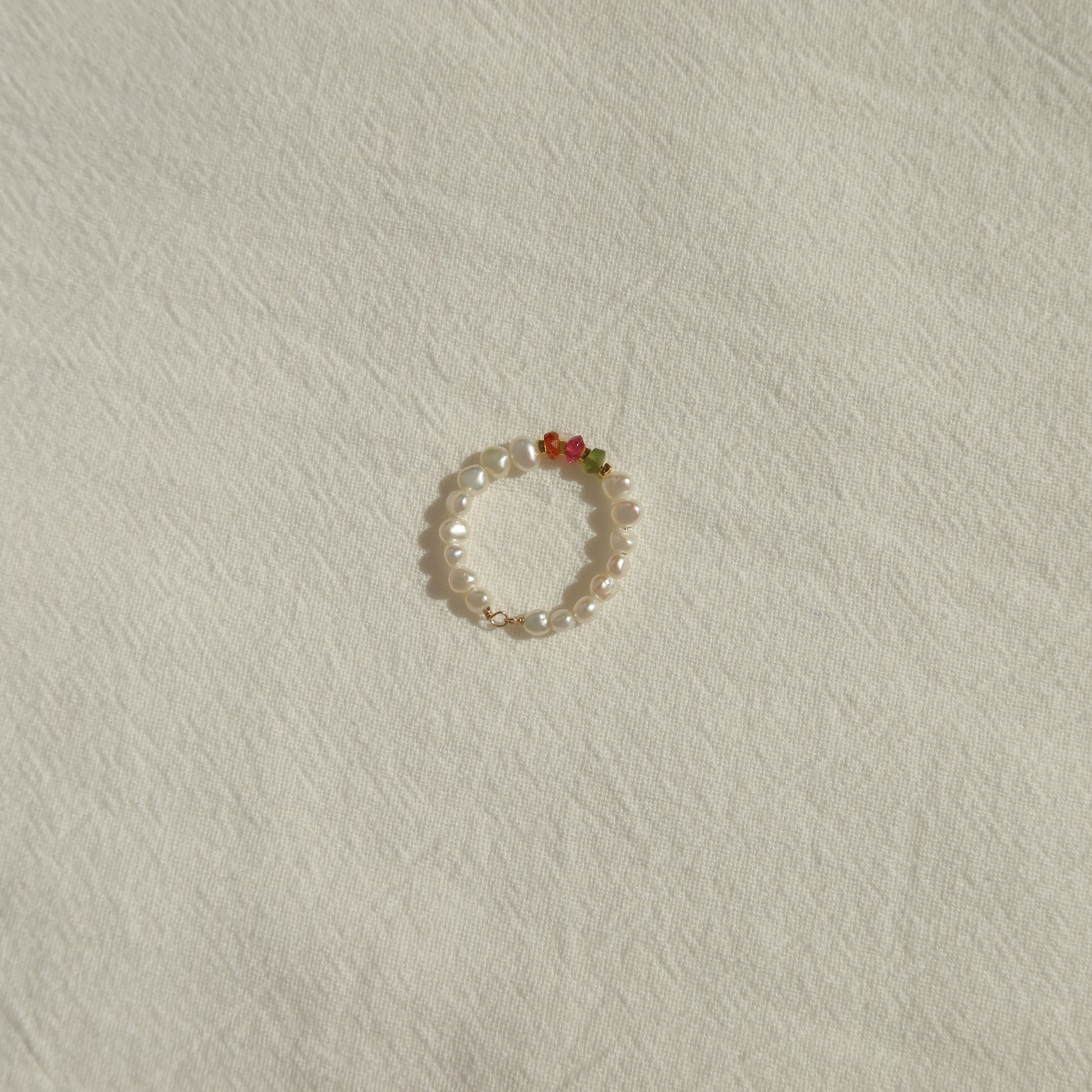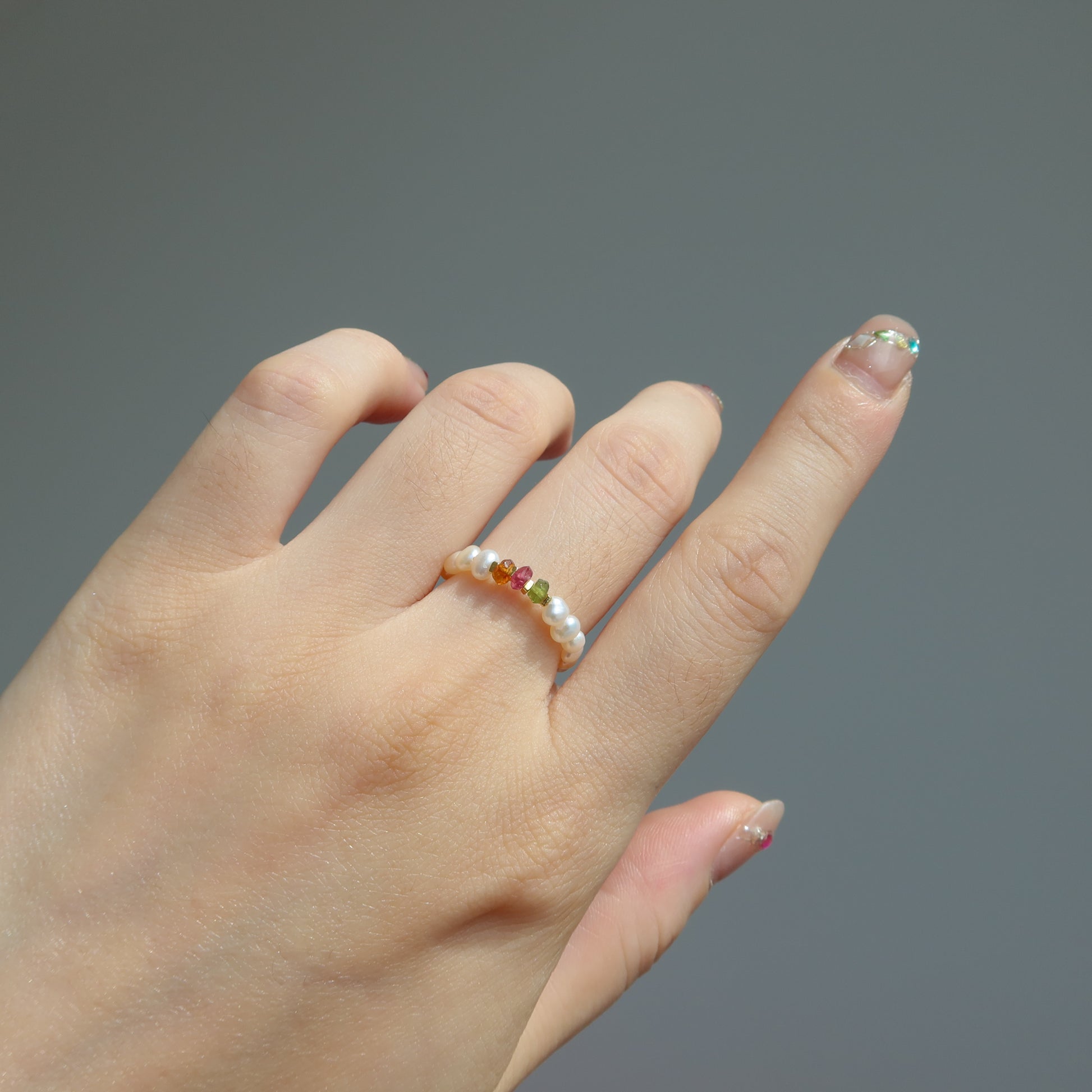 一枚手工打造的串珠戒指,镶嵌巴洛克淡水珍珠和碧玺水晶。这枚戒指完美平衡了精致与时尚。