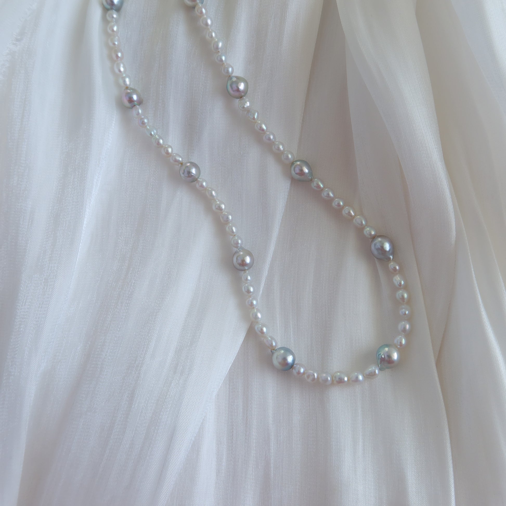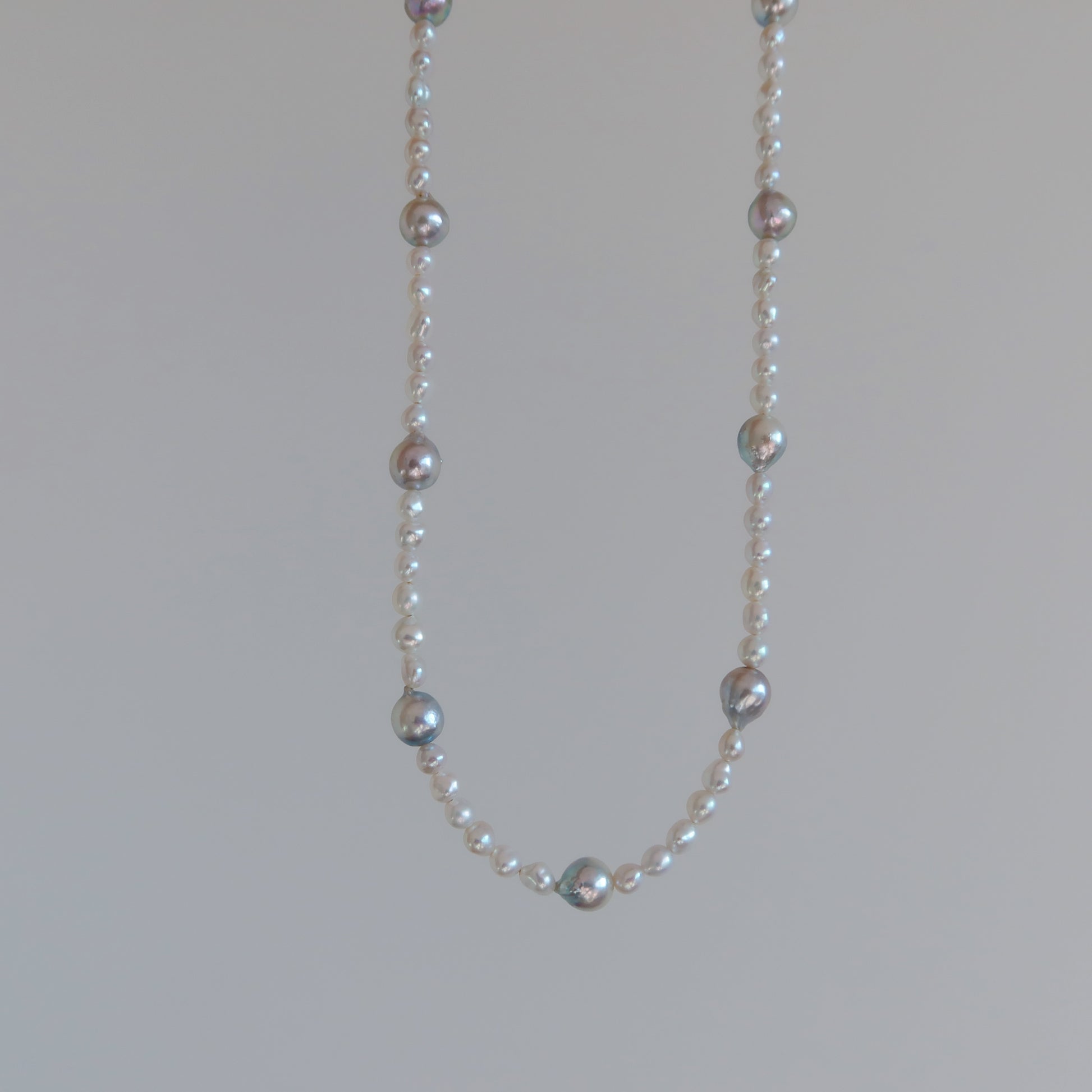 卫星珍珠项链,镶嵌蓝色巴洛克风格的阿古屋珍珠。我们甄选了银色调的小颗淡水珍珠,与蓝色阿古屋珍珠相得益彰,营造出一款冷色调的项链,适合即将到来的温暖天气。