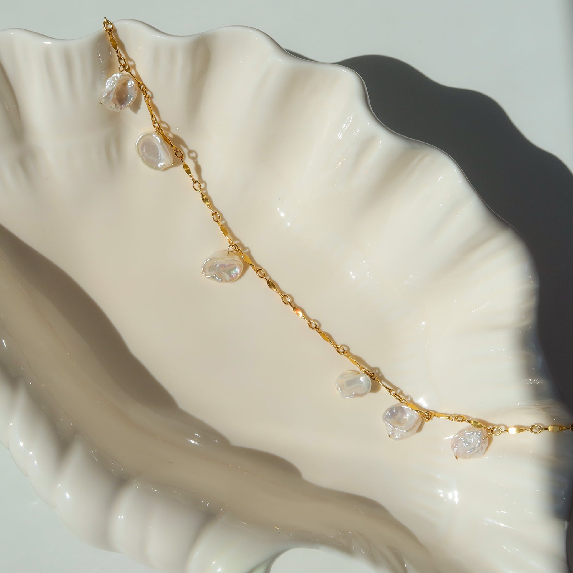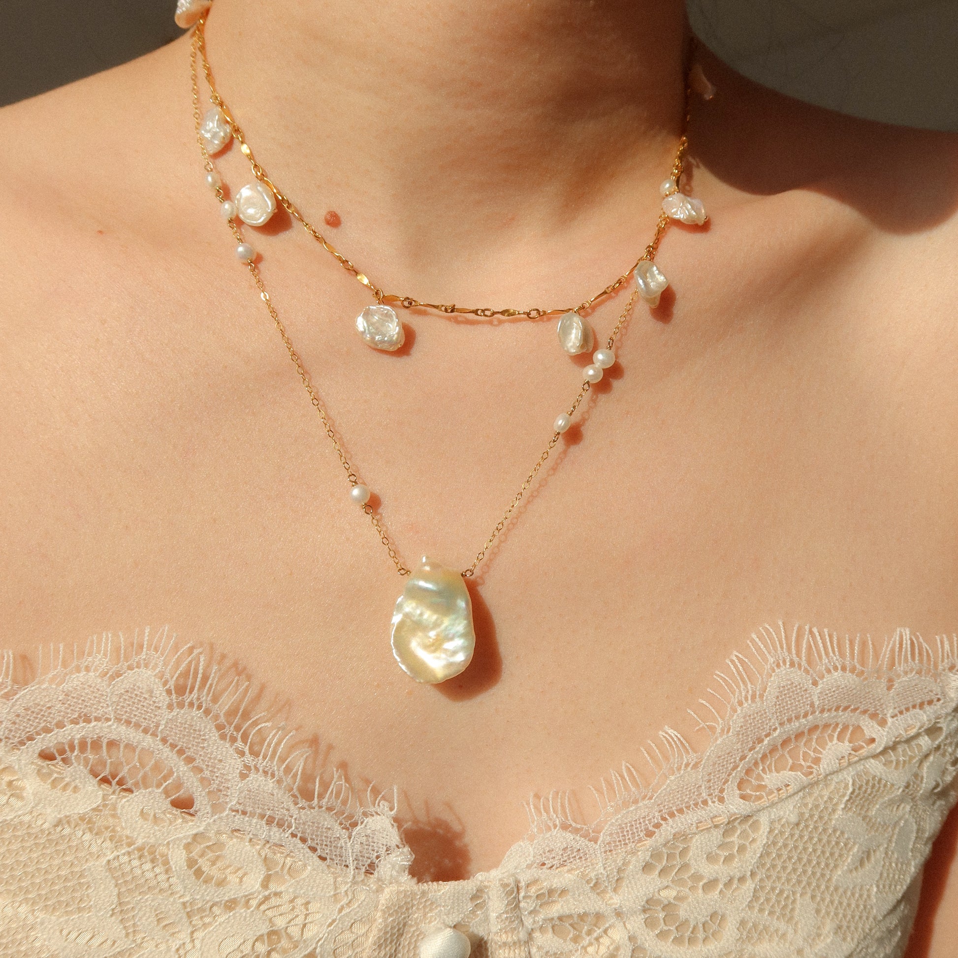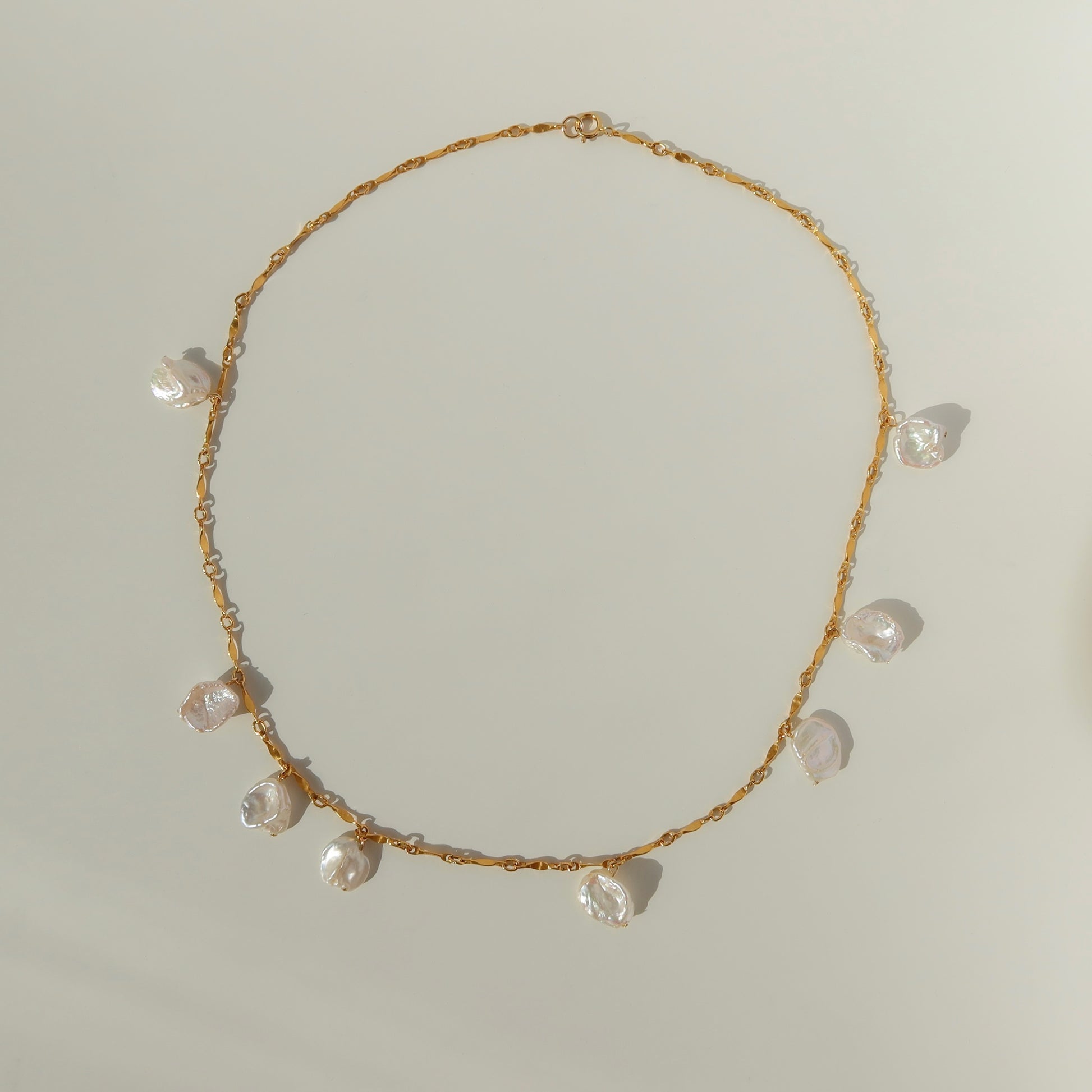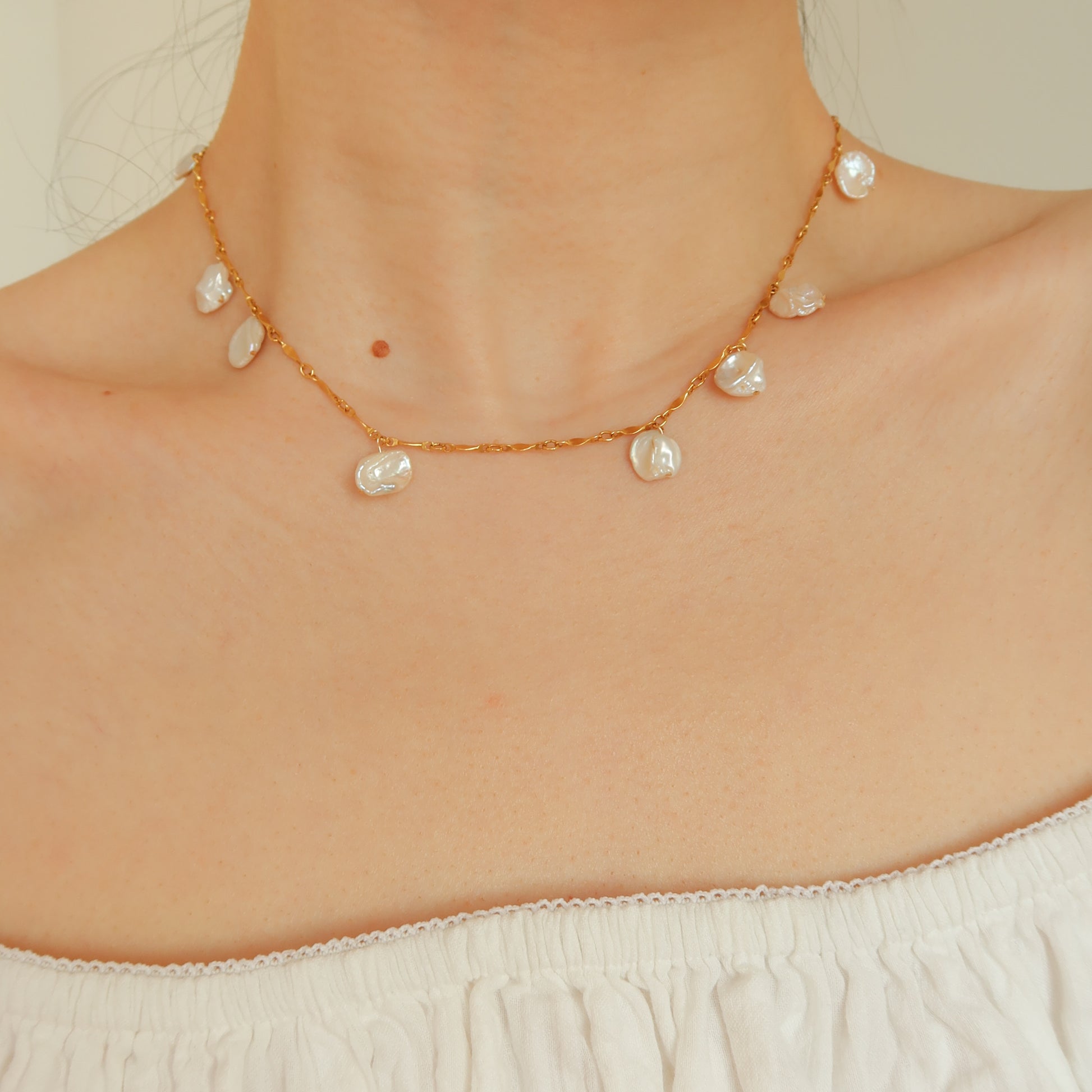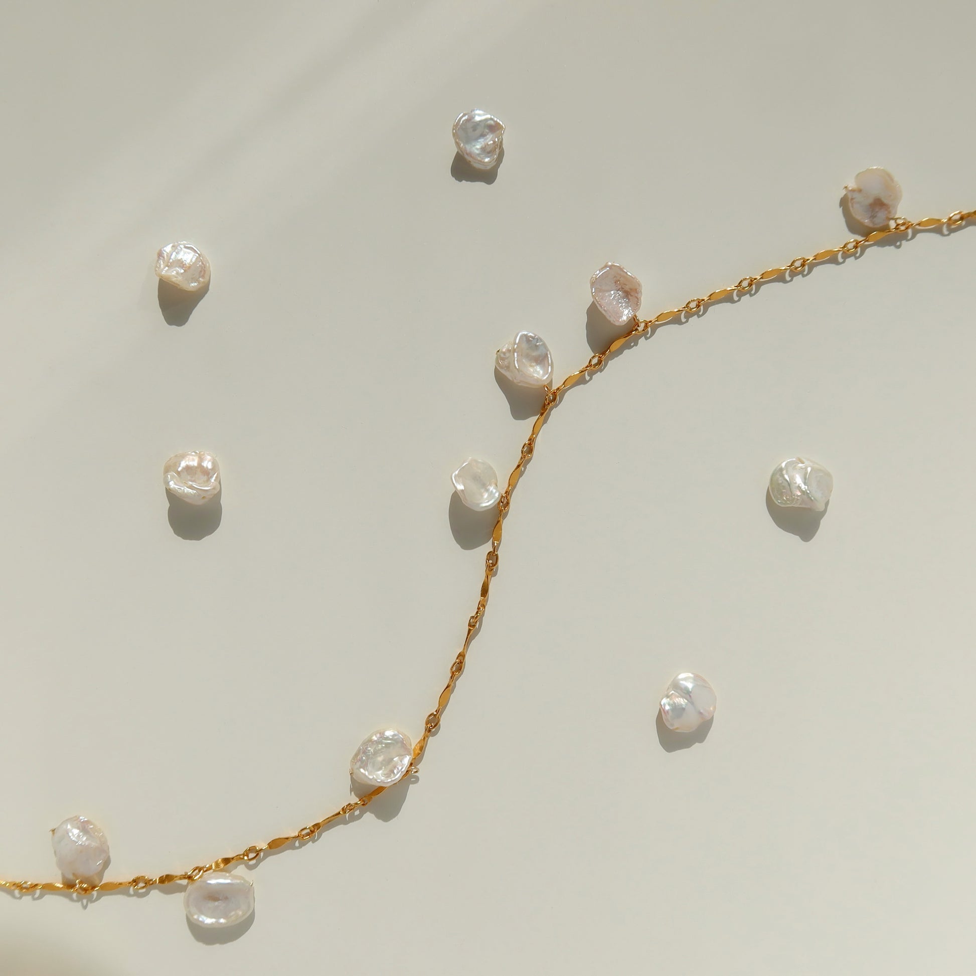 隆重推出我们精致的Mira 项链,采用我们精心挑选的 Keshi 珍珠手工打造,其光泽闪耀,花瓣般形状。珍珠的不对称排列营造出轻松的氛围,是您海滨度假的完美之选。这款项链柔美精致,可与其他项链叠戴,打造独特造型。
