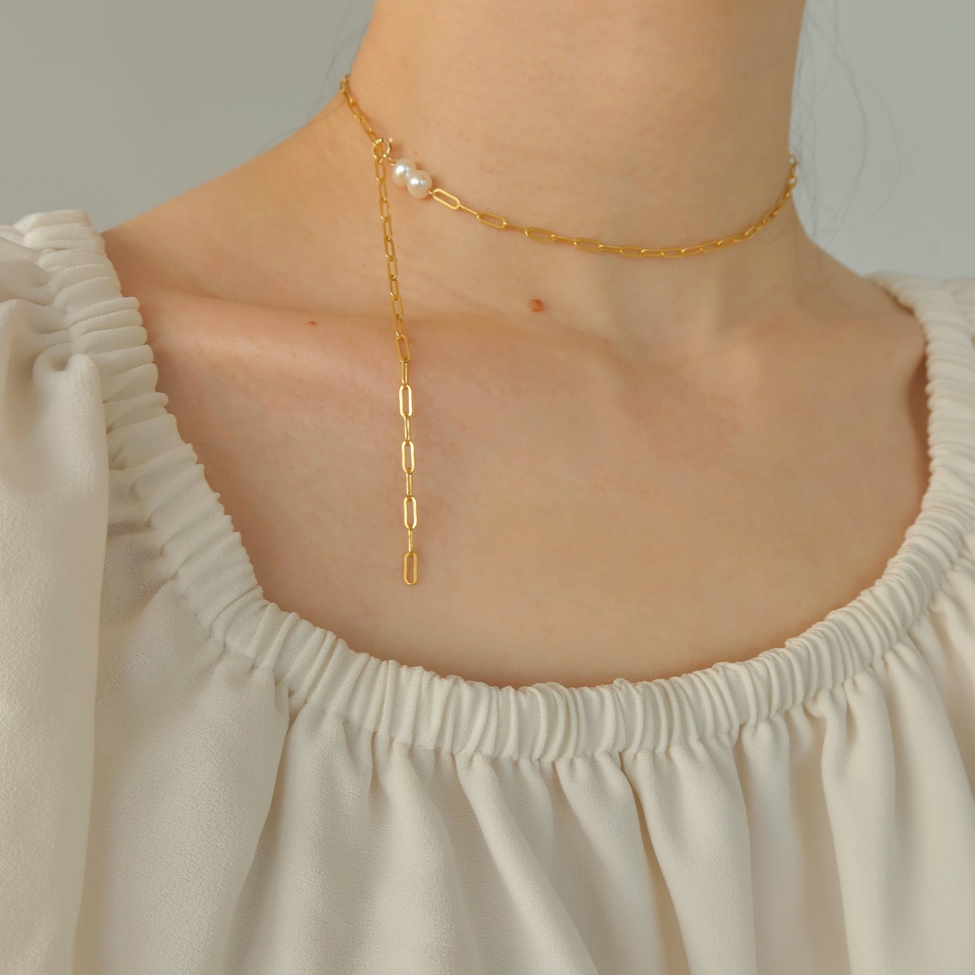 这款回形针项链饰有两颗珍珠,完美打造醒目大胆的造型。单戴或叠戴都完美无瑕!这款项链采用14K金包金和两颗淡水珍珠手工制作。正如图片所示,它可以有三种佩戴方式,使其成为我们店里最百搭的项链之一。