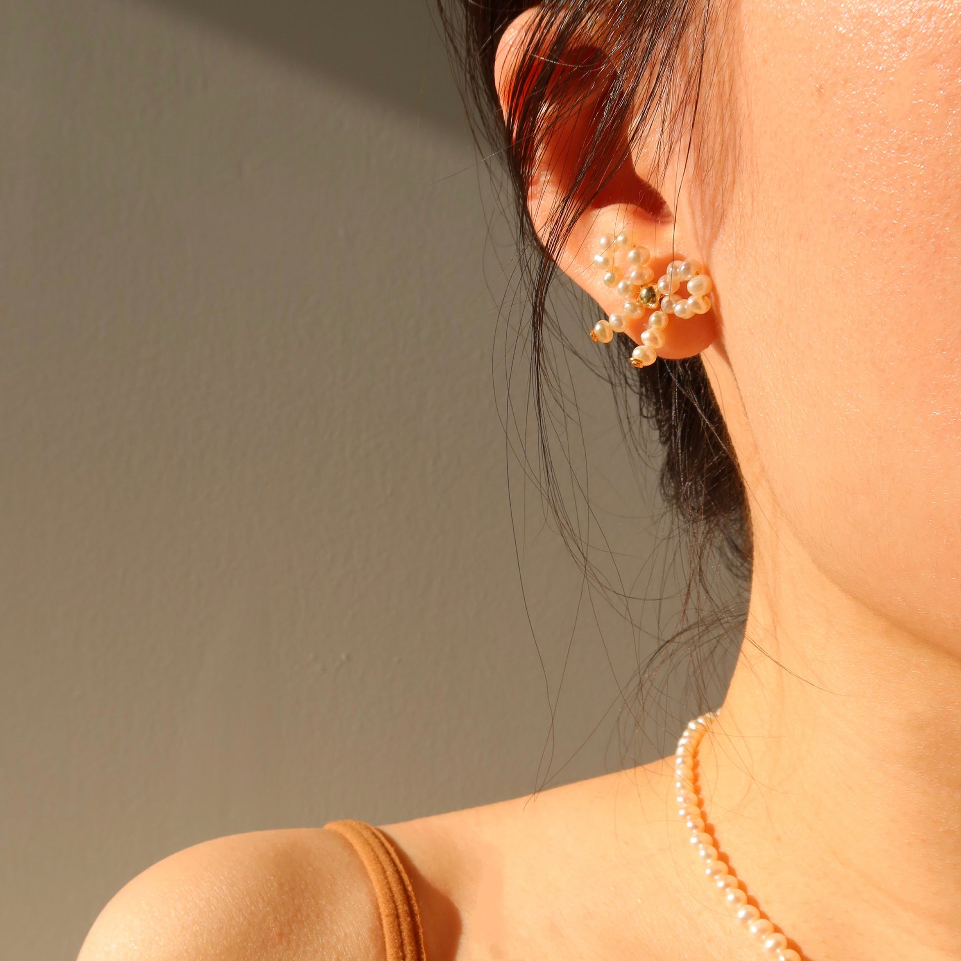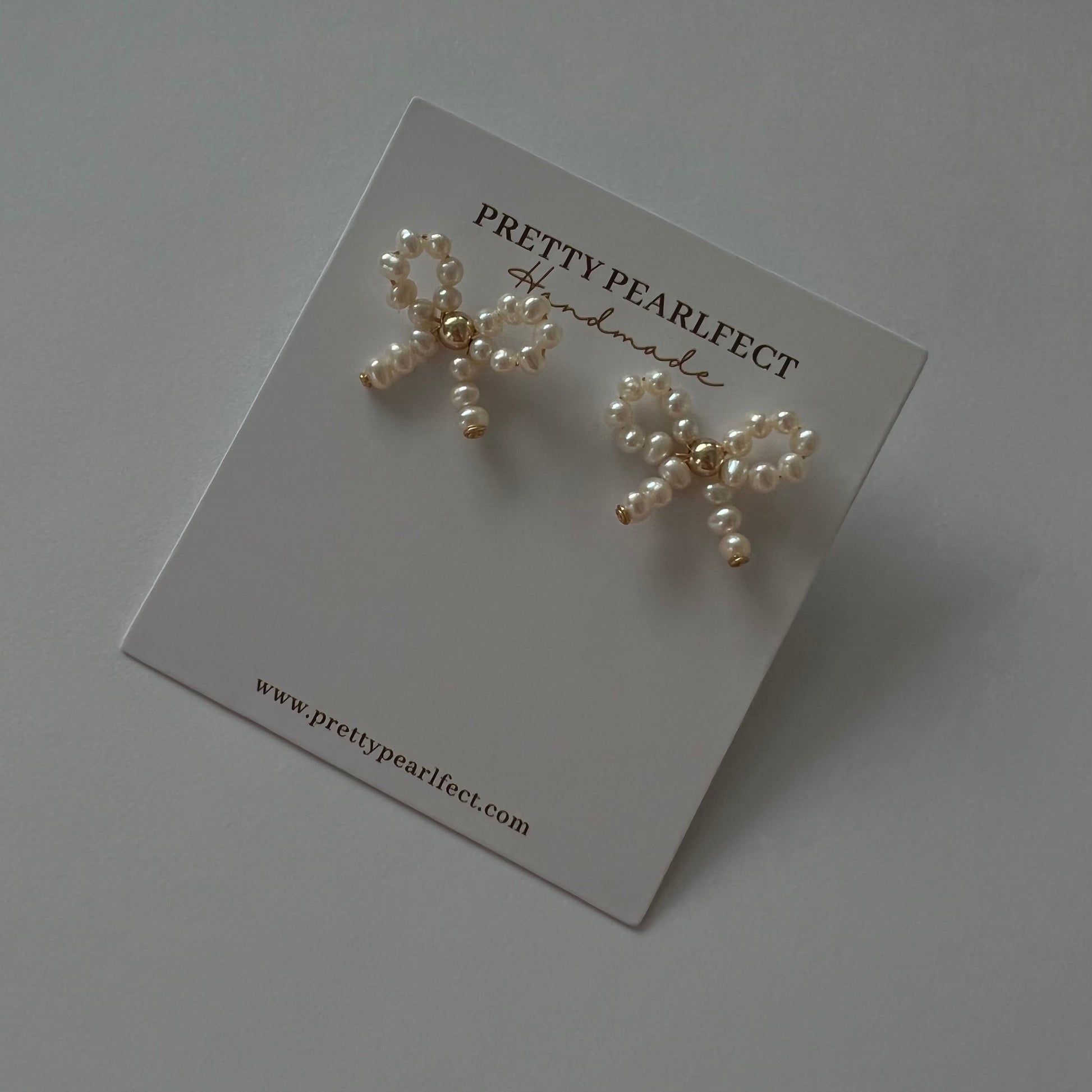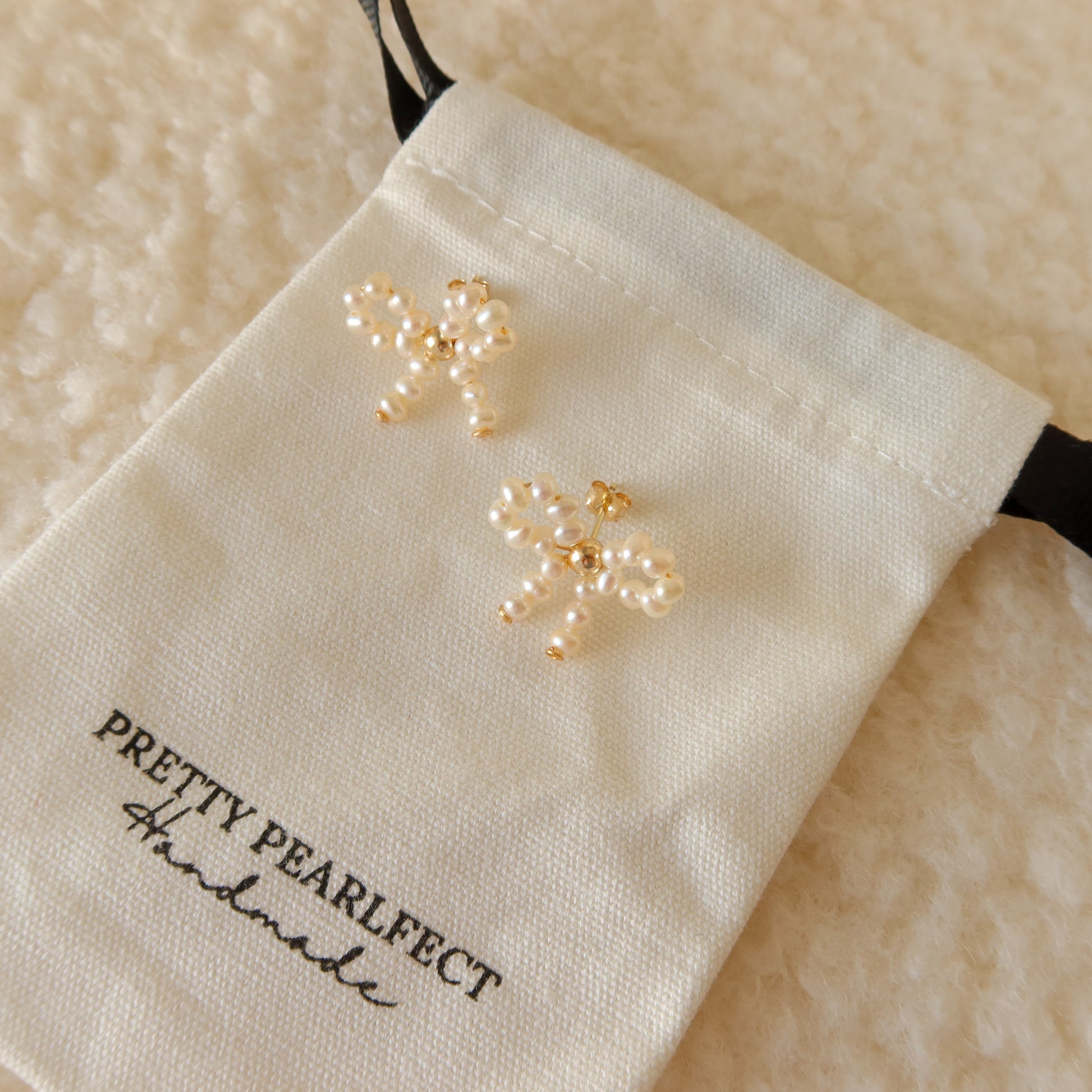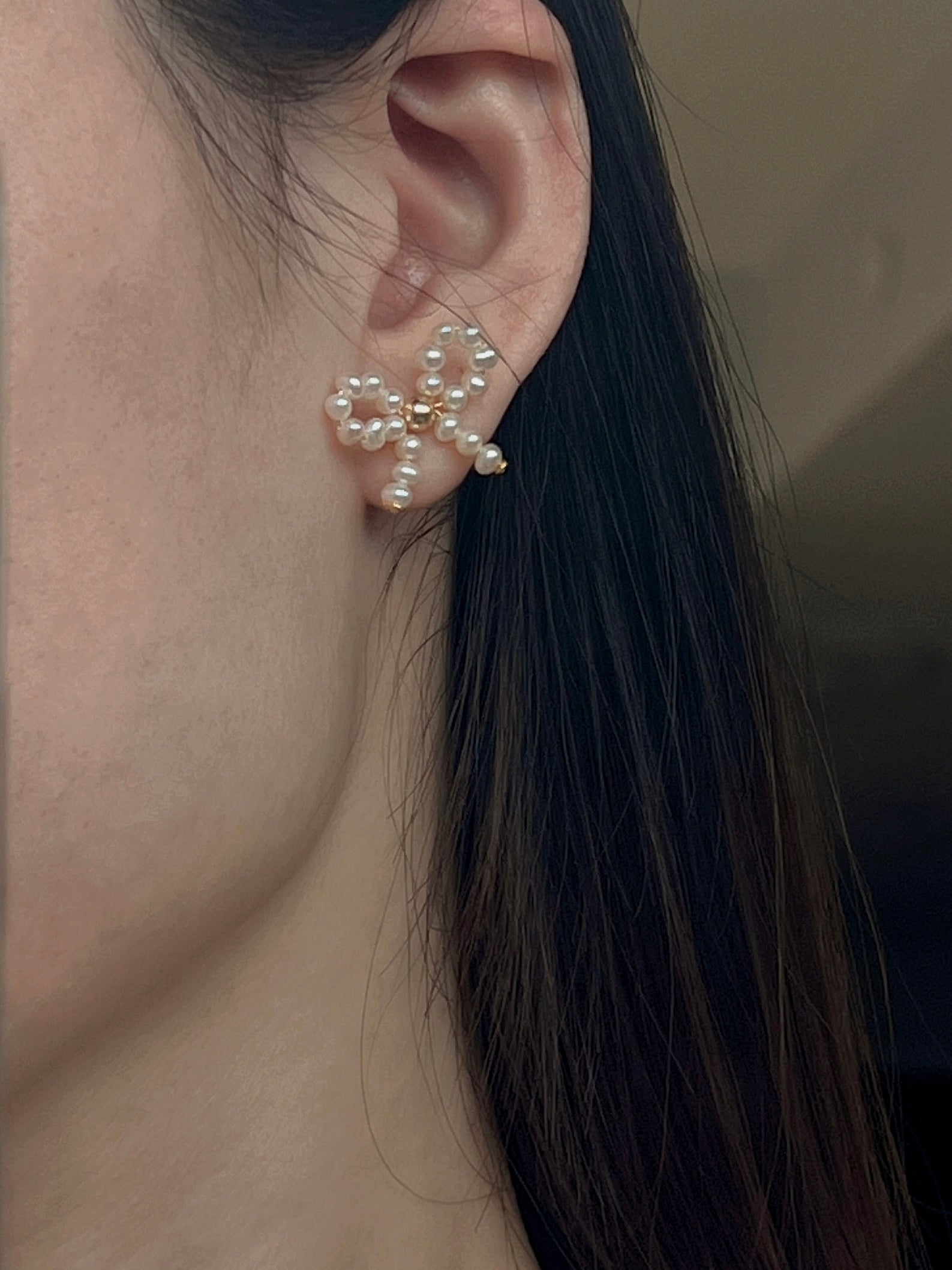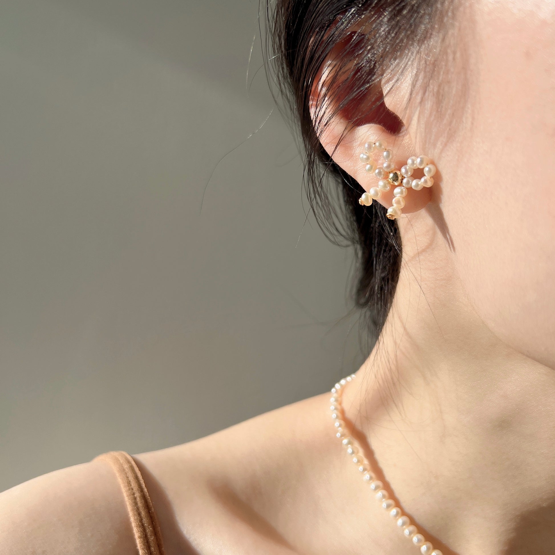 耳朵上系着丝带。这款蝴蝶结耳钉可爱又优雅,耳钉采用金属线缠绕,点缀着迷你淡水珍珠。柔软的金属线使其灵活多变,您可以轻松弯曲耳钉,增添个人风格。