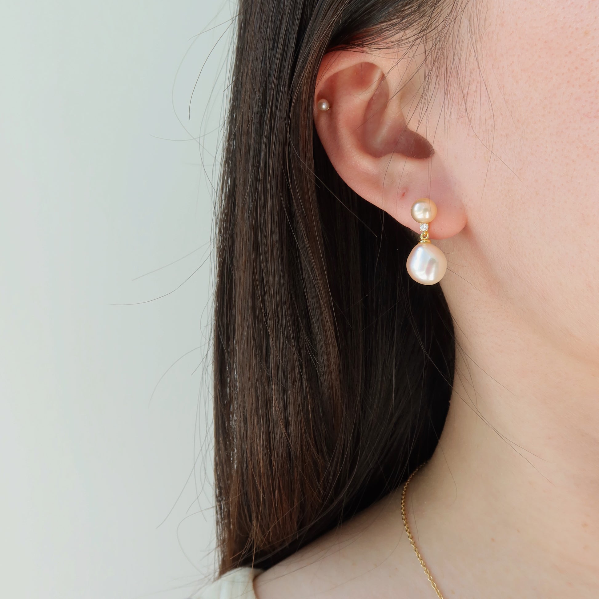 这款珍珠耳钉采用有机形状的巴洛克珍珠手工制作而成。我们精心挑选了这些粉色薰衣草珍珠,并将它们搭配在一起,打造出这款独一无二的耳环。为您的夏日造型增添一些色彩!
