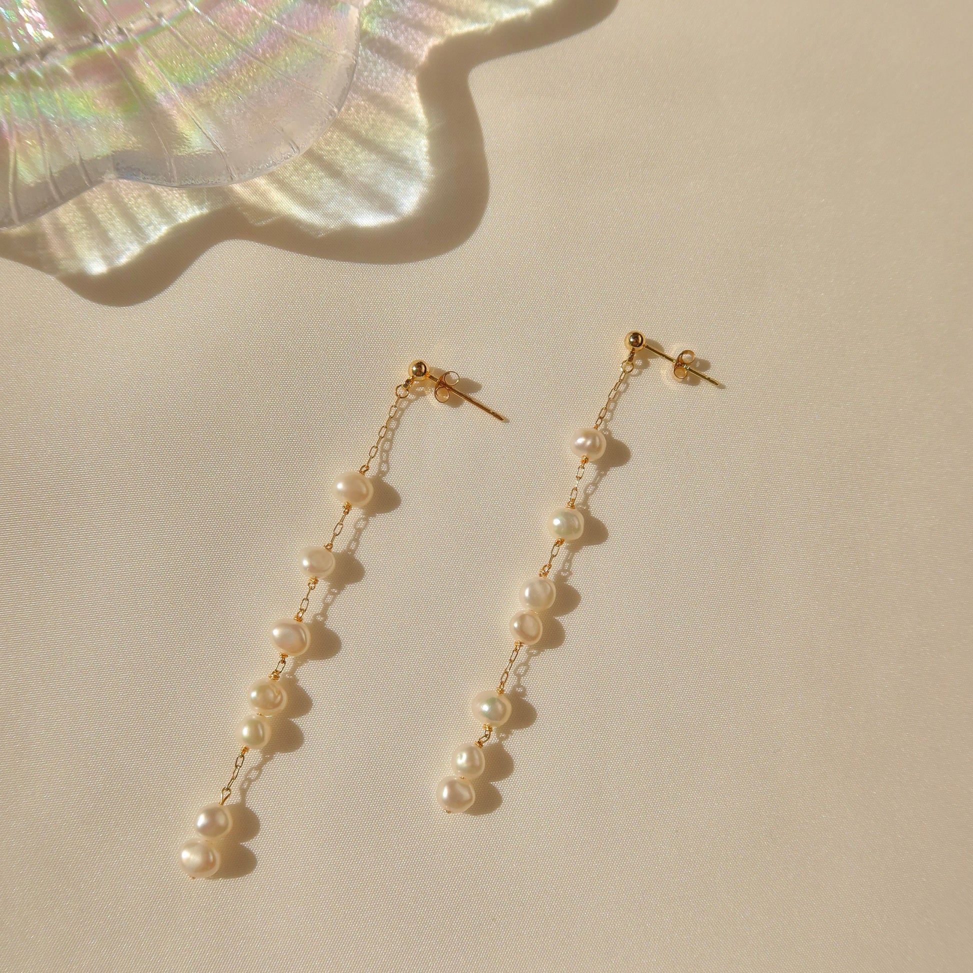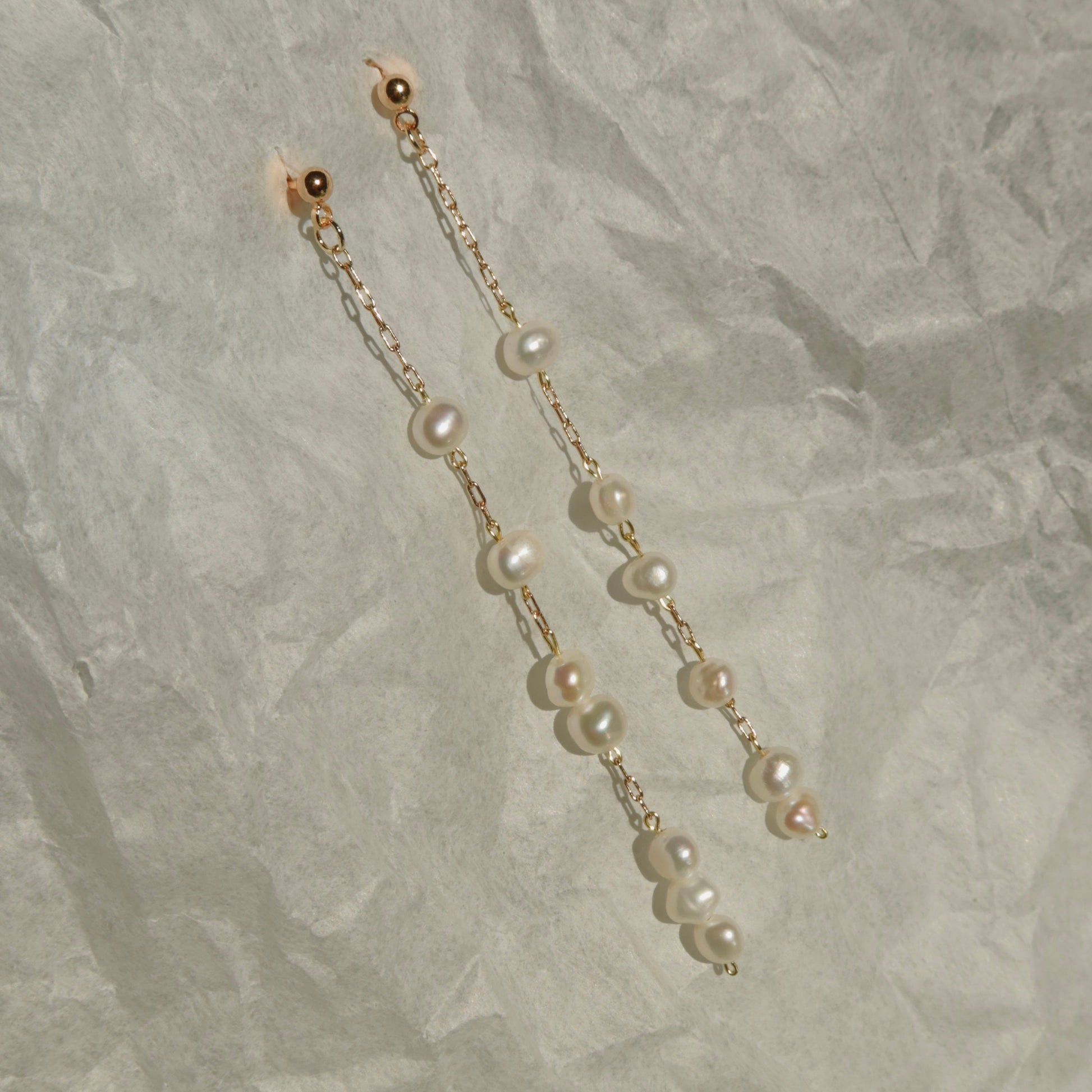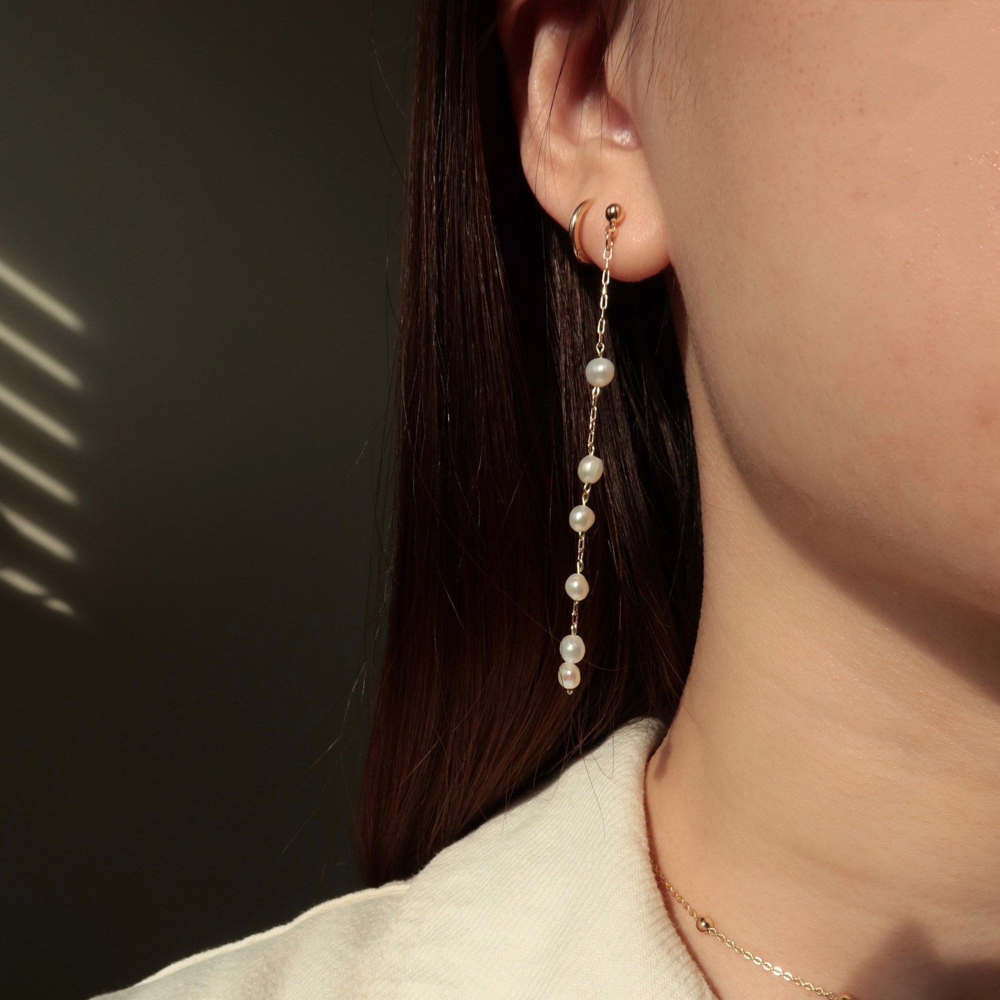 这款雨滴耳环以独特的手工打造,倾注着热情与爱意。巴洛克珍珠不均匀地分布在14K镀金精致链条上,构成了雨滴的主题。每颗巴洛克珍珠均由手工挑选,并以不同的间距镶嵌在链条上。这款精致优雅的长款珍珠耳环适合各种场合佩戴。