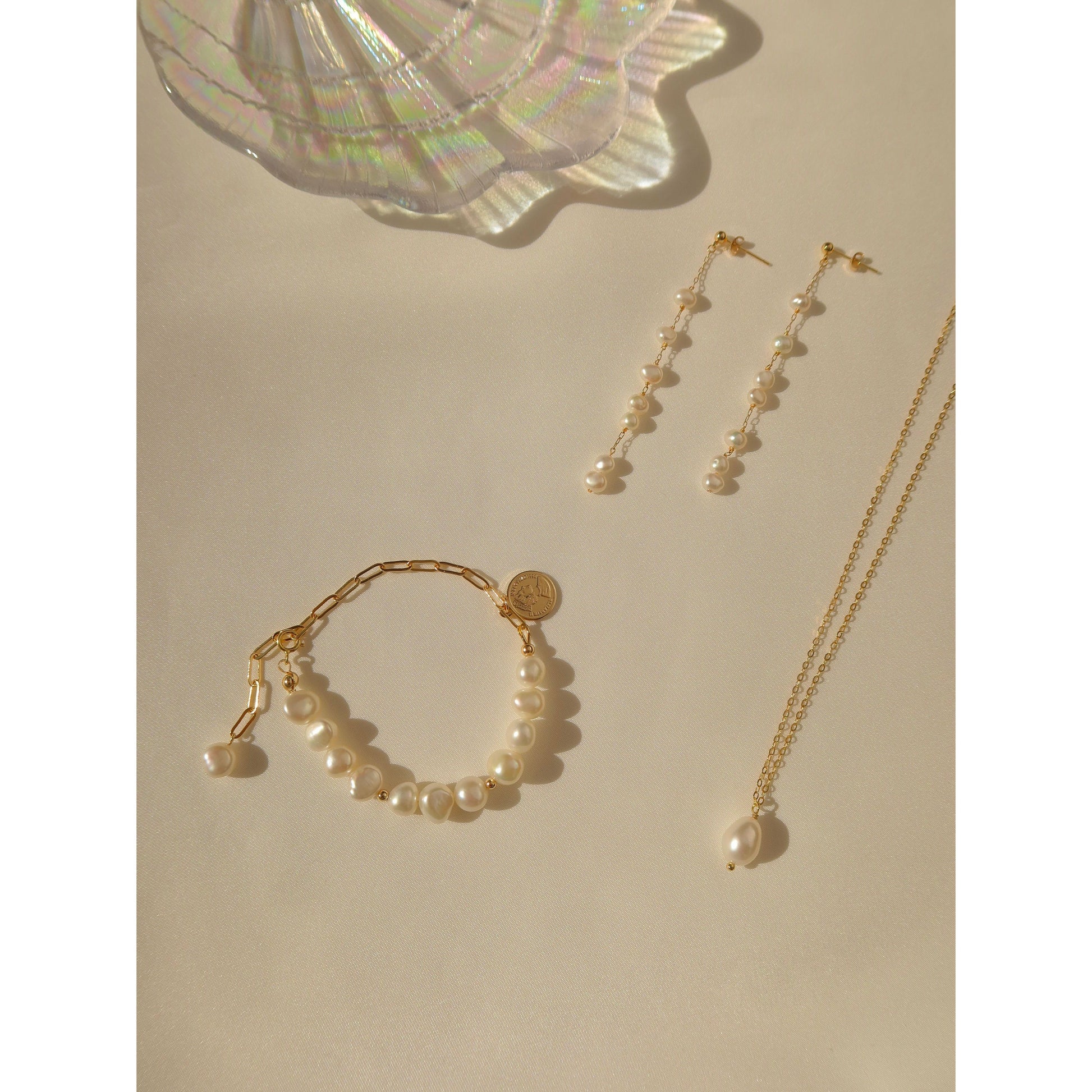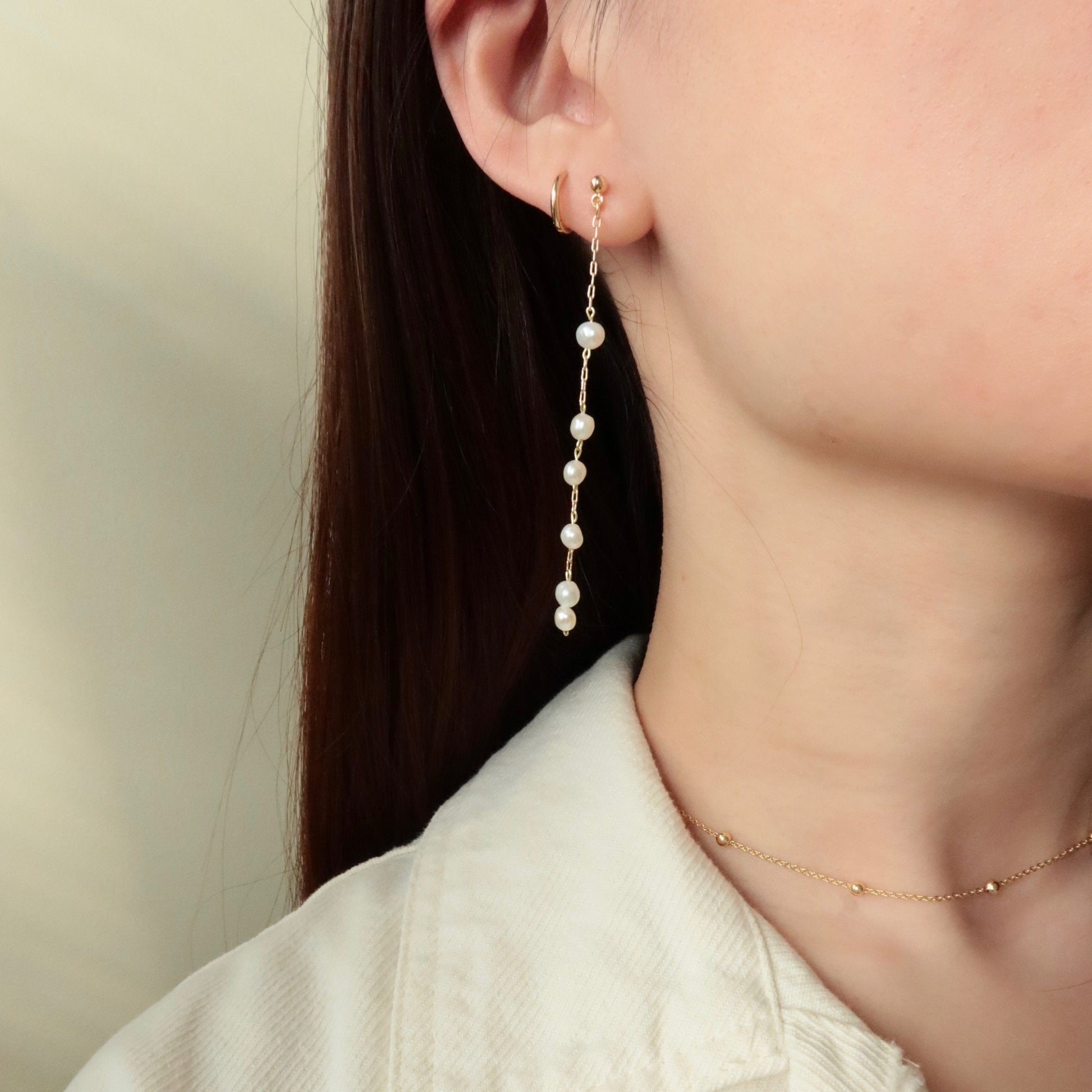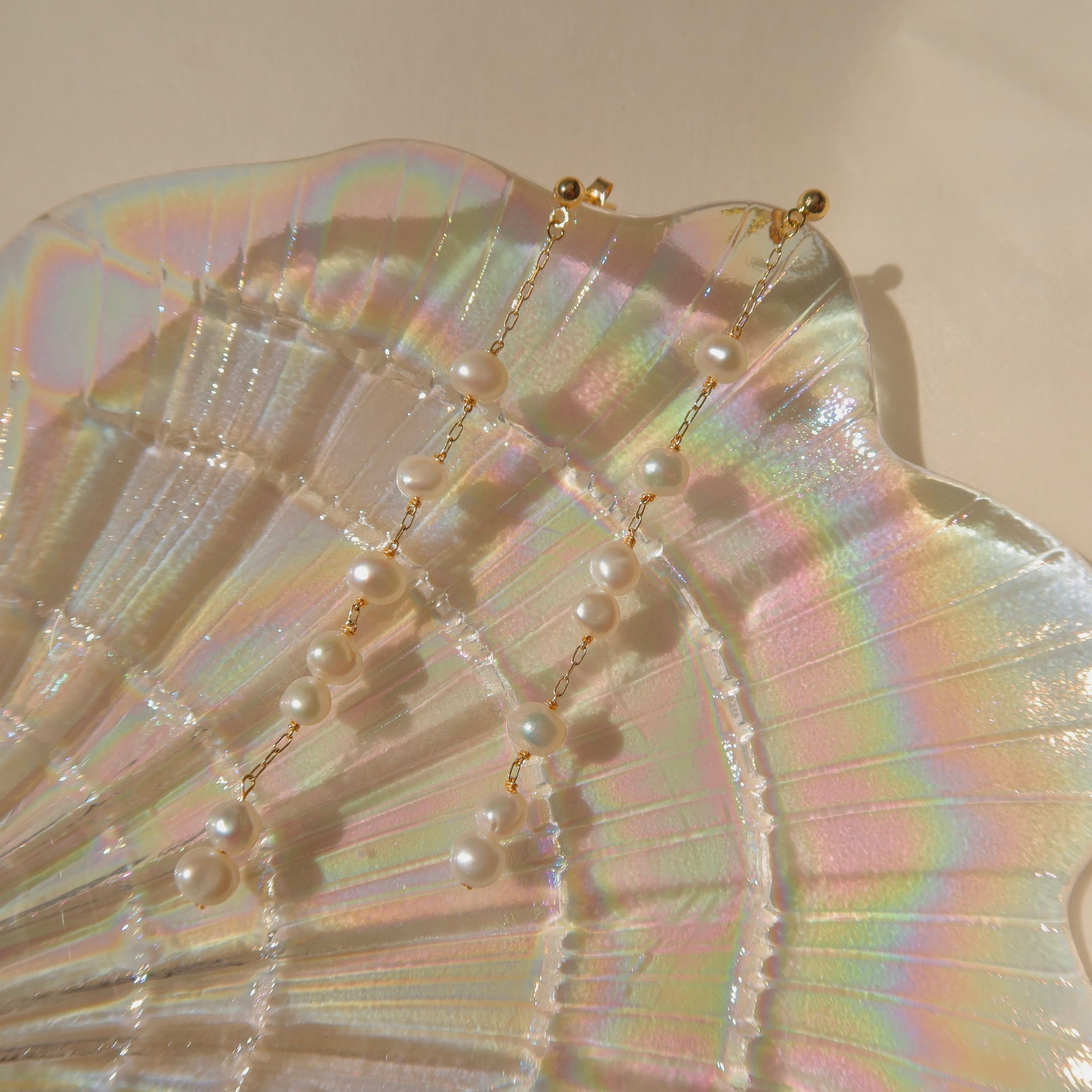 这款雨滴耳环以独特的手工打造,倾注着热情与爱意。巴洛克珍珠不均匀地分布在14K镀金精致链条上,构成了雨滴的主题。每颗巴洛克珍珠均由手工挑选,并以不同的间距镶嵌在链条上。这款精致优雅的长款珍珠耳环适合各种场合佩戴。