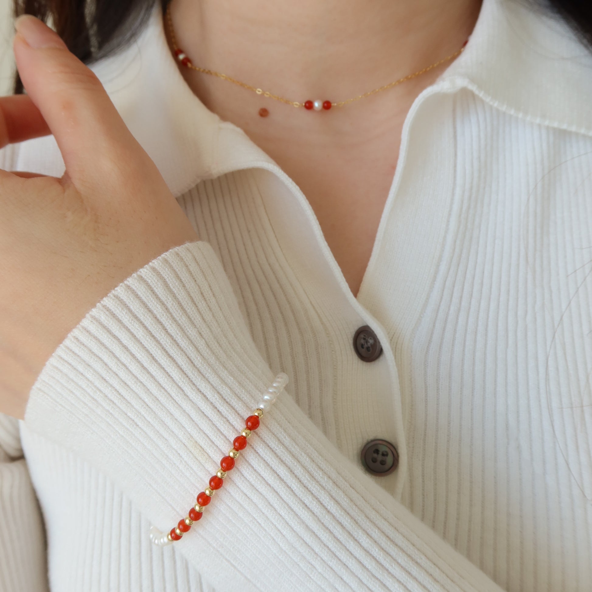 用红玛瑙系列庆祝农历新年。这款手链采用淡水珍珠和红玛瑙水晶手工打造。用这款手链点燃节日气氛!