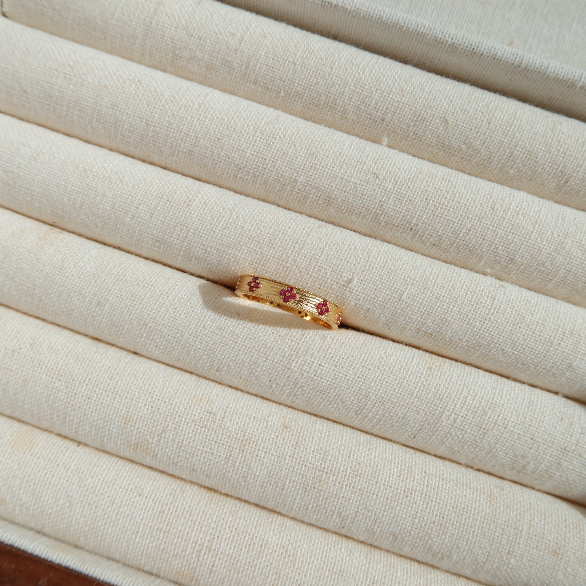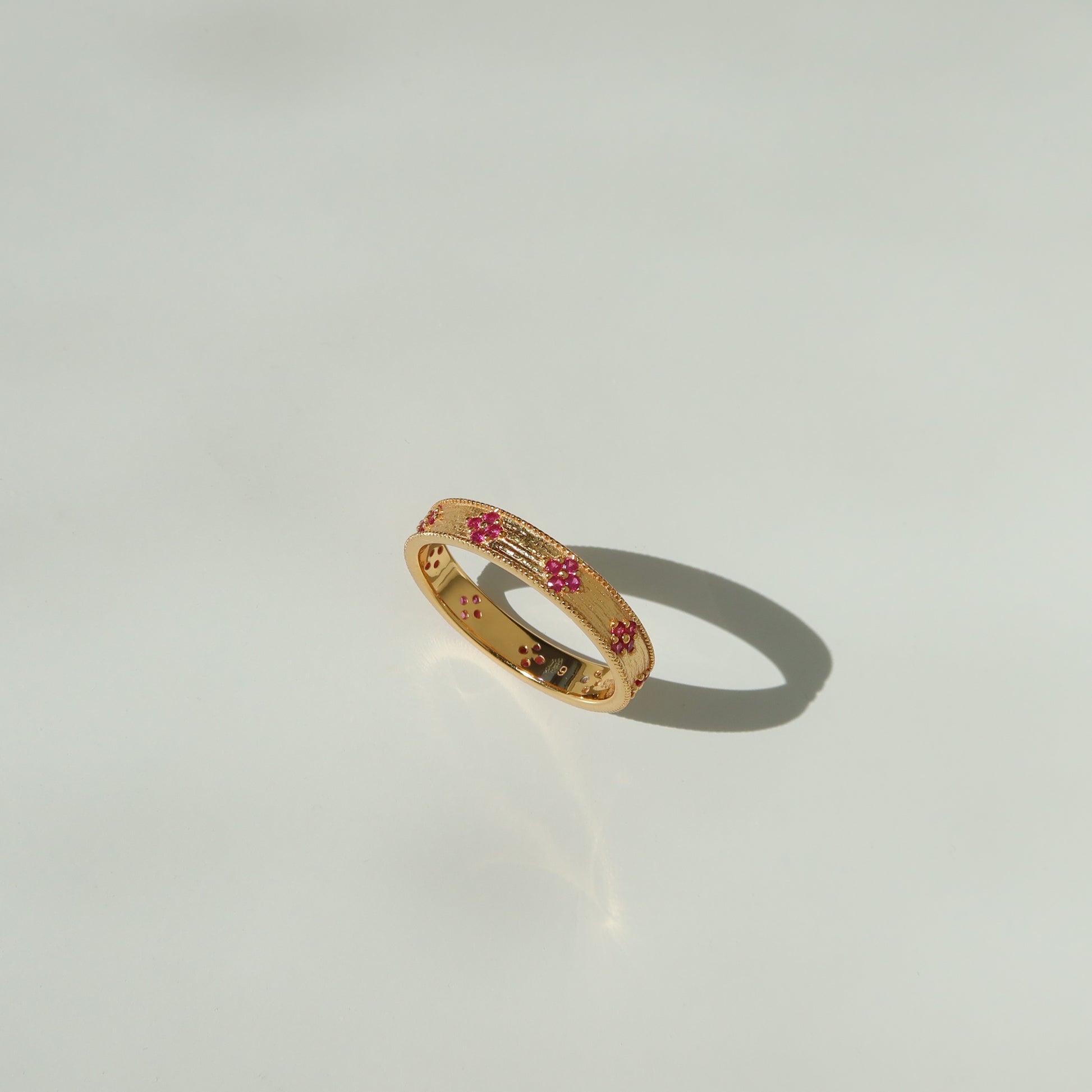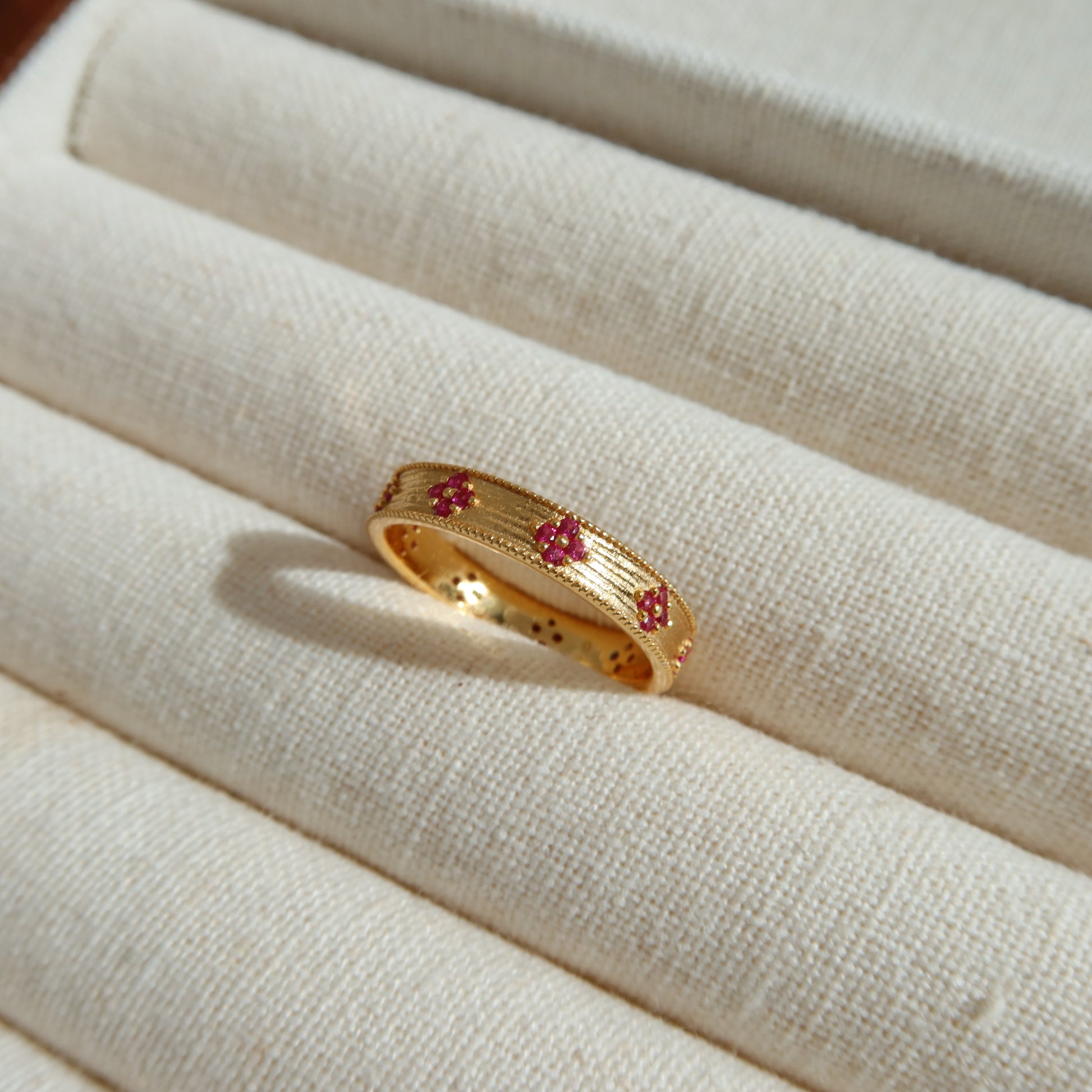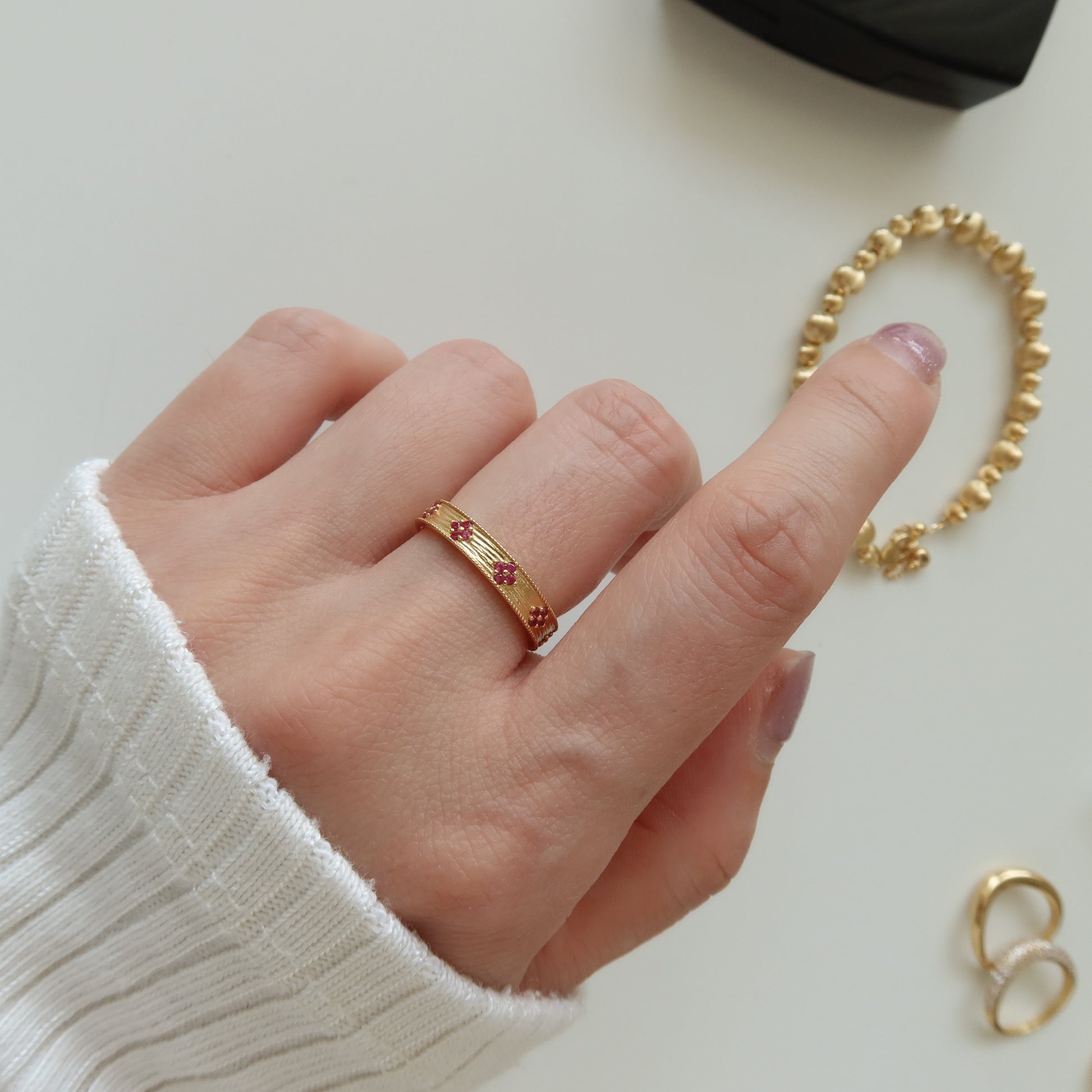 简约中略带大胆。这款戒指质地柔和,镶嵌着一颗颗细小的红宝石,闪耀着淡淡的光芒,却又恰到好处。浓郁的红色宝石更添一抹亮色,既可叠戴,亦可单独佩戴,彰显精致格调。