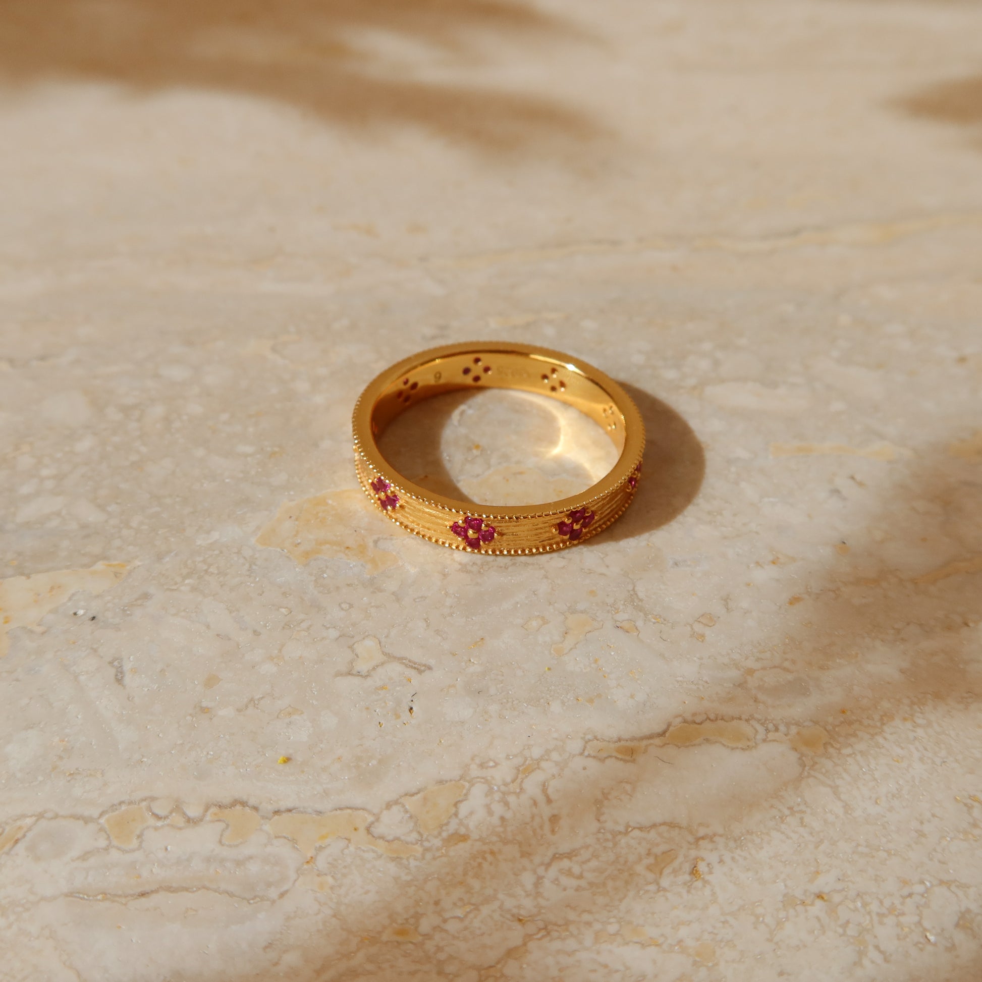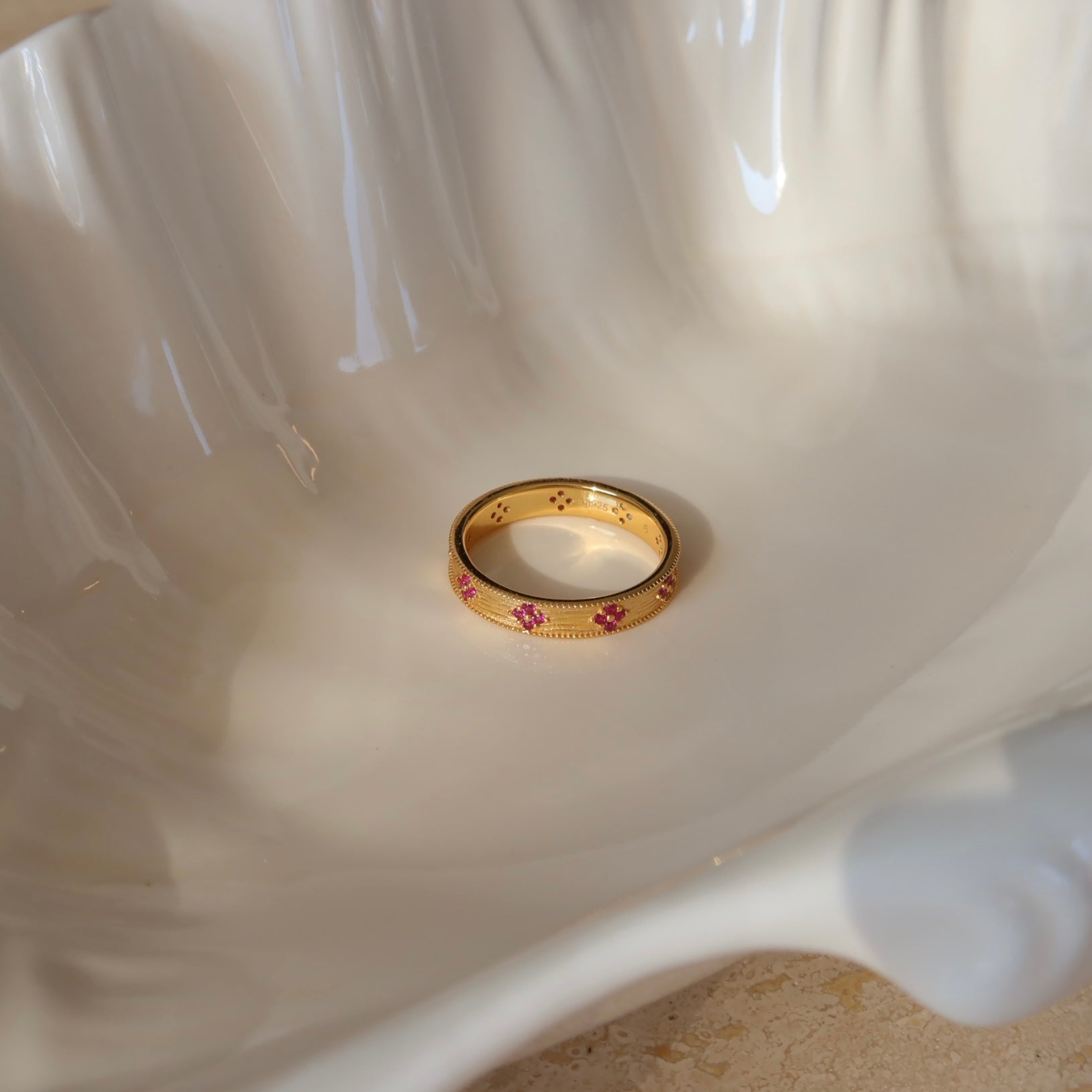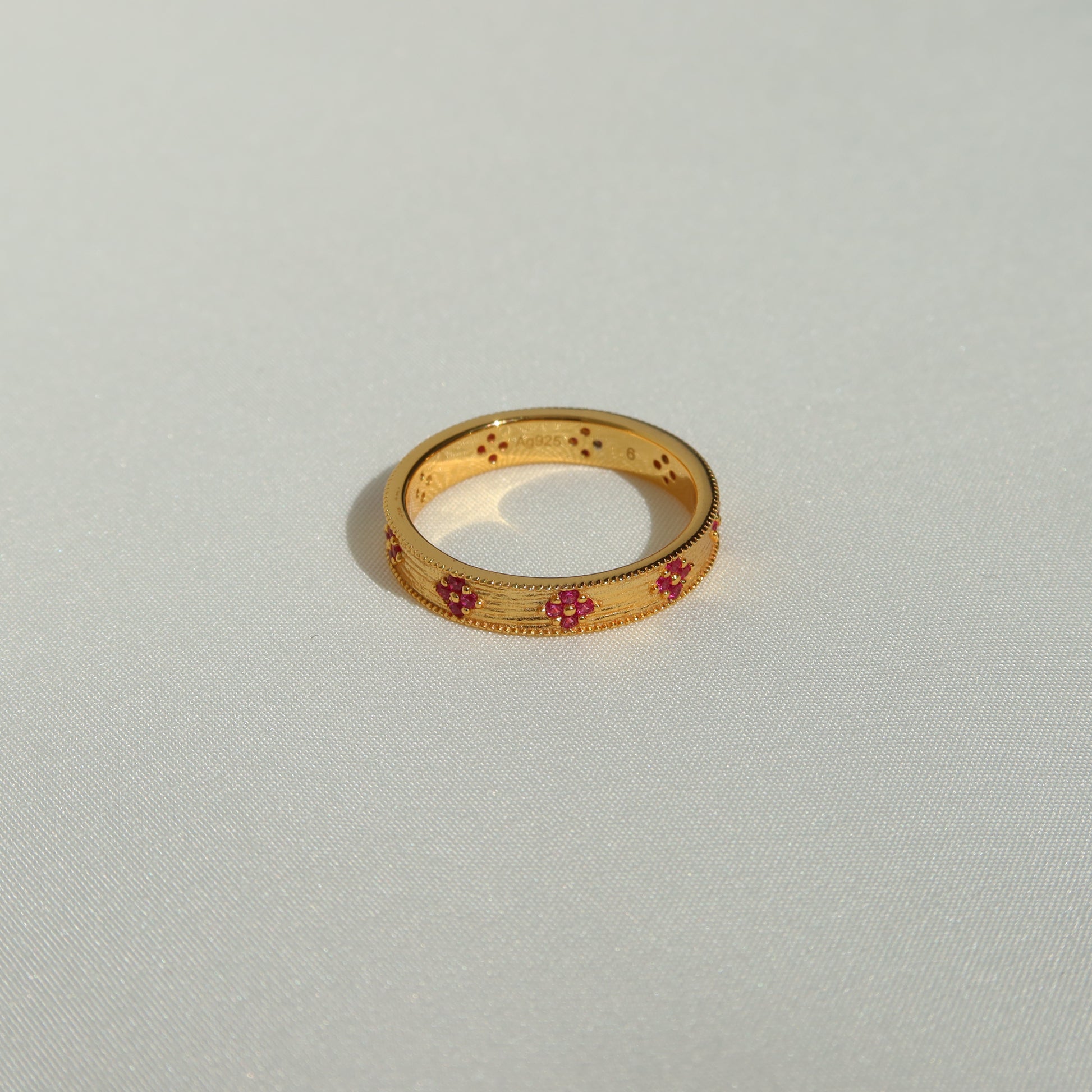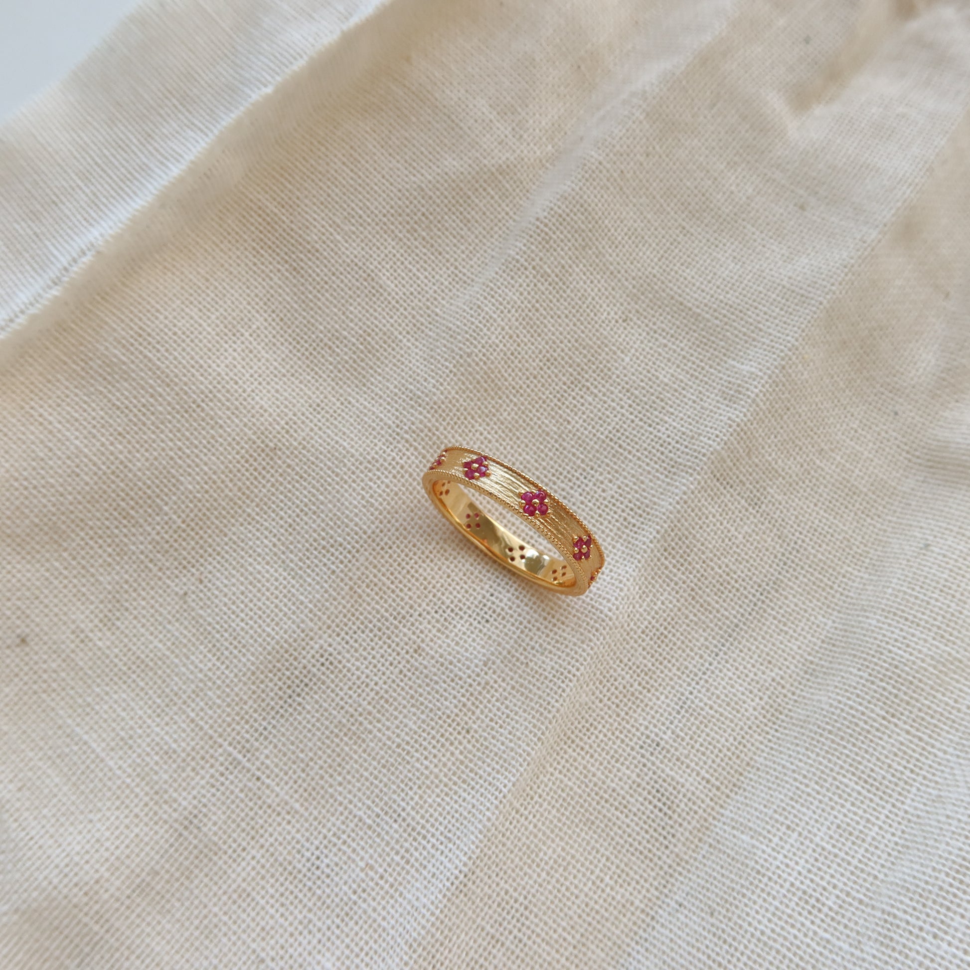 简约中略带大胆。这款戒指质地柔和,镶嵌着一颗颗细小的红宝石,闪耀着淡淡的光芒,却又恰到好处。浓郁的红色宝石更添一抹亮色,既可叠戴,亦可单独佩戴,彰显精致格调。