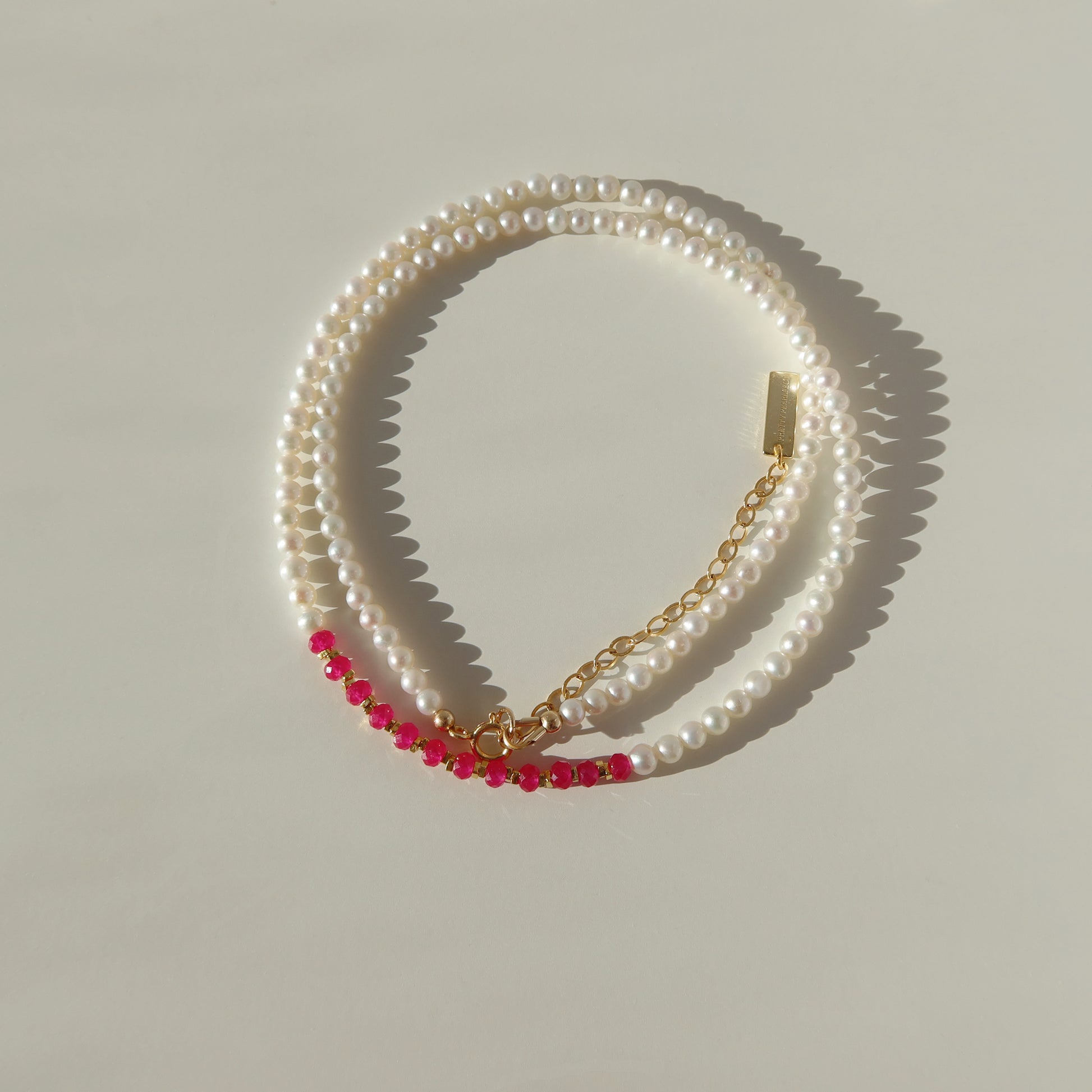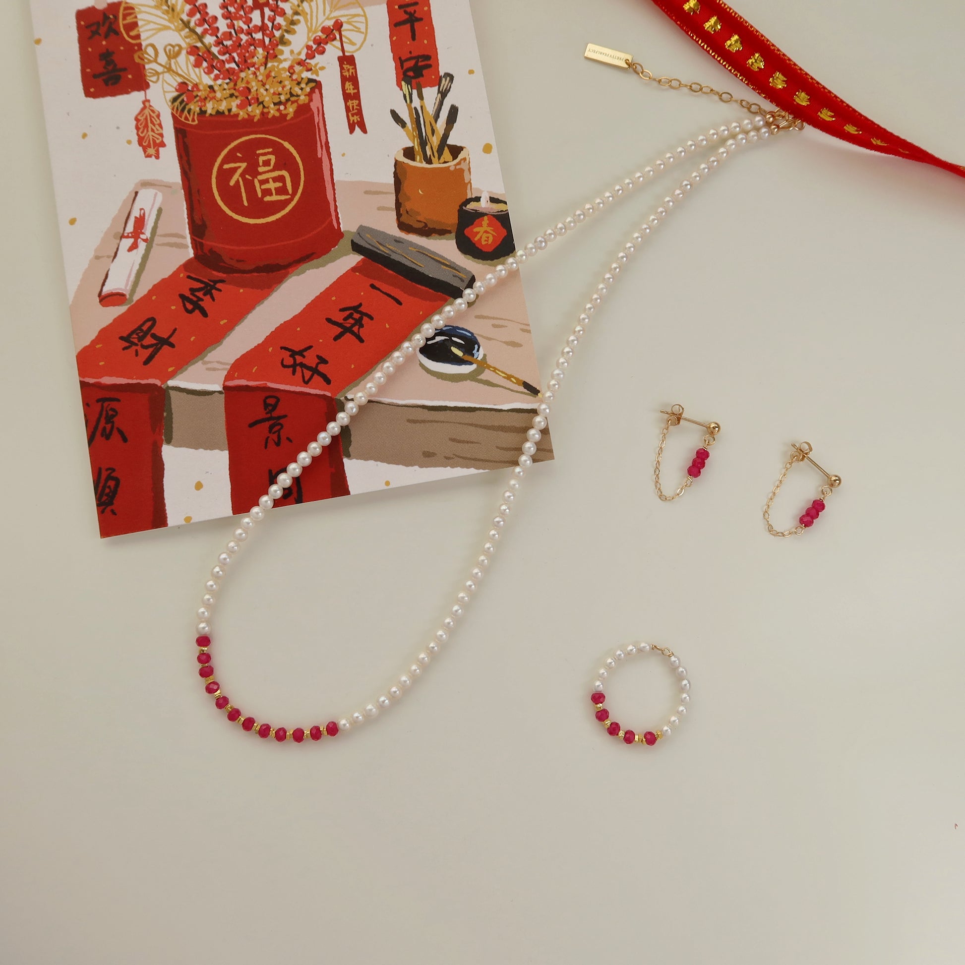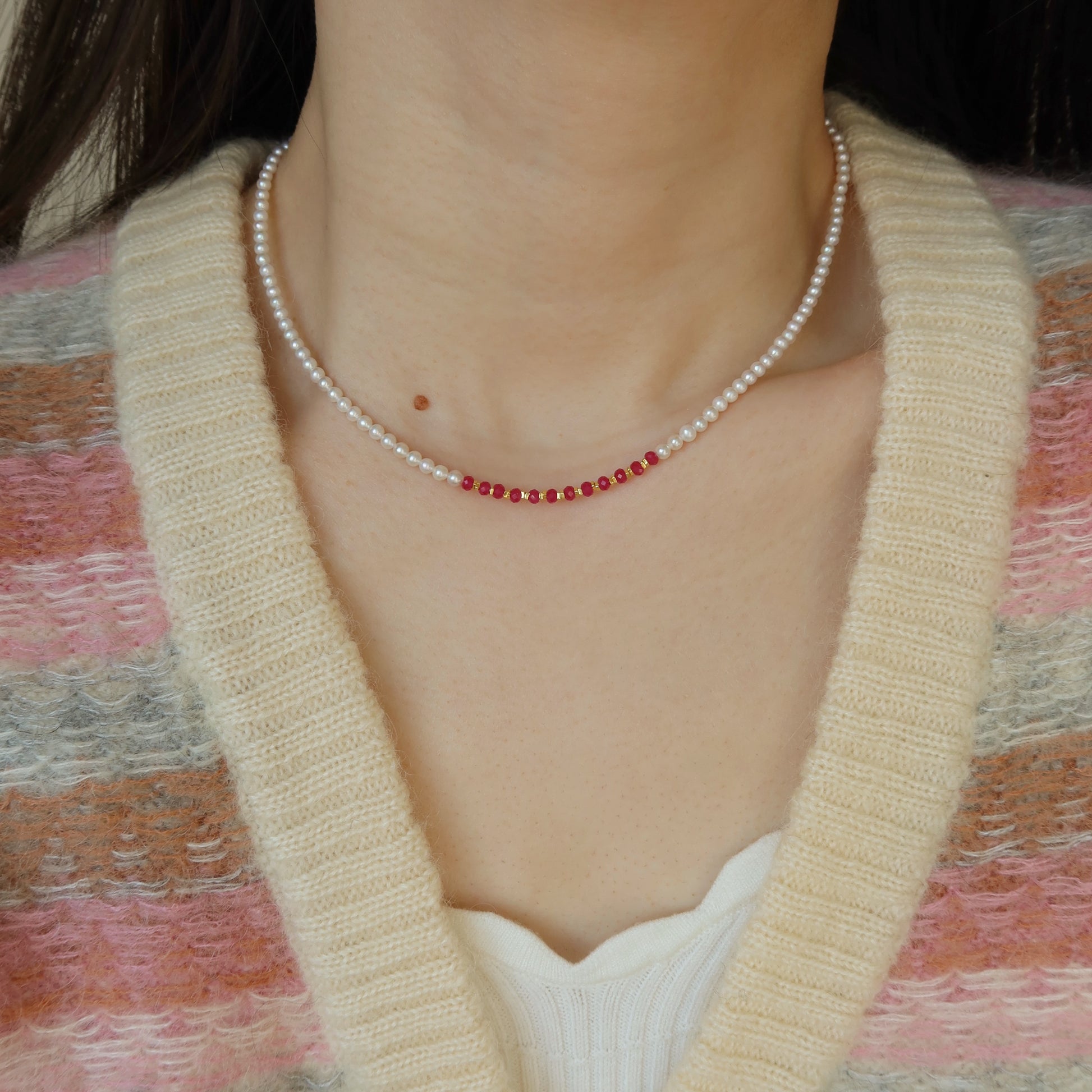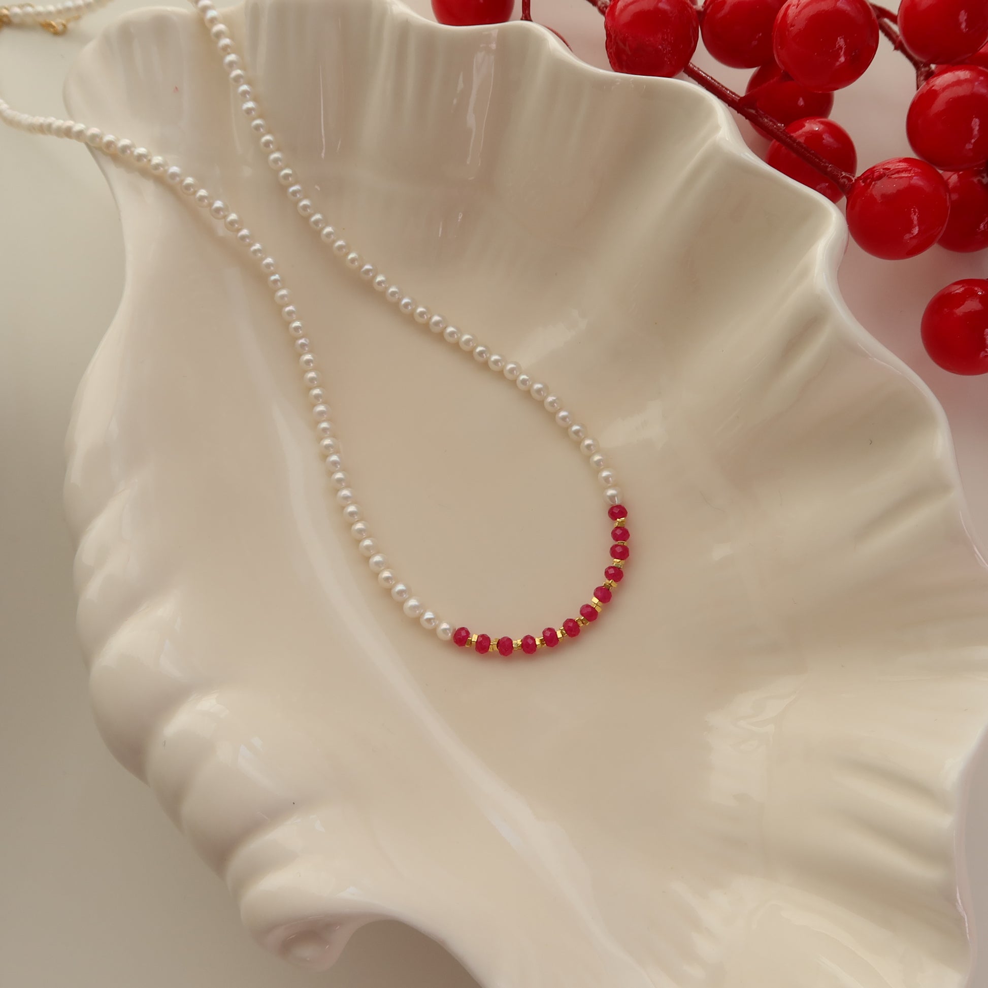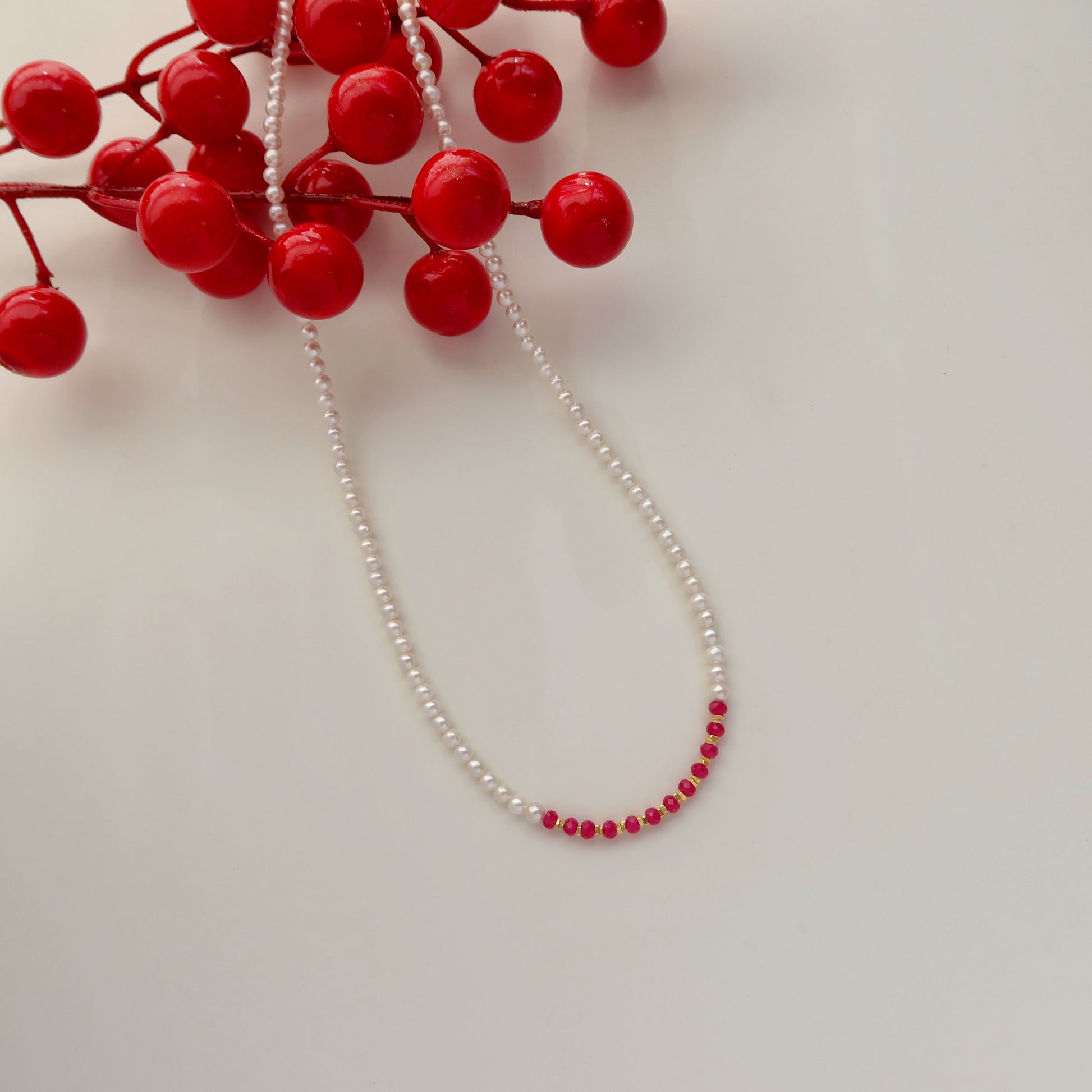 这款红宝石珍珠项链为您的珠宝收藏增添一抹节日气息。项链以迷人的迷你圆形珍珠和多面红宝石交相辉映,点缀着精致的金珠,更添一抹精致优雅。