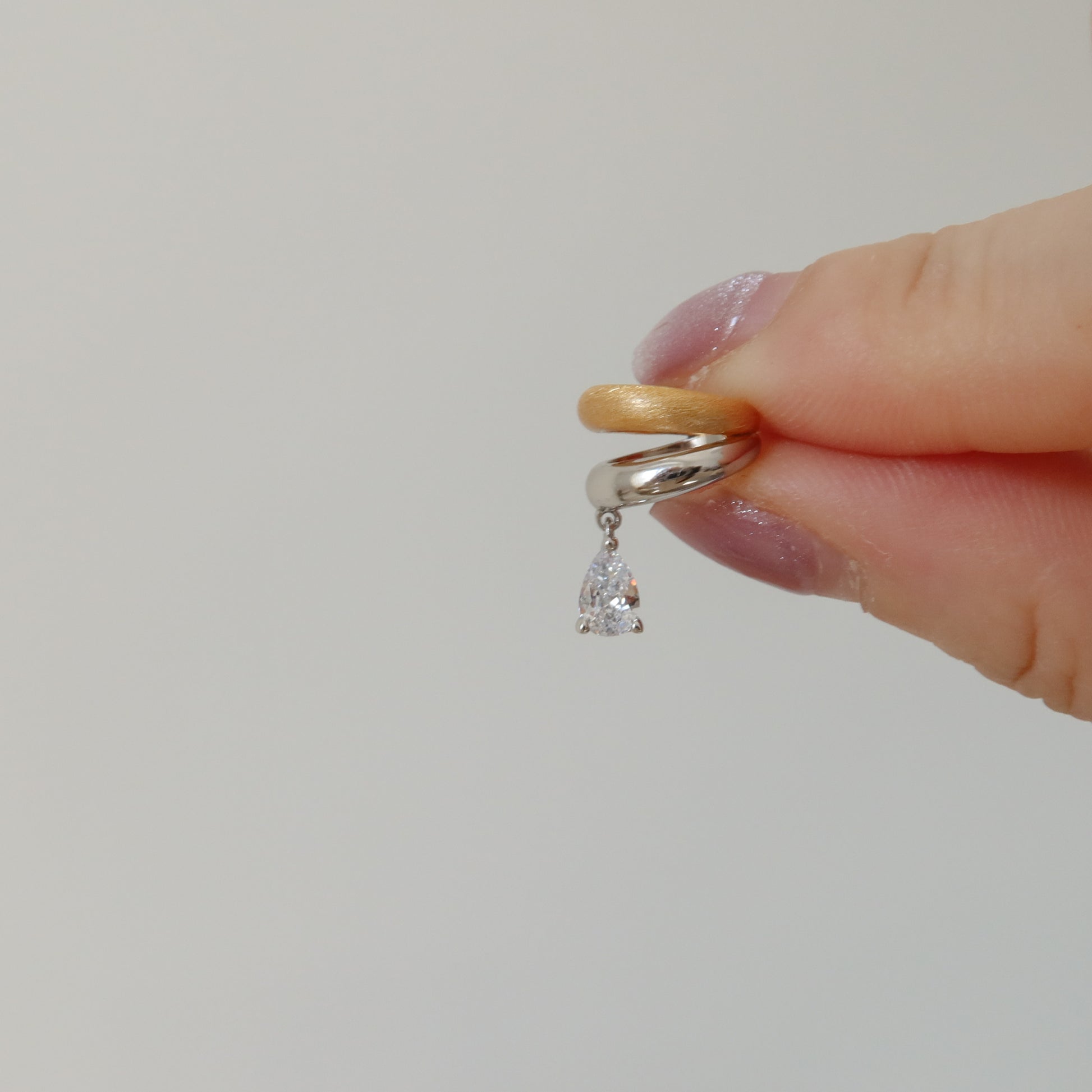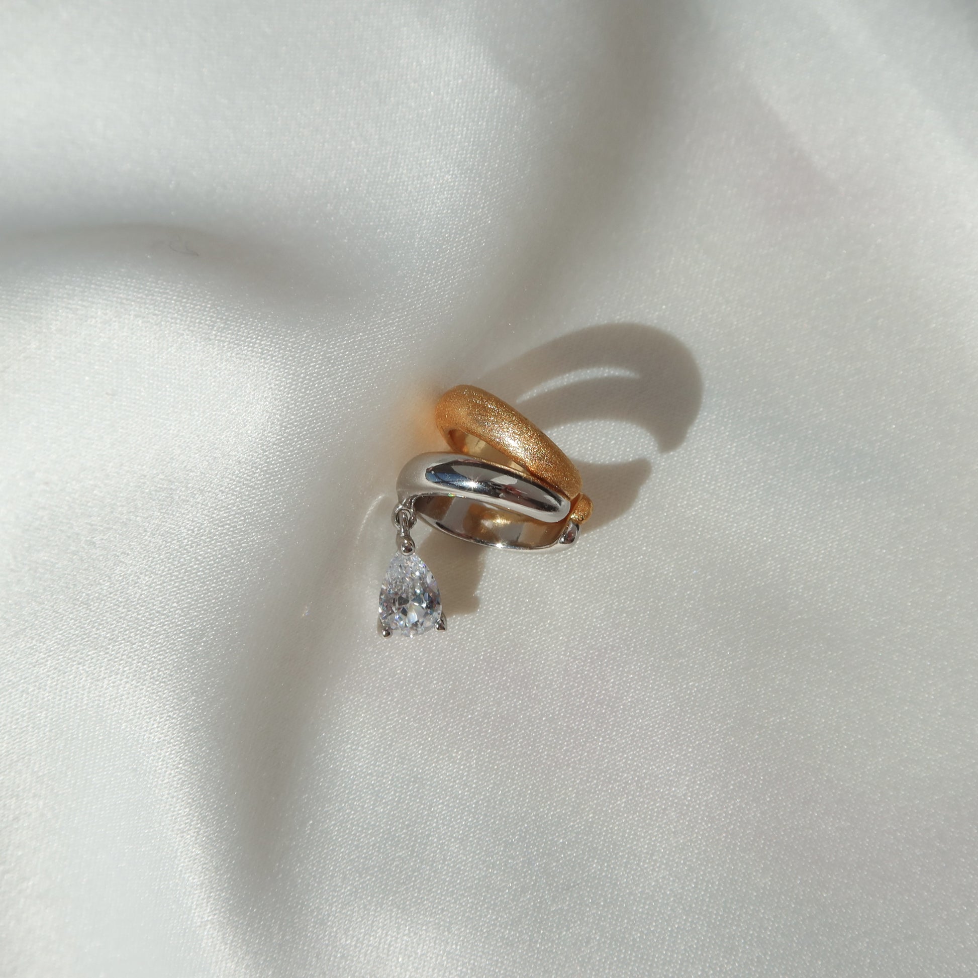 这款耳夹优雅精致,将金银元素与哑光和抛光纹理巧妙融合,打造出低调惊艳的造型。下方垂坠一颗水滴形方晶锆石,随心所欲地捕捉光芒。无需穿孔即可轻松佩戴,轻松提升您的造型,展现精致气质。